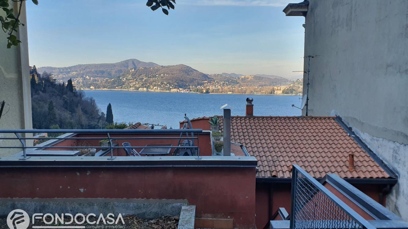 APPARTAMENTO ATTICO, con travi a vista, soggiorno con camino , cucina, due camere, due bagni, terrazzo con stupenda vista lago, giardino privato con locale hobby, cantina. Possibilità box.