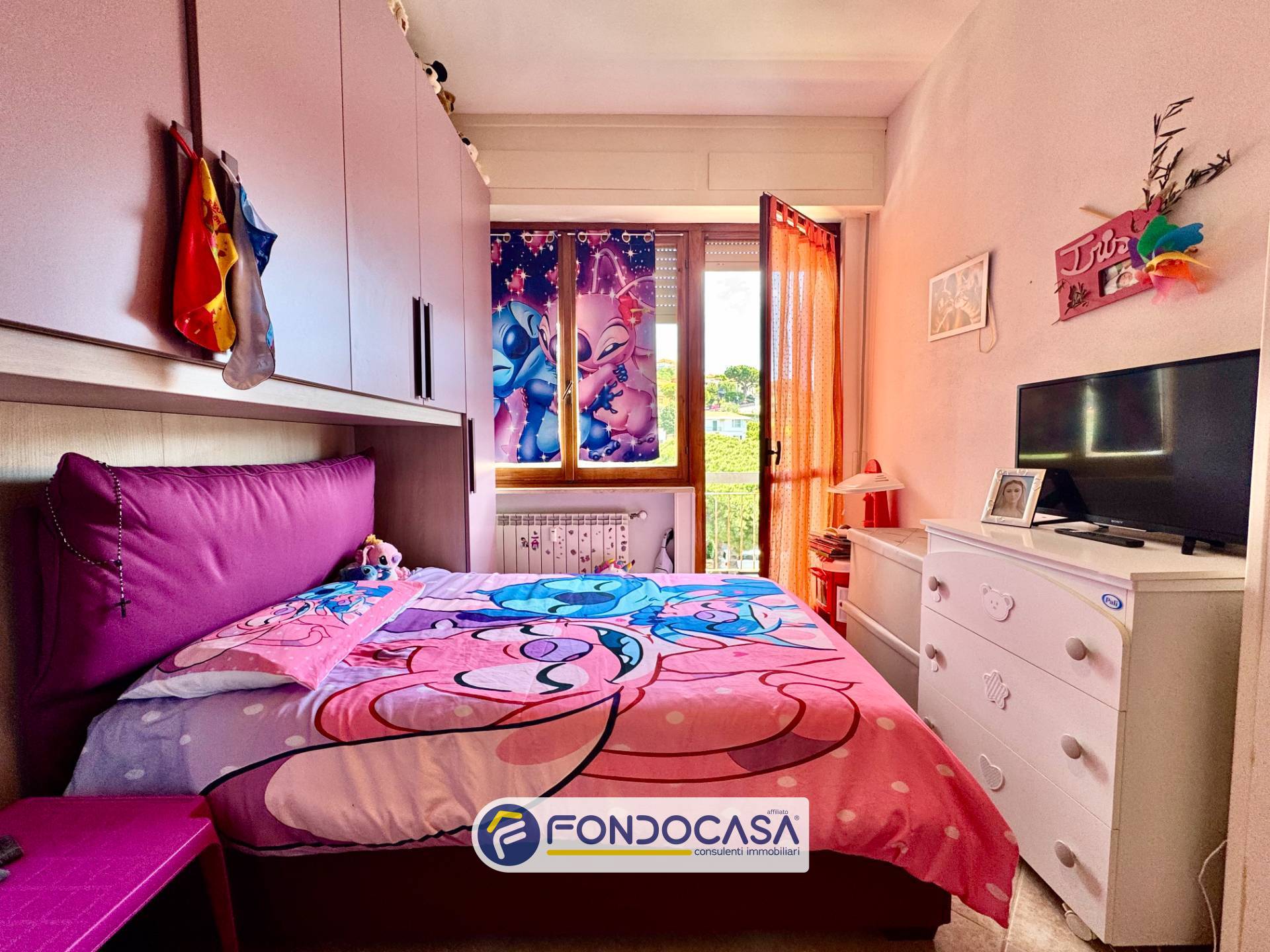 La zona notte è ben distribuita e comprende una camera matrimoniale, una cameretta con accesso diretto al balcone, ed un bagno finestrato con box doccia.
