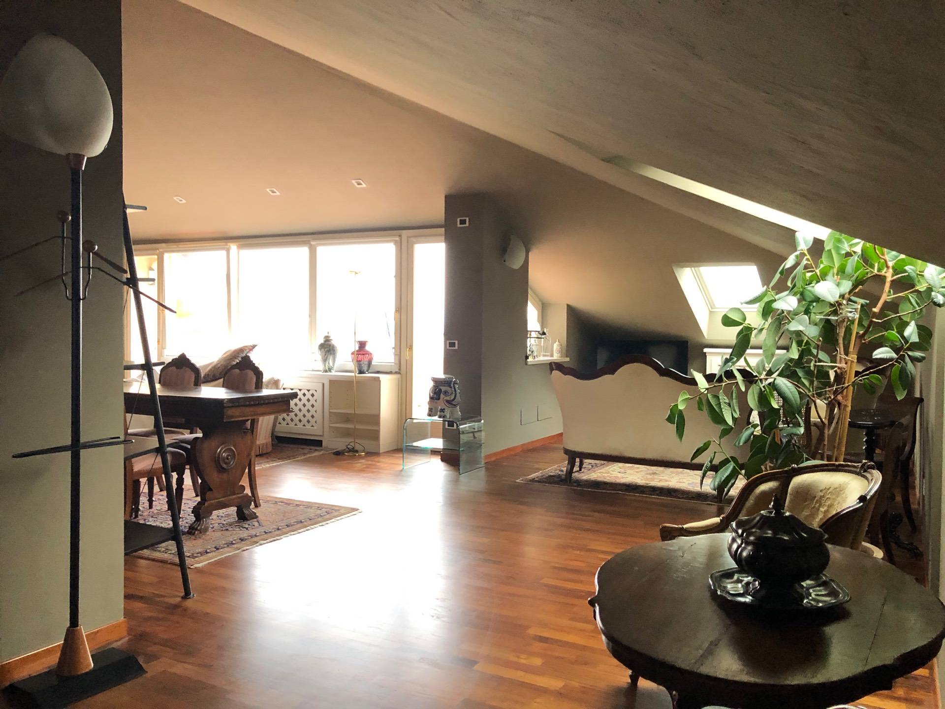 L'ingresso si apre sul soggiorno illuminato con la luce naturale del sole grazie alle ampie finestre che si affacciano sul terrazzo con vista mozzafiato del Belvedere, ideale per gustare i pasti all'aria aperta durante le stagioni calde. La zona giorno comunica con la spaziosa cucina ideale per chi ama cucinare, o semplicemente vuole muoversi comodamente senza aver spazi ristretti. Ci sono due camere da letto con armadi su misura, una con letto matrimoniale e bagno di pertinenza con vasca, mentre la seconda con letto a una piazza singola. Si aggiungono un altro bagno con doccia, una lavanderia con armadi e terrazzo. Tutti i locali dell'appartamento, ad eccezione della cucina e bagni hanno parquet color mogano.