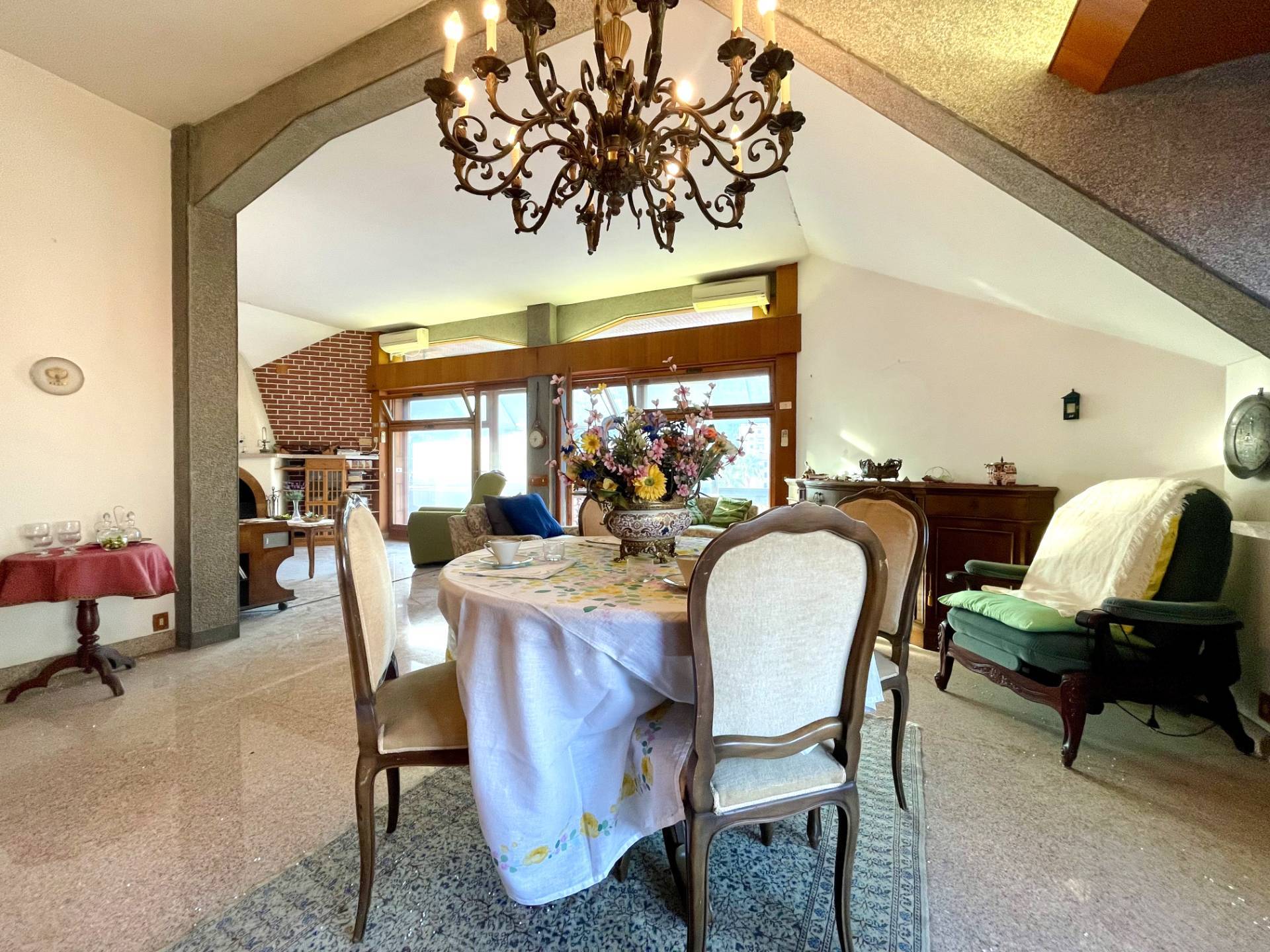 Appartamento di 150 mq caratterizzato da una zona giorno di 50 mq arricchita da un caminetto e da grandi vetrate splendenti sulla terrazza perimetrica. Le tre camere, i due bagni, il ripostiglio e la sala da pranzo costituiscono e completano la proprietà.
