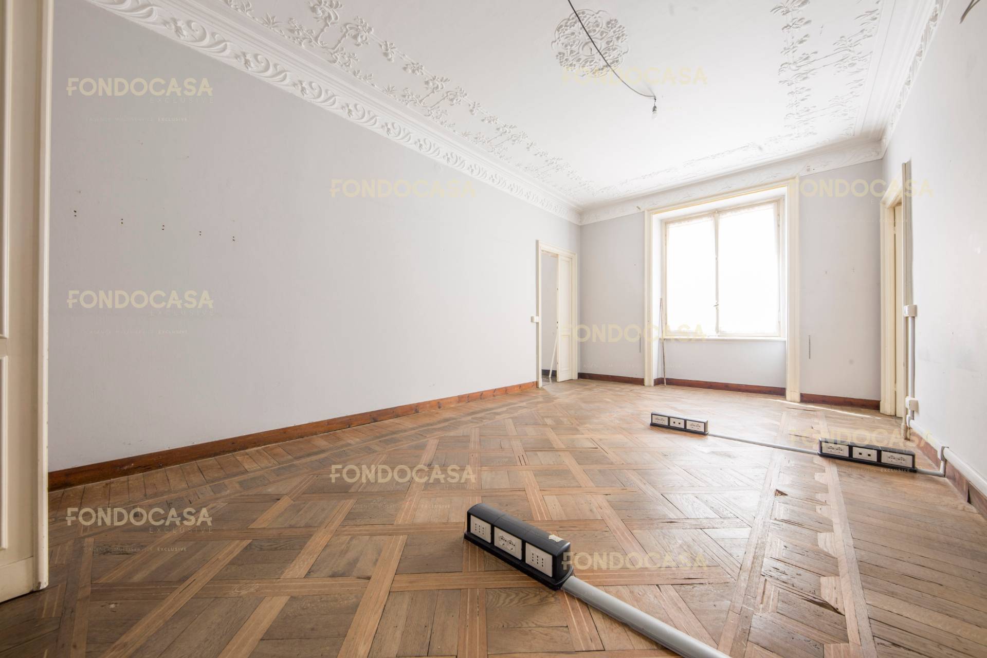 Ci troviamo al piano terra di questo palazzo dalle importanti facciate signorili, e l' ufficio, da ristrutturare, è così composto: ampio ingresso, dal quale spostandoci verso il lato ovest troviamo tre ampie stanze collegate tra loro, e rifinite con importanti stucchi sui soffitti.