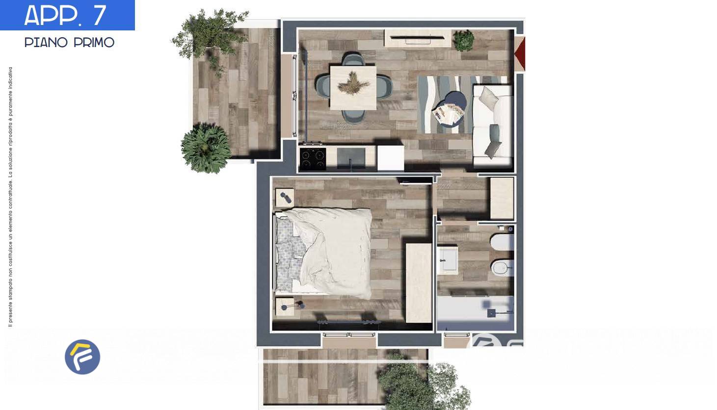 Il bilocale si trova al primo piano ed è composto da ingresso e soggiorno con cucina a vista, una camera matrimoniale ed un bagno con finestra.