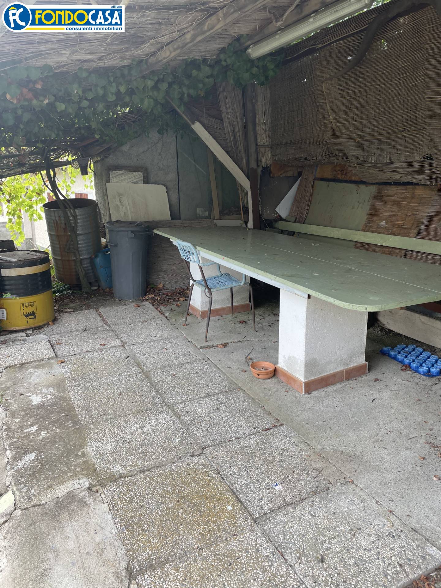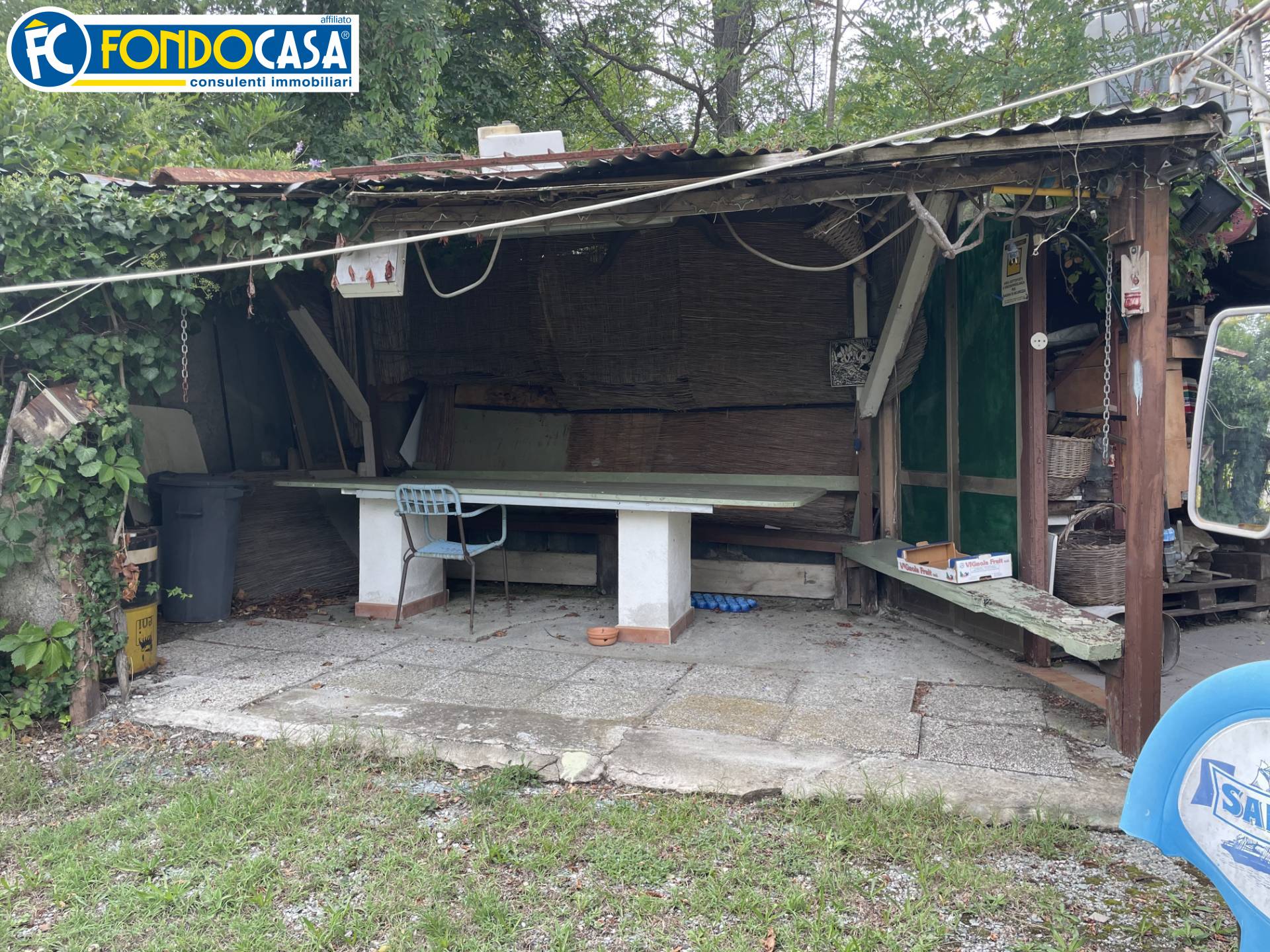 La parte esterna comprende un giardino adiacente alla casa e una zona pranzo coperta con forno.