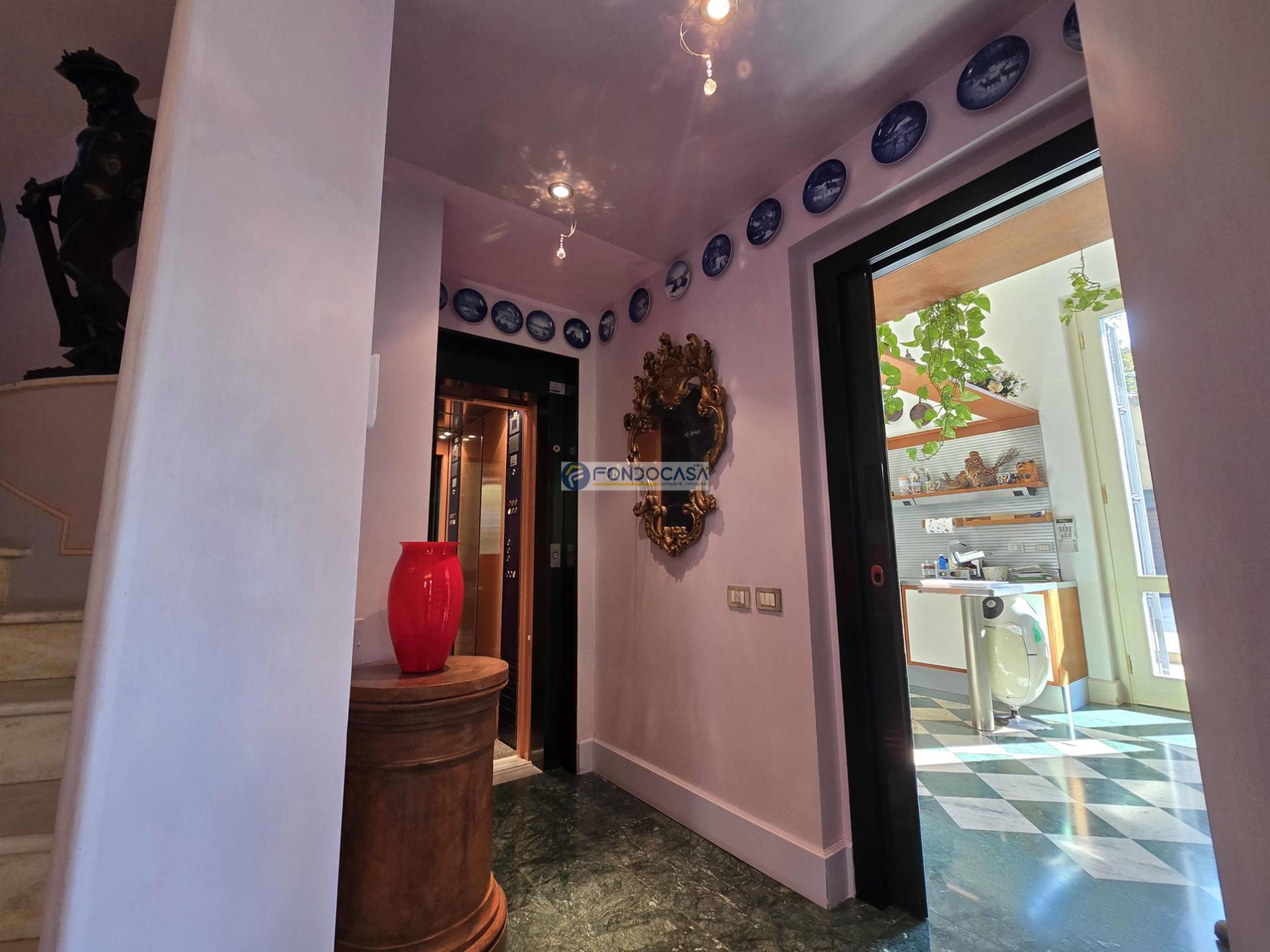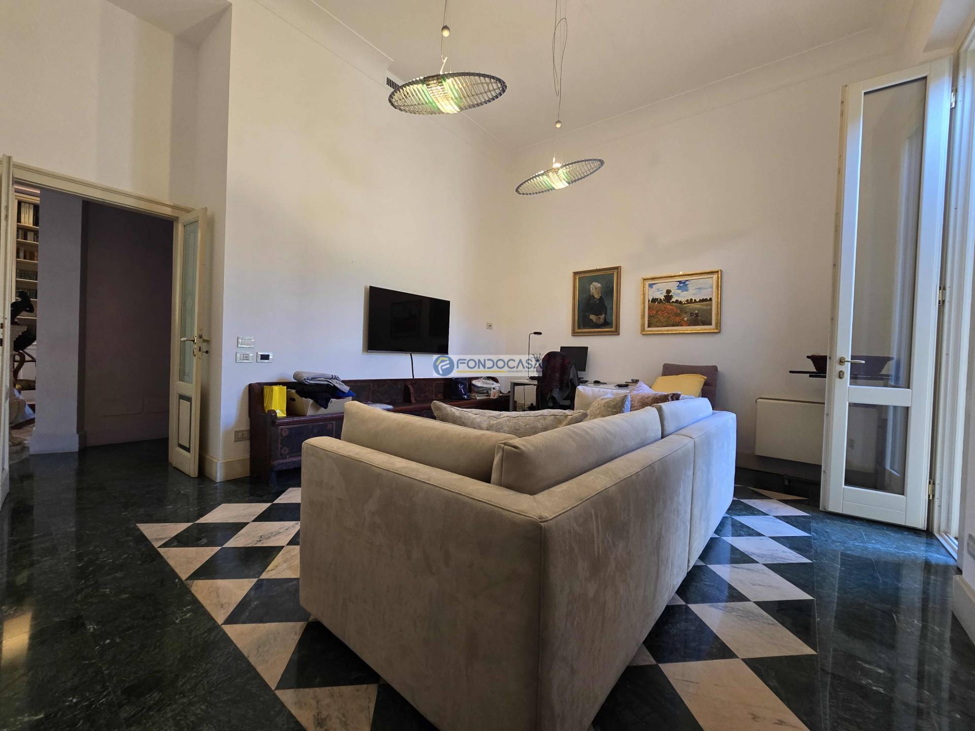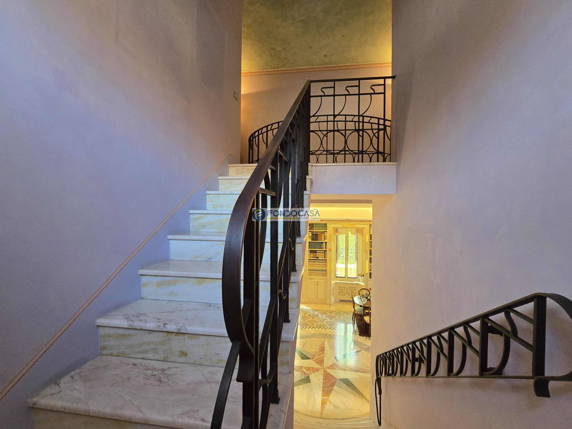 L'ingresso principale, imponente e maestoso, introduce nell'ampio e luminoso soggiorno impreziosito da marmi di assoluto pregio, perfetto per accogliere ospiti e familiari in momenti di convivialità; la zona living prosegue con un´accogliente e generosa cucina con sala da pranzo con piacevolissimo sfogo verso l´esterno.