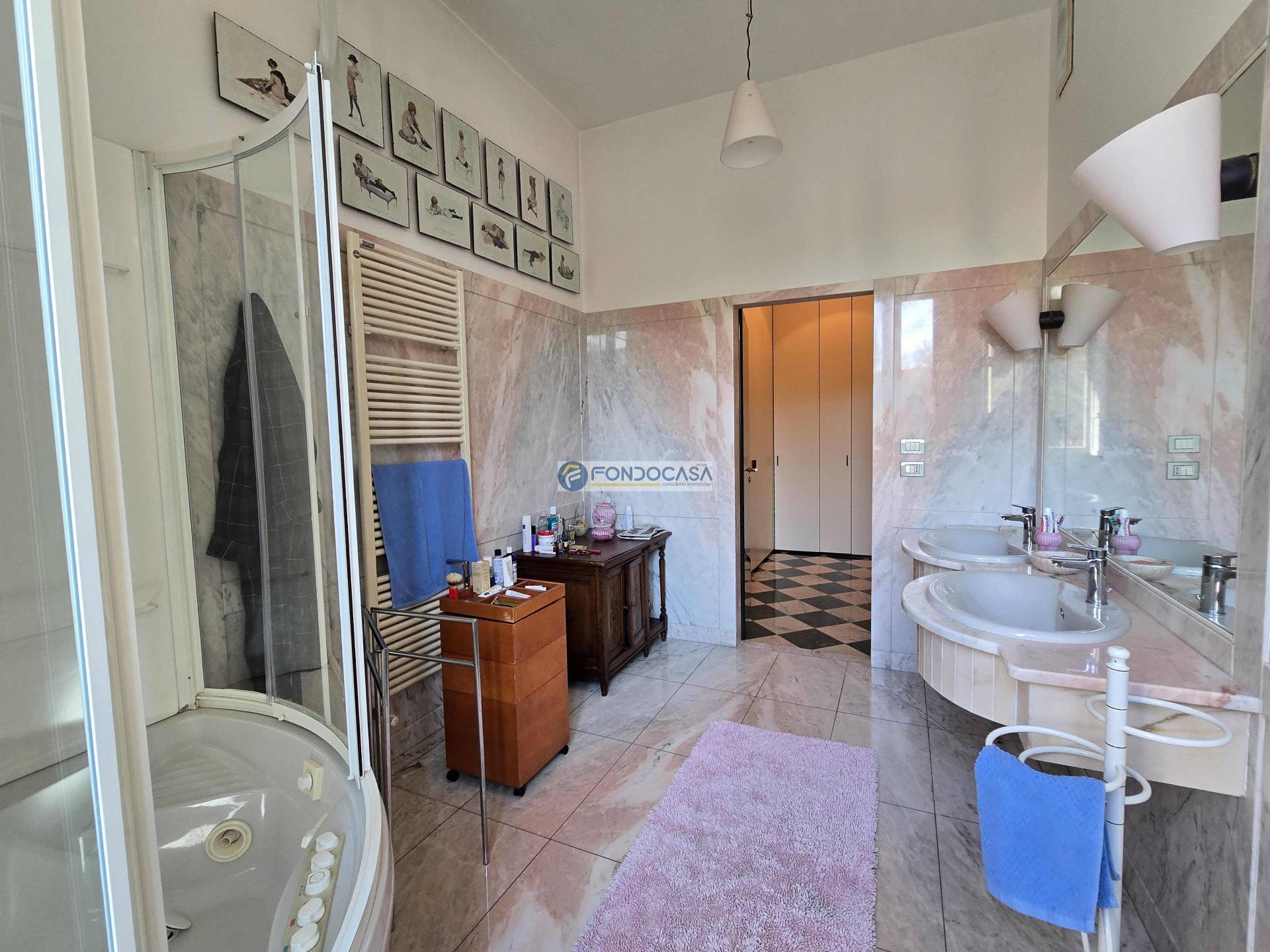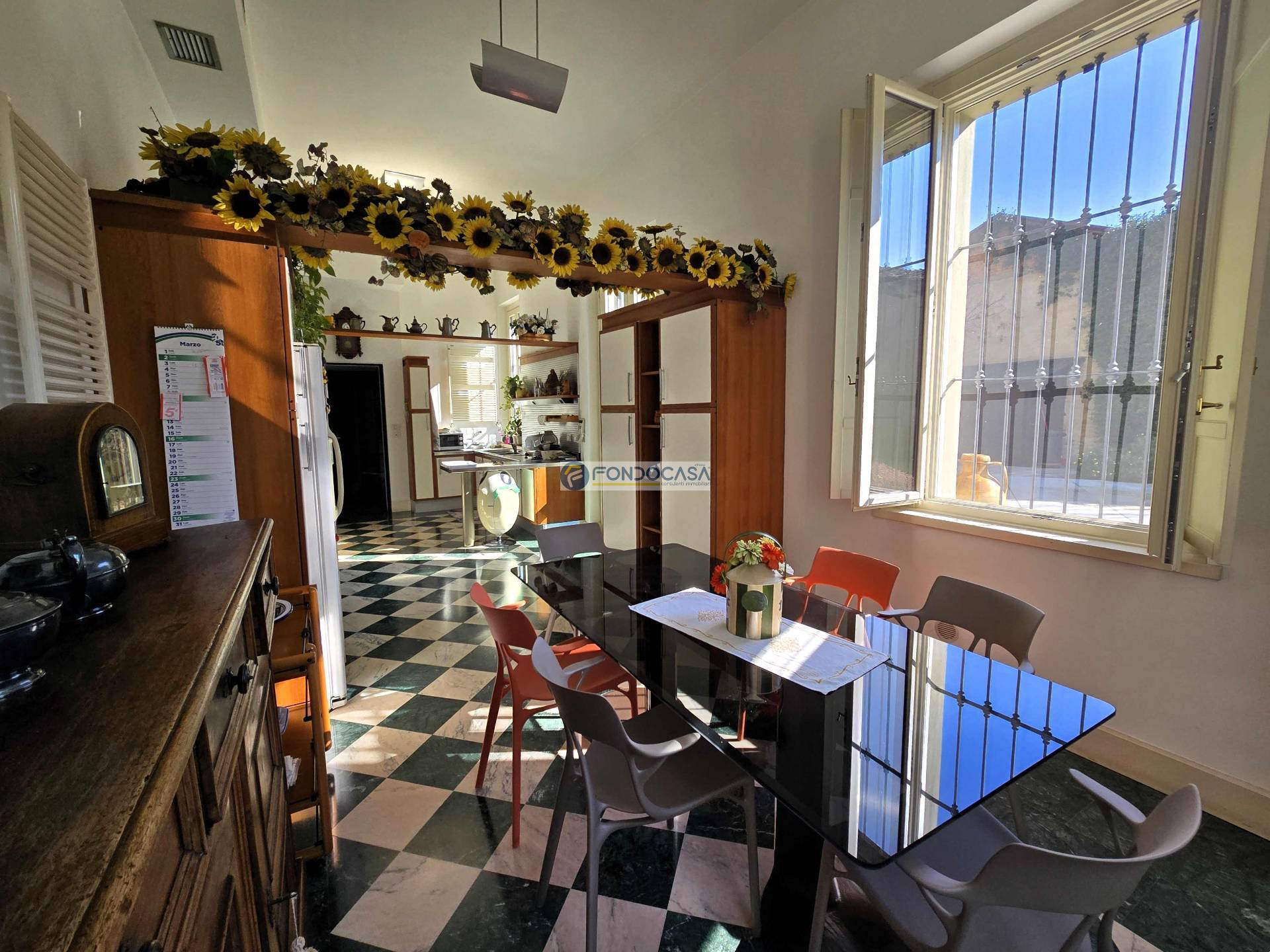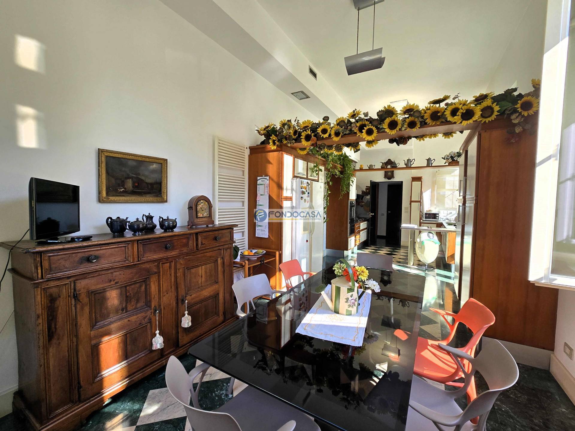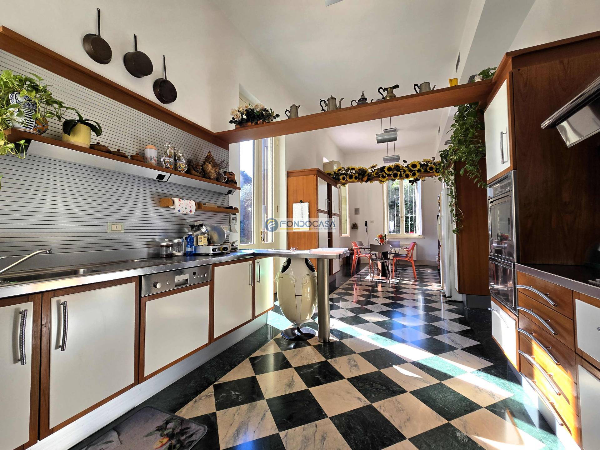 L'ingresso principale, imponente e maestoso, introduce nell'ampio e luminoso soggiorno impreziosito da marmi di assoluto pregio, perfetto per accogliere ospiti e familiari in momenti di convivialità; la zona living prosegue con un´accogliente e generosa cucina con sala da pranzo con piacevolissimo sfogo verso l´esterno.