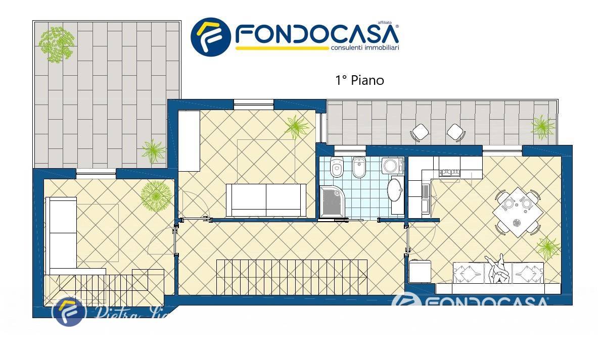 Entrando dal piano terra una comoda scala in muratura ci accompagna al primo piano dove si sviluppa la parta principale della proprietà, composta da soggiorno con cucina a vista e balconata privata, salotto con ampia terrazza dalla vista aperta e con un prezioso scorcio di mare, camera da letto, bagno con doccia e finestra, ripostiglio.