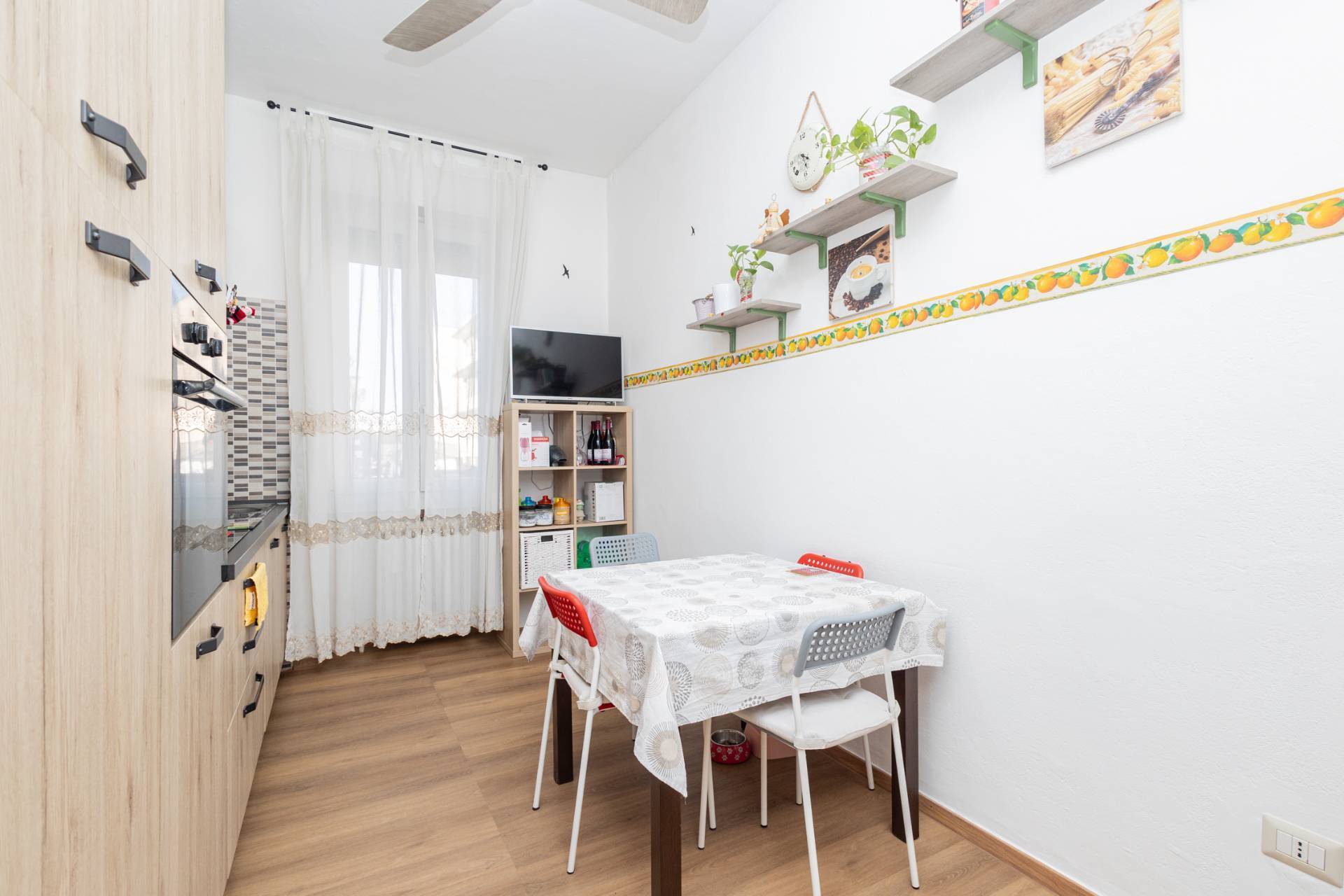 La soluzione sita ad un piano rialzato, con ingresso indipendente, risulta così composta: ingresso, soggiorno con cucina a vista, disimpegno, 2 camere e bagno finestrato con box doccia.