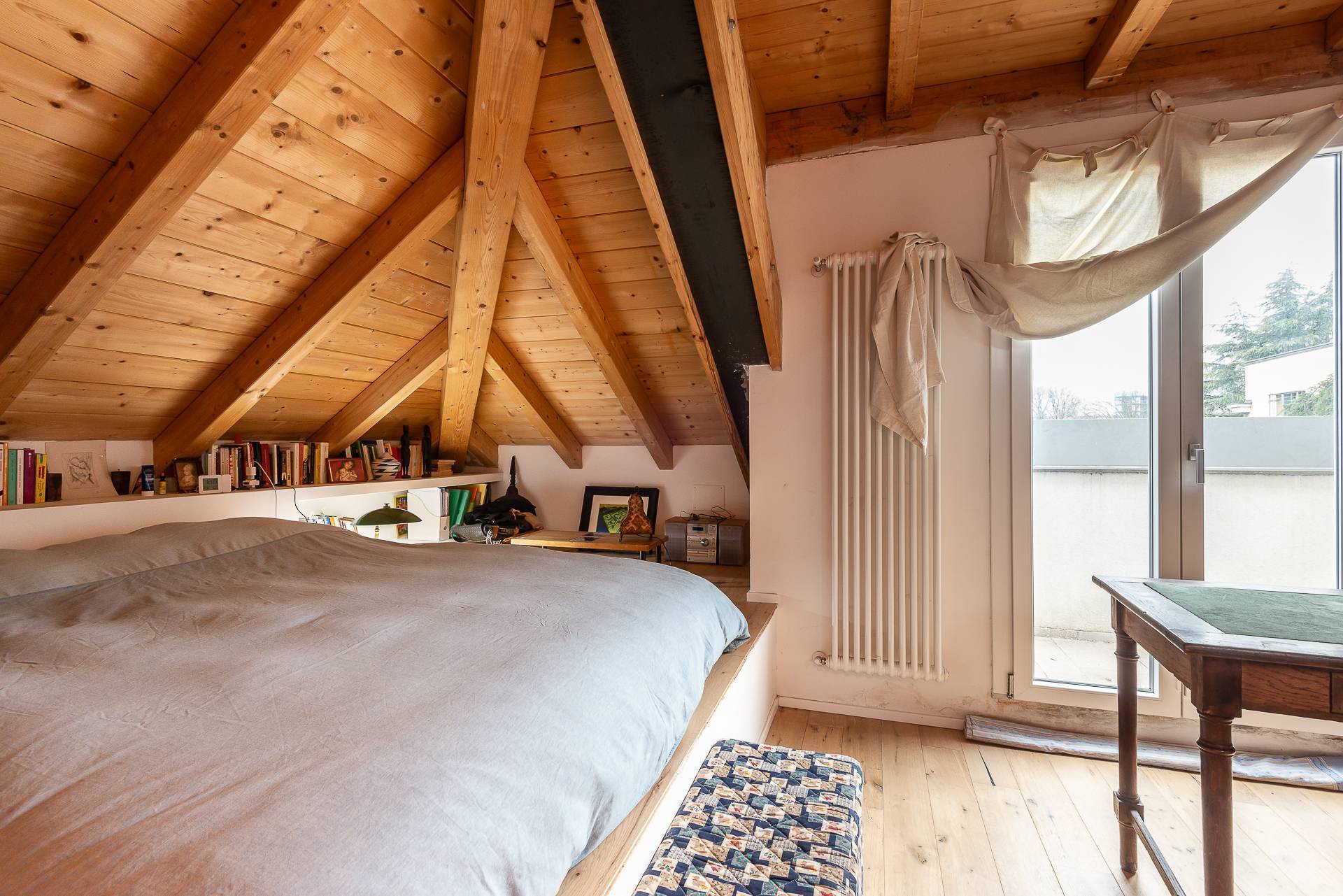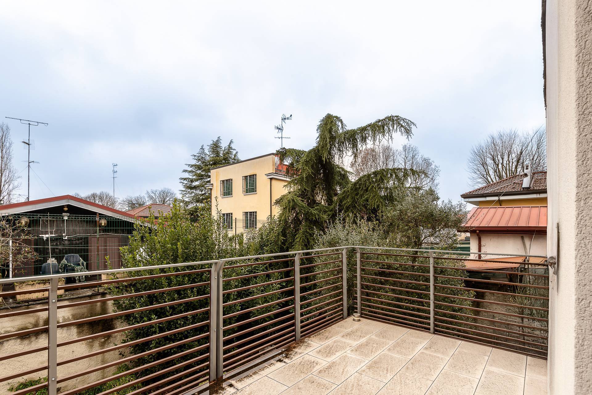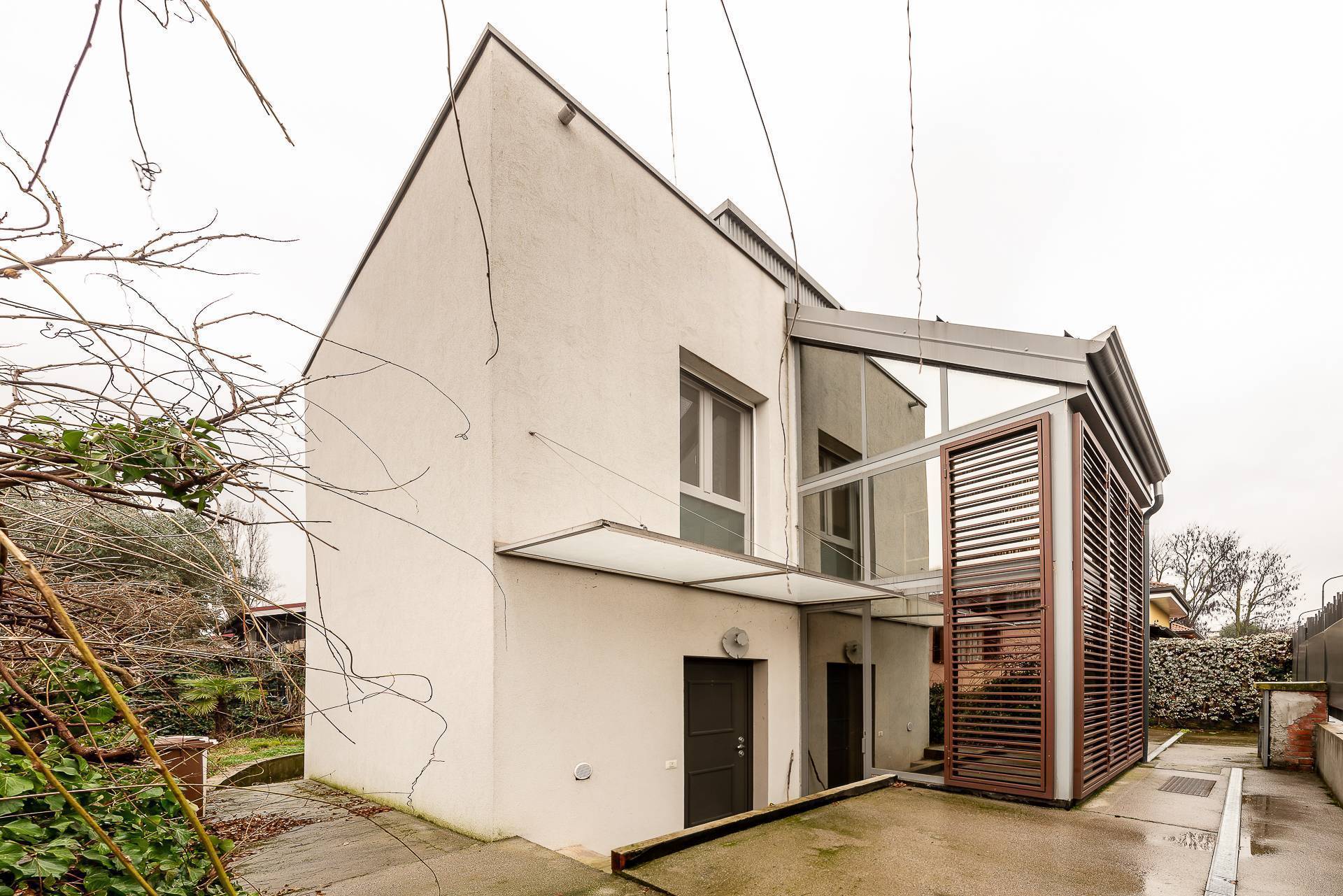 La soluzione proposta si sviluppa su tre livelli: ingresso al piano terra su ampio salone con vetrate direttamente sul giardino privato, cucina abitabile e servizio; collegato da un'elegante scala interna, al piano superiore si trovano 3 camere da letto , di cui una con cabina armadio, e due ulteriori finestrati, uno con doccia e l'altro con vasca. Al piano mansardato troviamo uno studio verandato e una comoda camera con accesso al balcone.