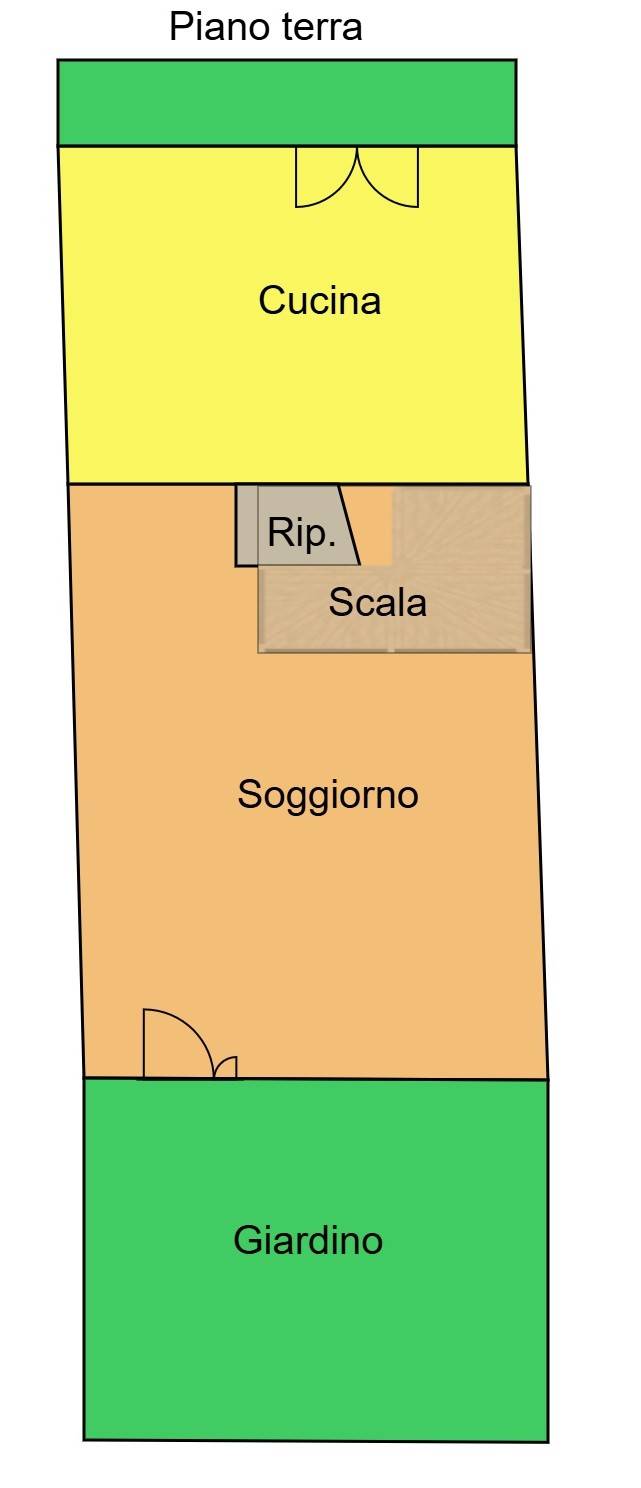 - Piano terra: ingresso su soggiorno luminoso, cucina abitabile con accesso diretto sul retro, ripostiglio comodo e funzionale.