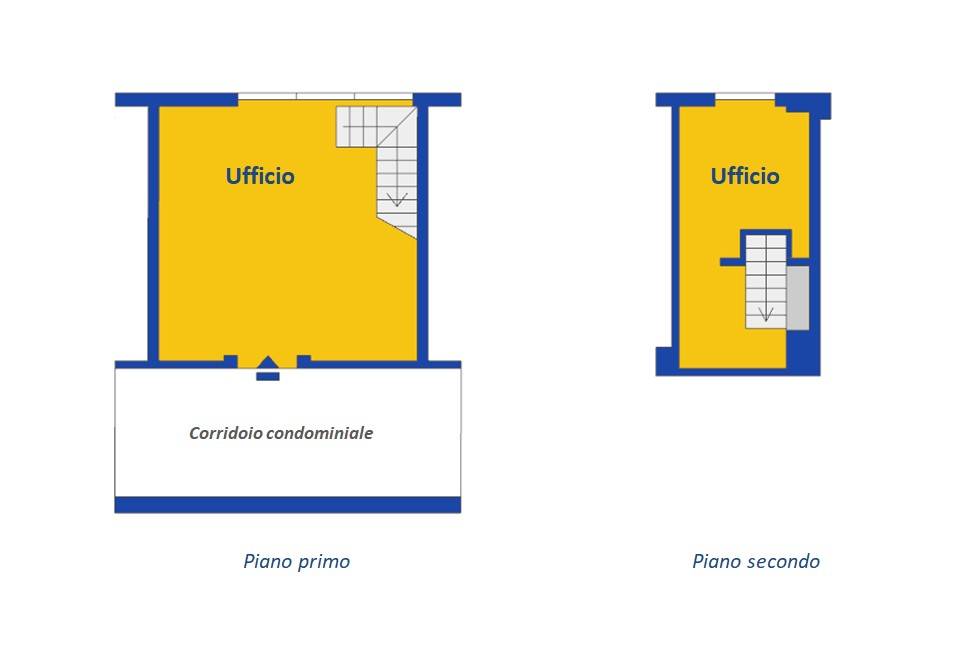 Ufficio su due livelli per un totale di mq. 92 catastali, composto da ingresso in ampio vano con triple finestre in doppio vetro pvc ed esposizione sud-est.