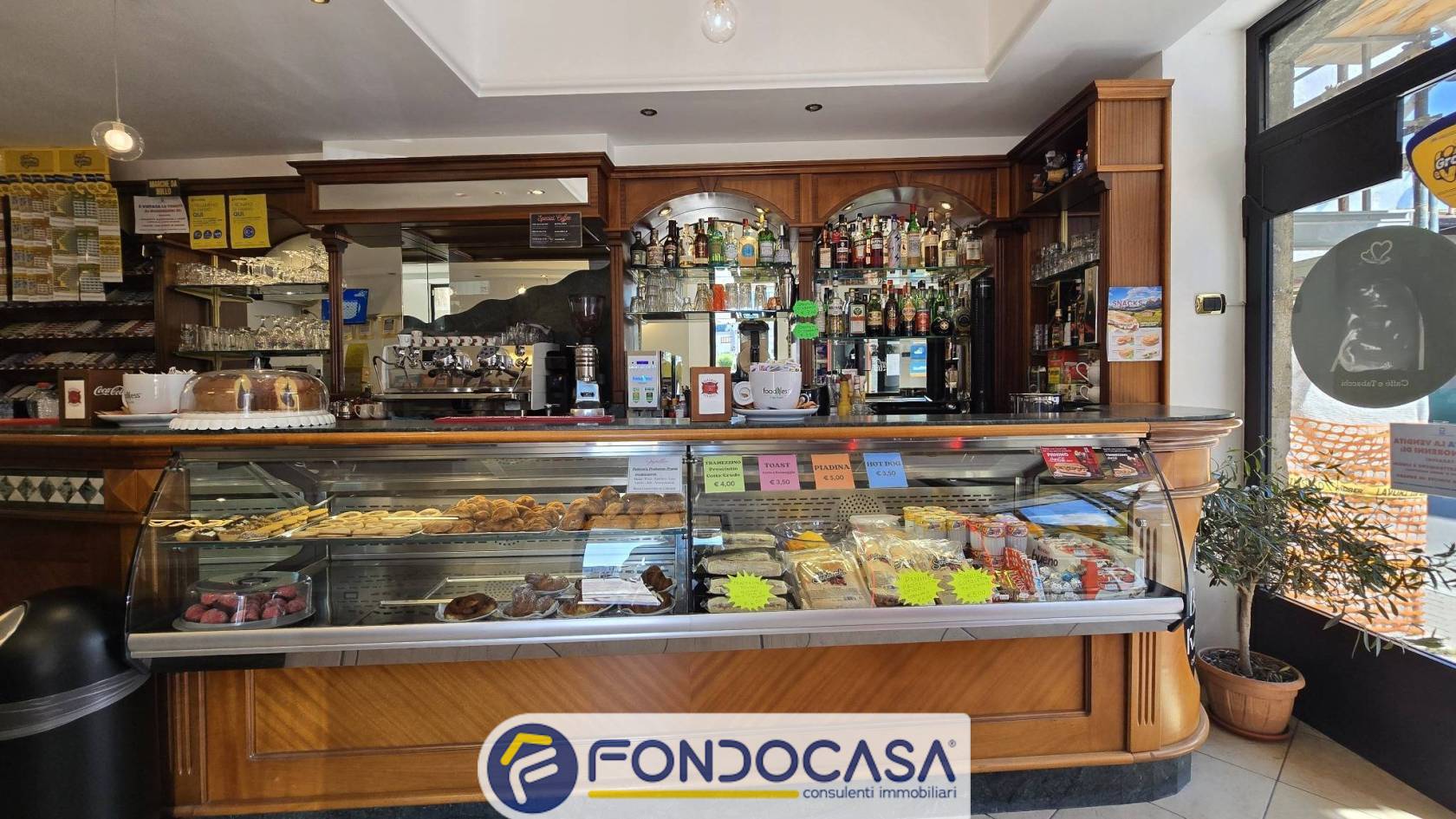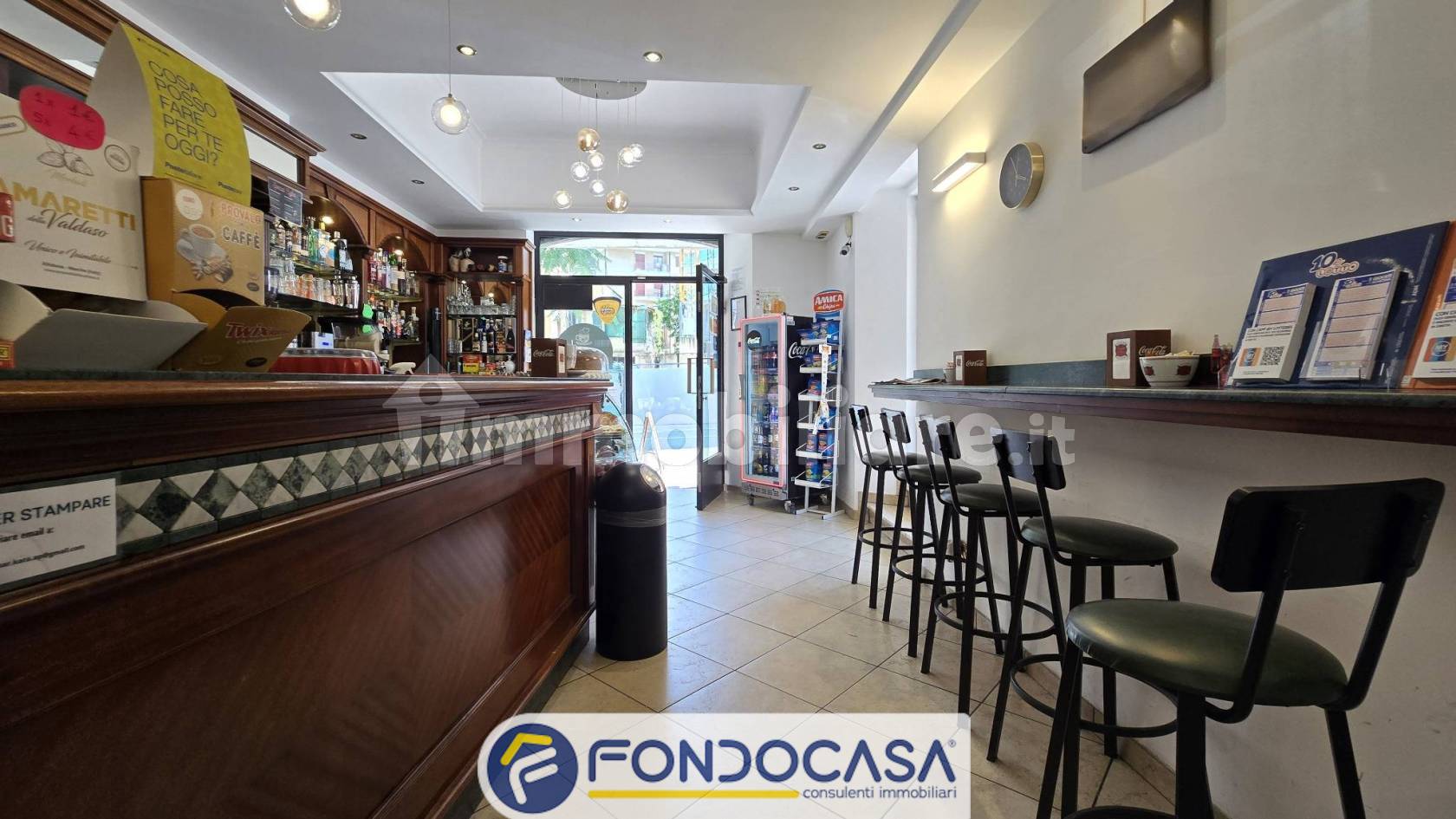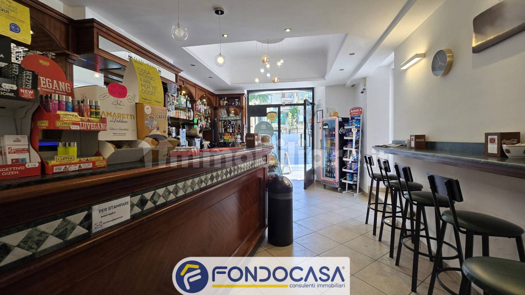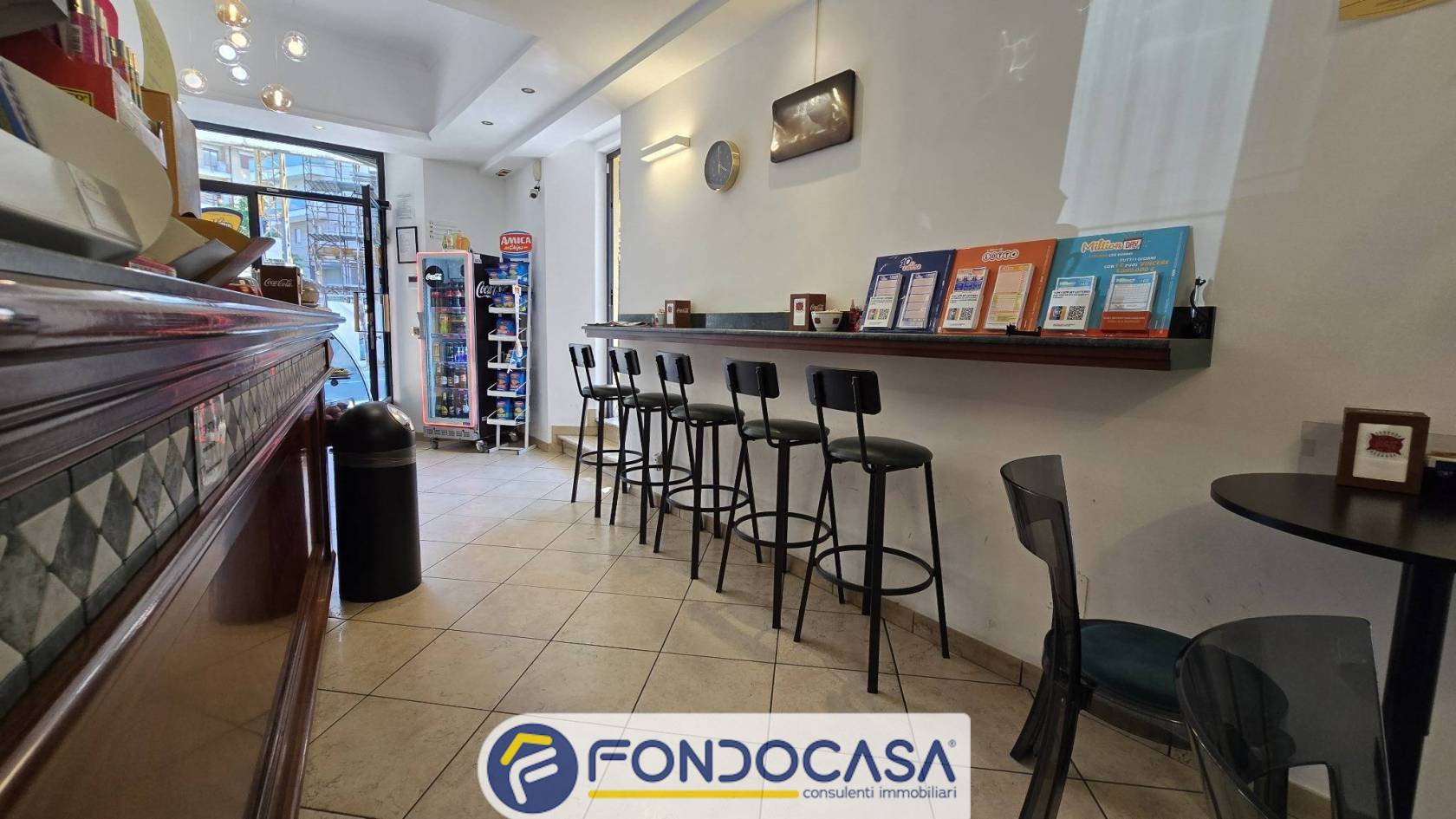 L'attività si estende su due livelli, così suddivisi: al piano Terra si sviluppa il Bar con annessa zona Tabacchi, un disimpegno e un bagno finestrato con inferriate; al piano S1 troviamo, invece, un locale ad uso di deposito, un anti-bagno e un bagno.
