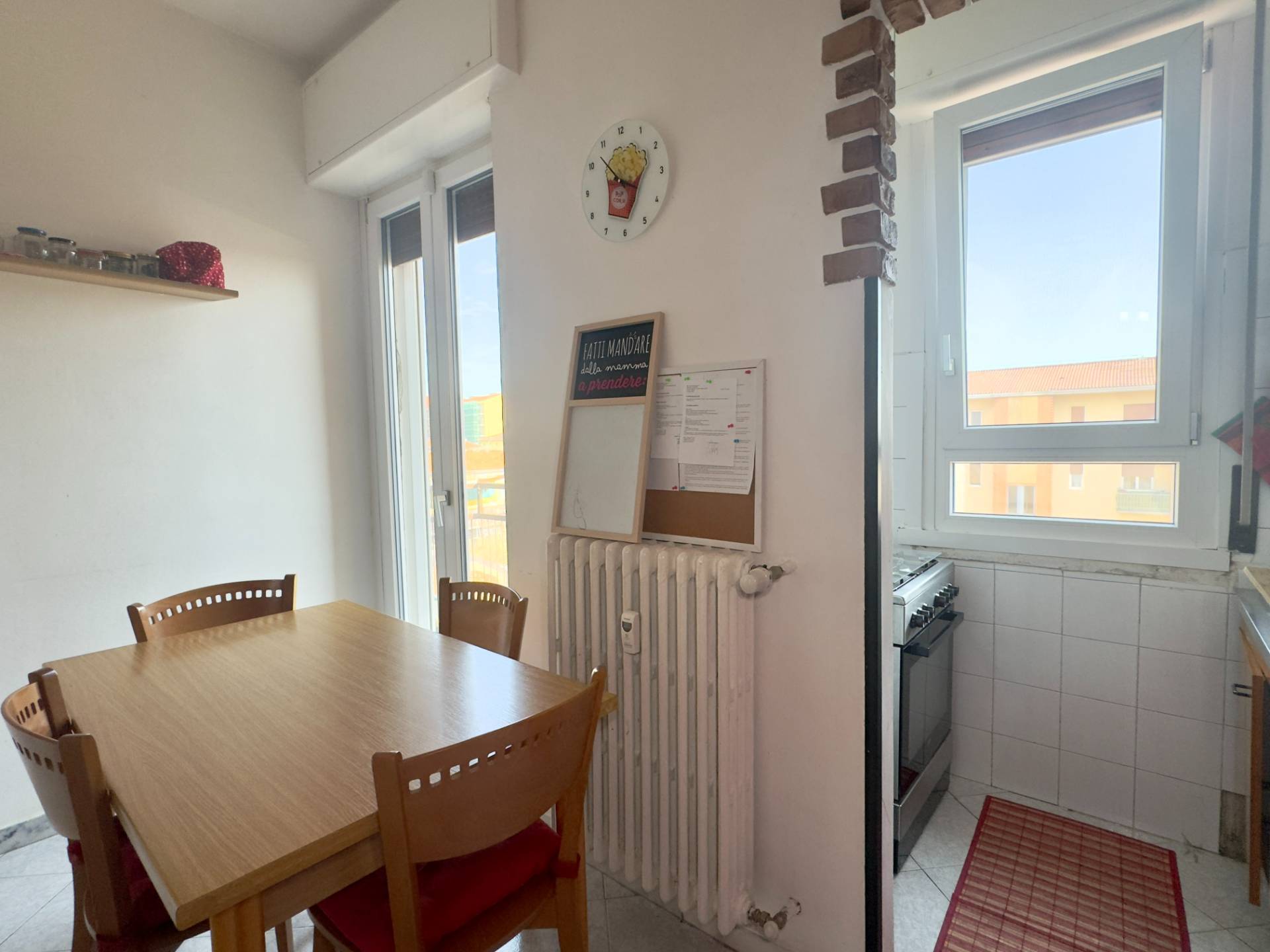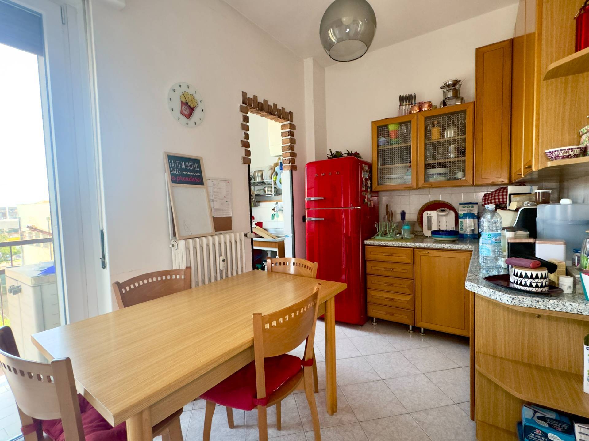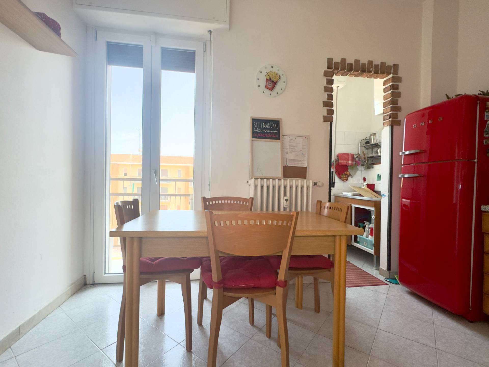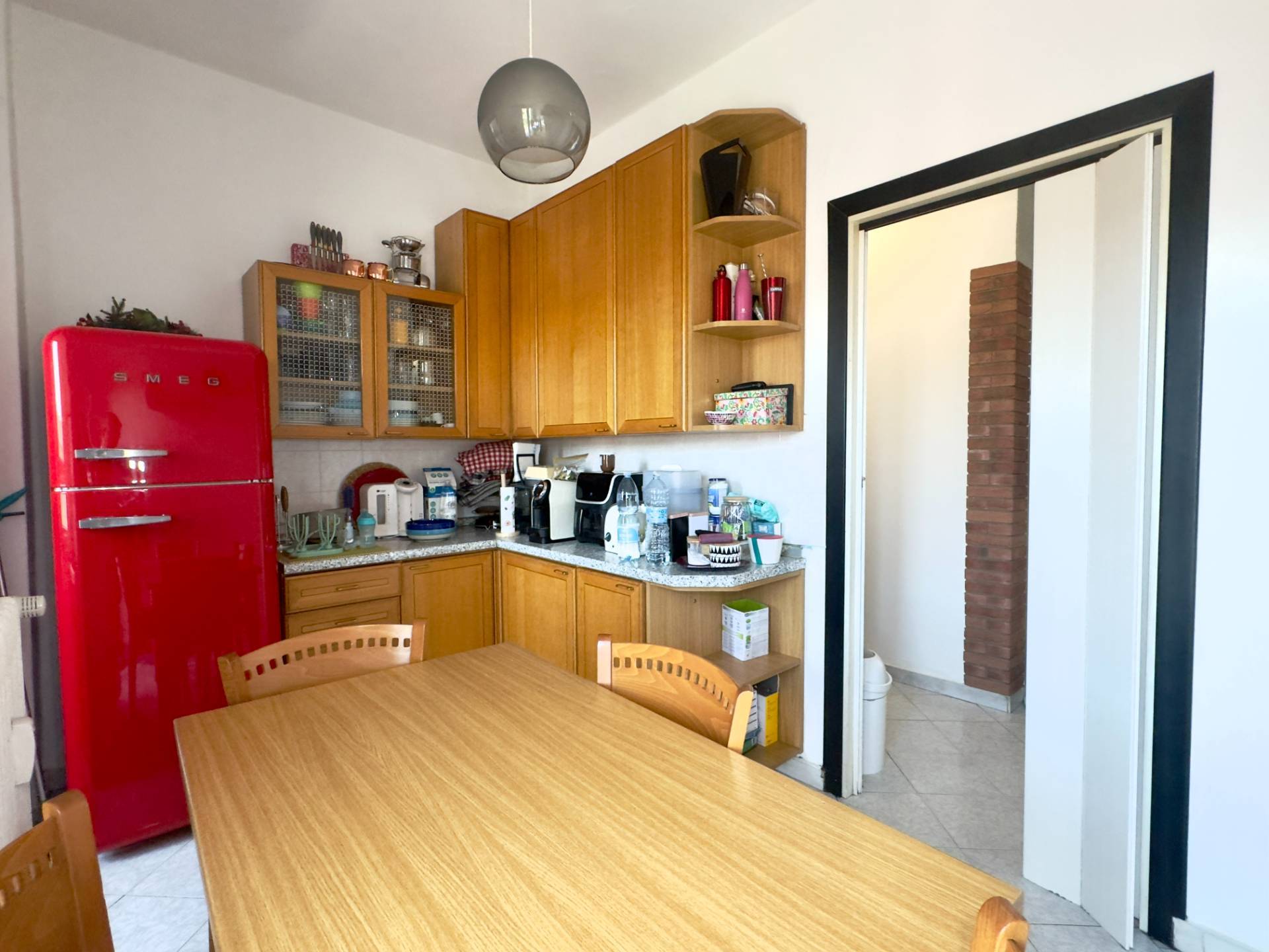 L´abitazione è attualmente divisa da un lungo disimpegno che collega i vari ambienti, entrando sulla destra troviamo il cuore della casa, il soggiorno, ampio e lineare dotato di un balcone con affaccio esterno. Proseguendo abbiamo la cucina abitabile composta da due spazi collegati, un piccolo angolo cottura e la zona pranzo più ampia, dotata anch´essa di un balcone con affaccio interno, adiacente abbiamo la spaziosa e luminosa camera da letto ed infine il bagno finestrato, dotato di vasca e cabina doccia.