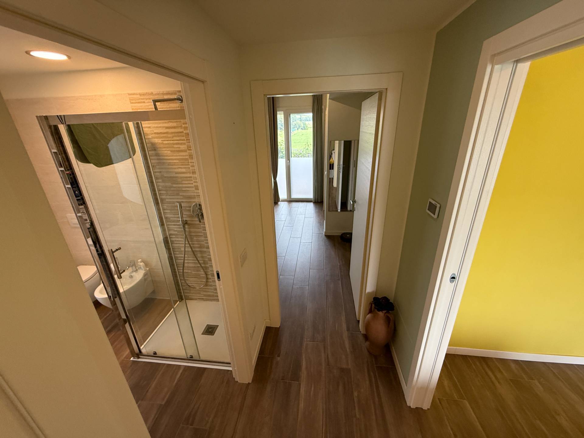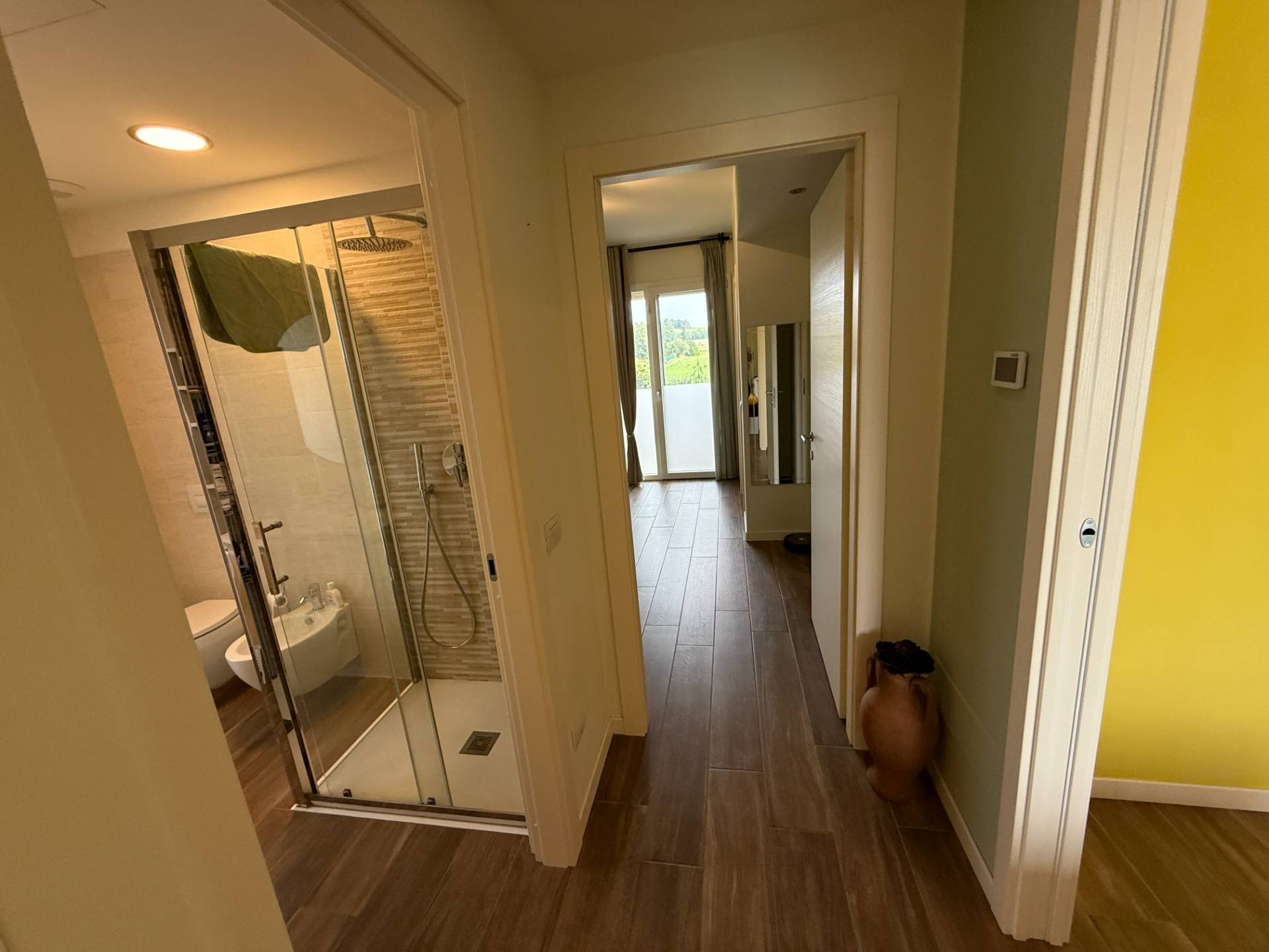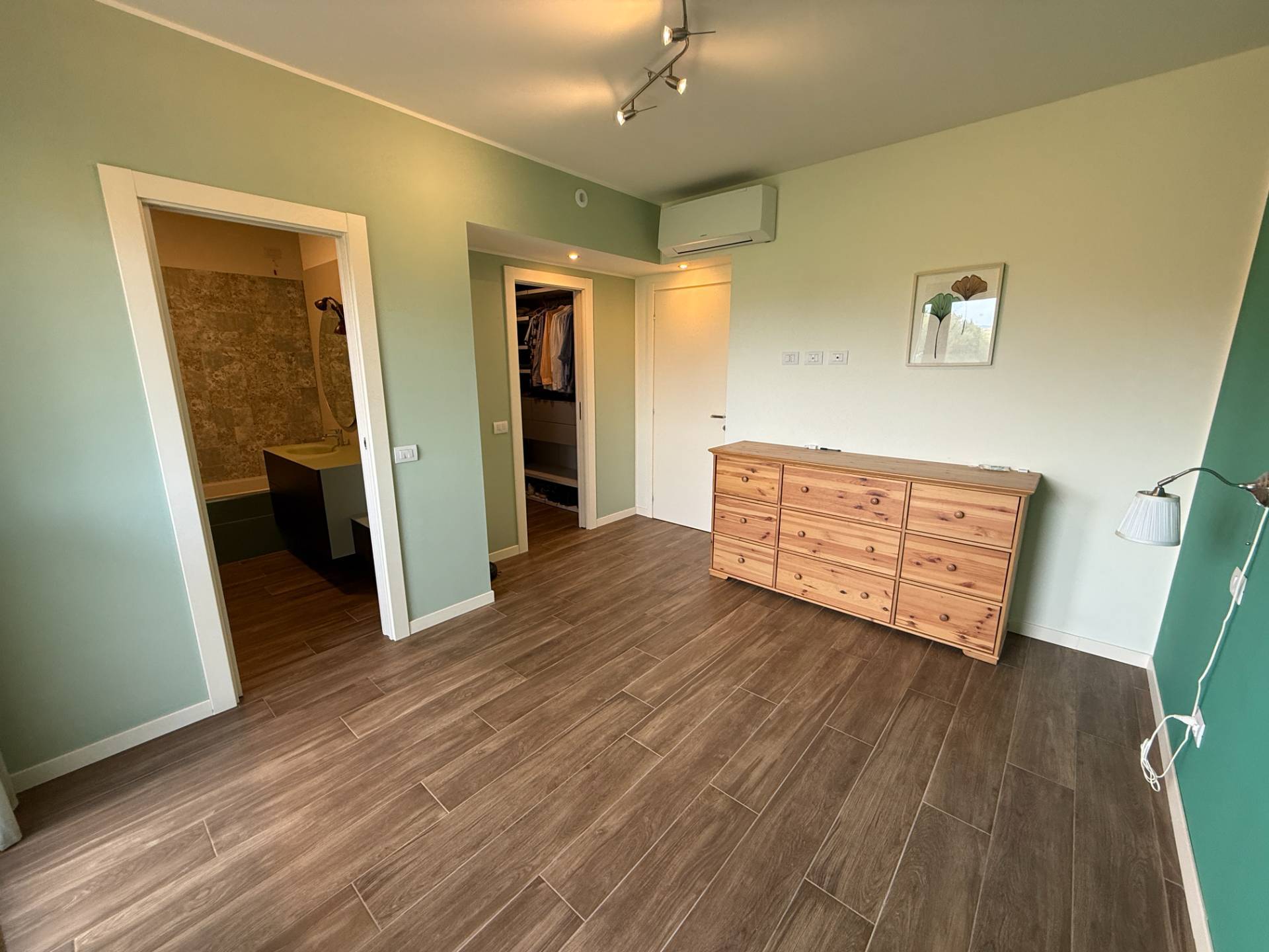 ingresso su ampio soggiorno, cucina abitabile con uscita su terrazzo, disimpegno notte dove troviamo camera, bagno padronale con doccia e sanitari sospesi, camera matrimoniale con ampia cabina armadio e bagno personale in camera.