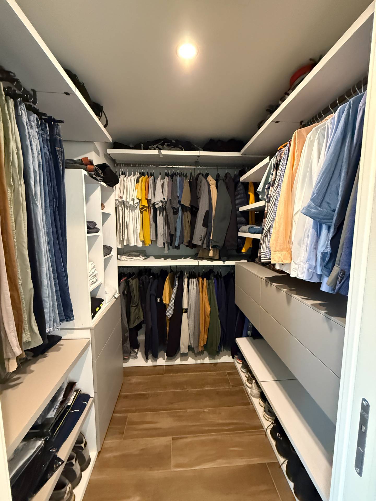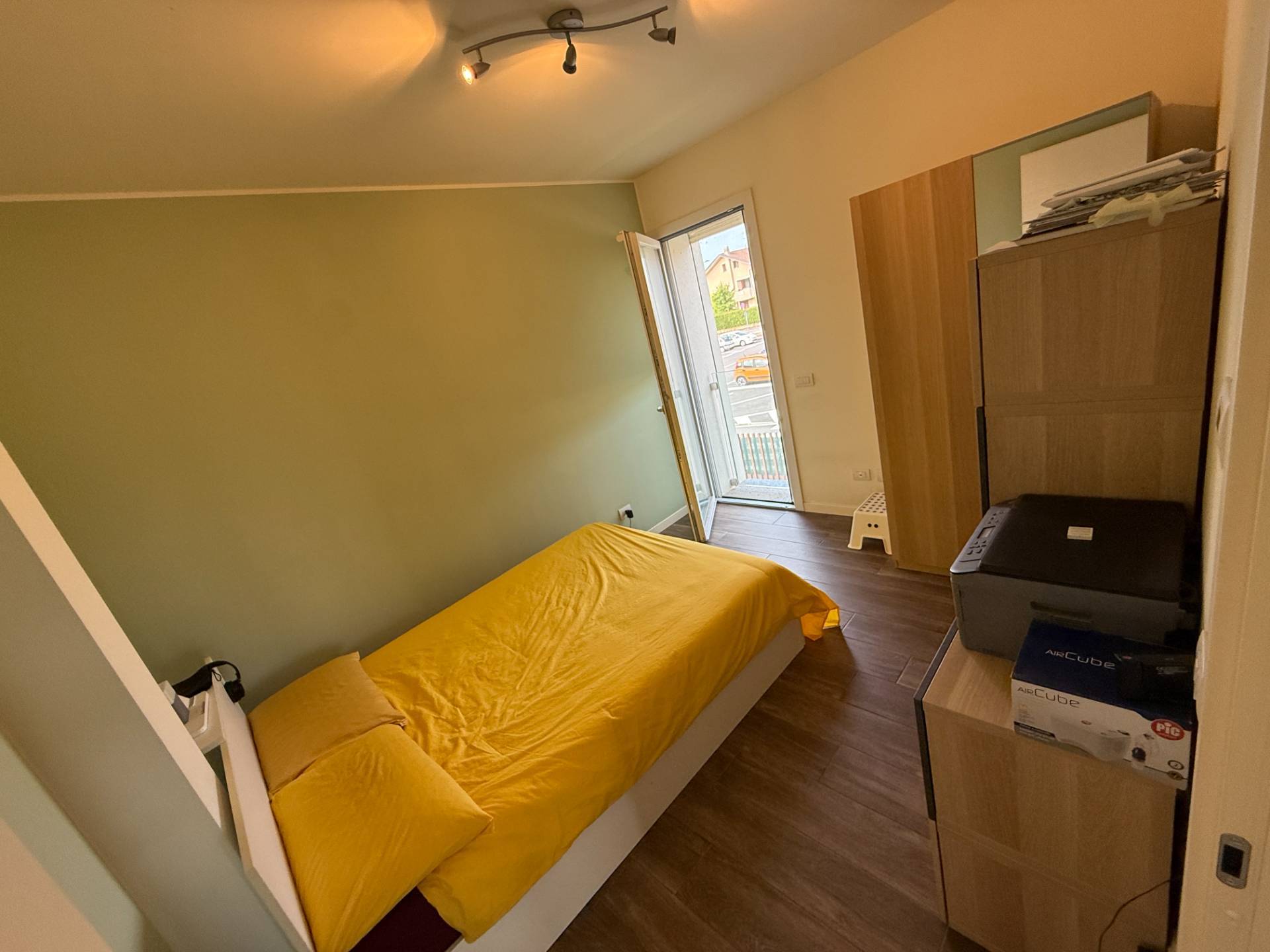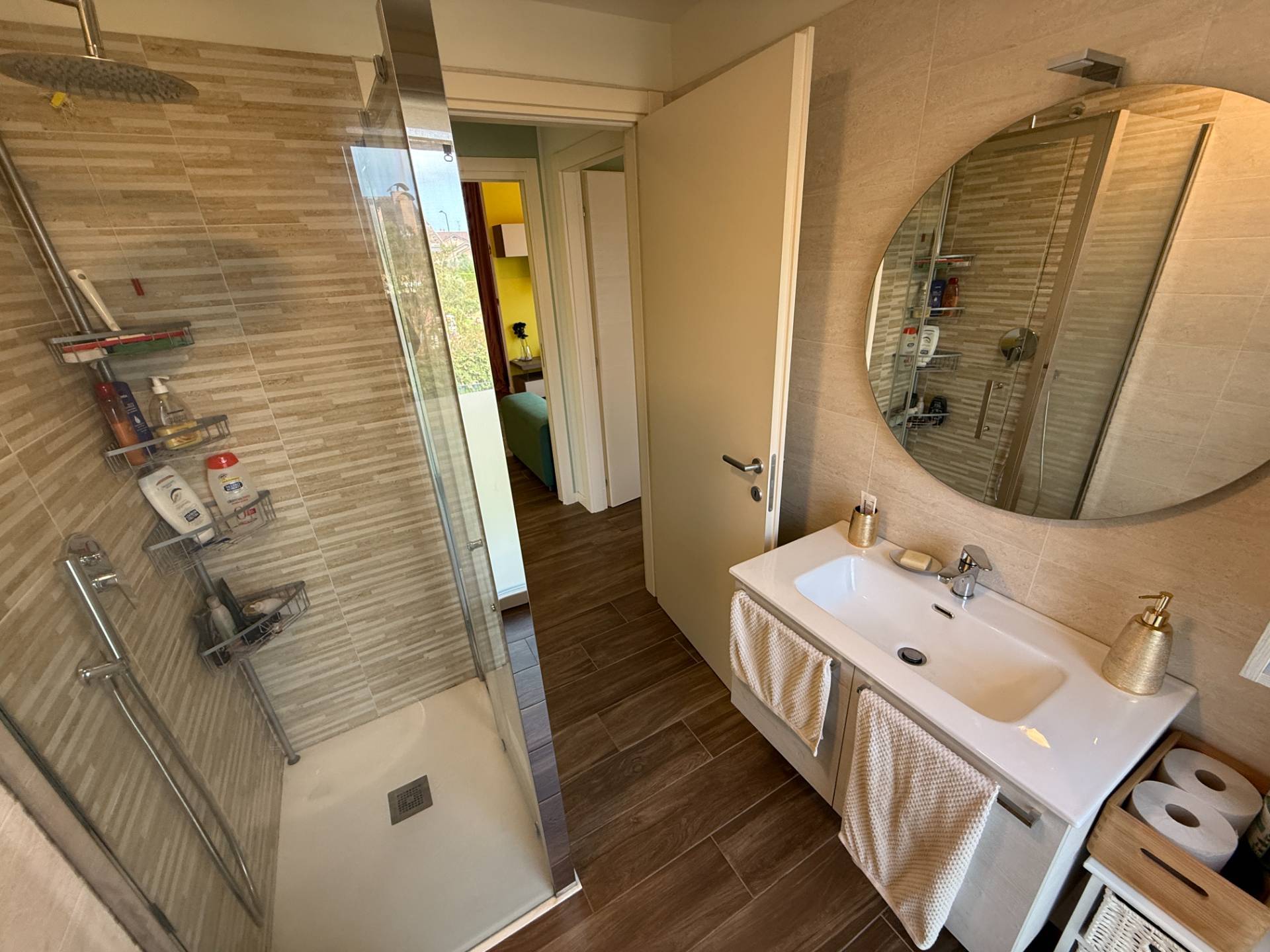 ingresso su ampio soggiorno, cucina abitabile con uscita su terrazzo, disimpegno notte dove troviamo camera, bagno padronale con doccia e sanitari sospesi, camera matrimoniale con ampia cabina armadio e bagno personale in camera.