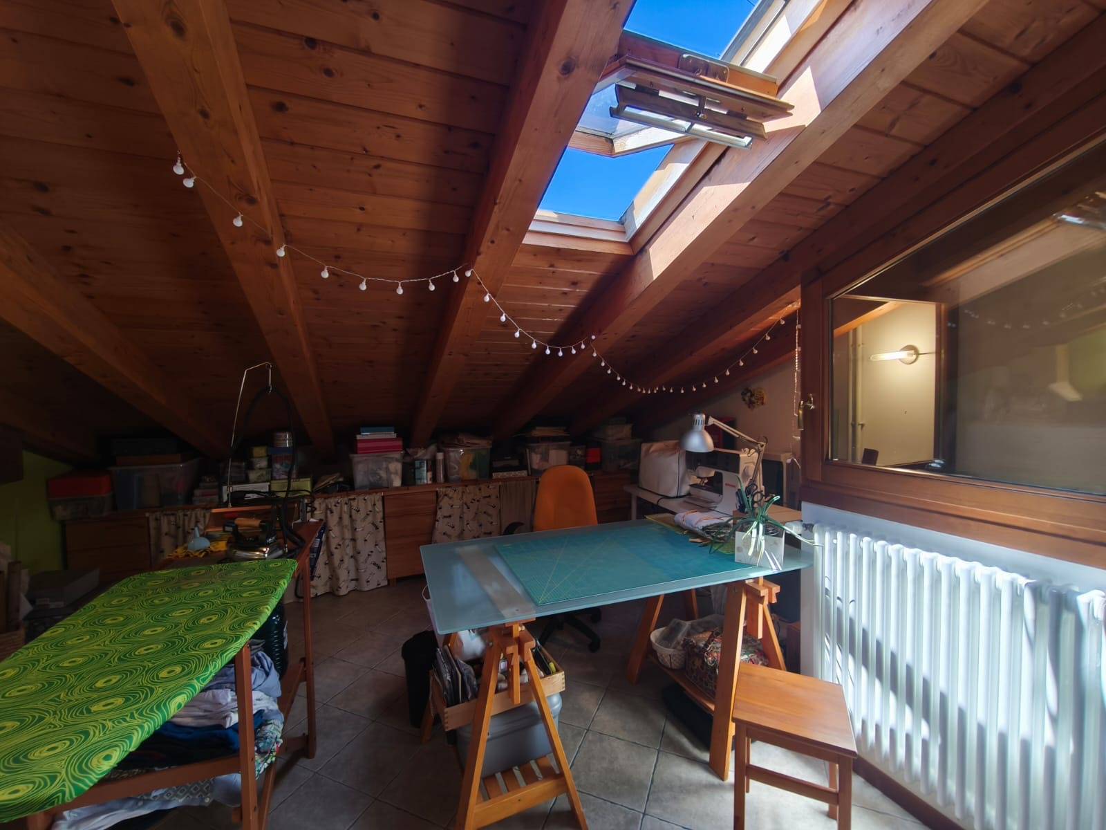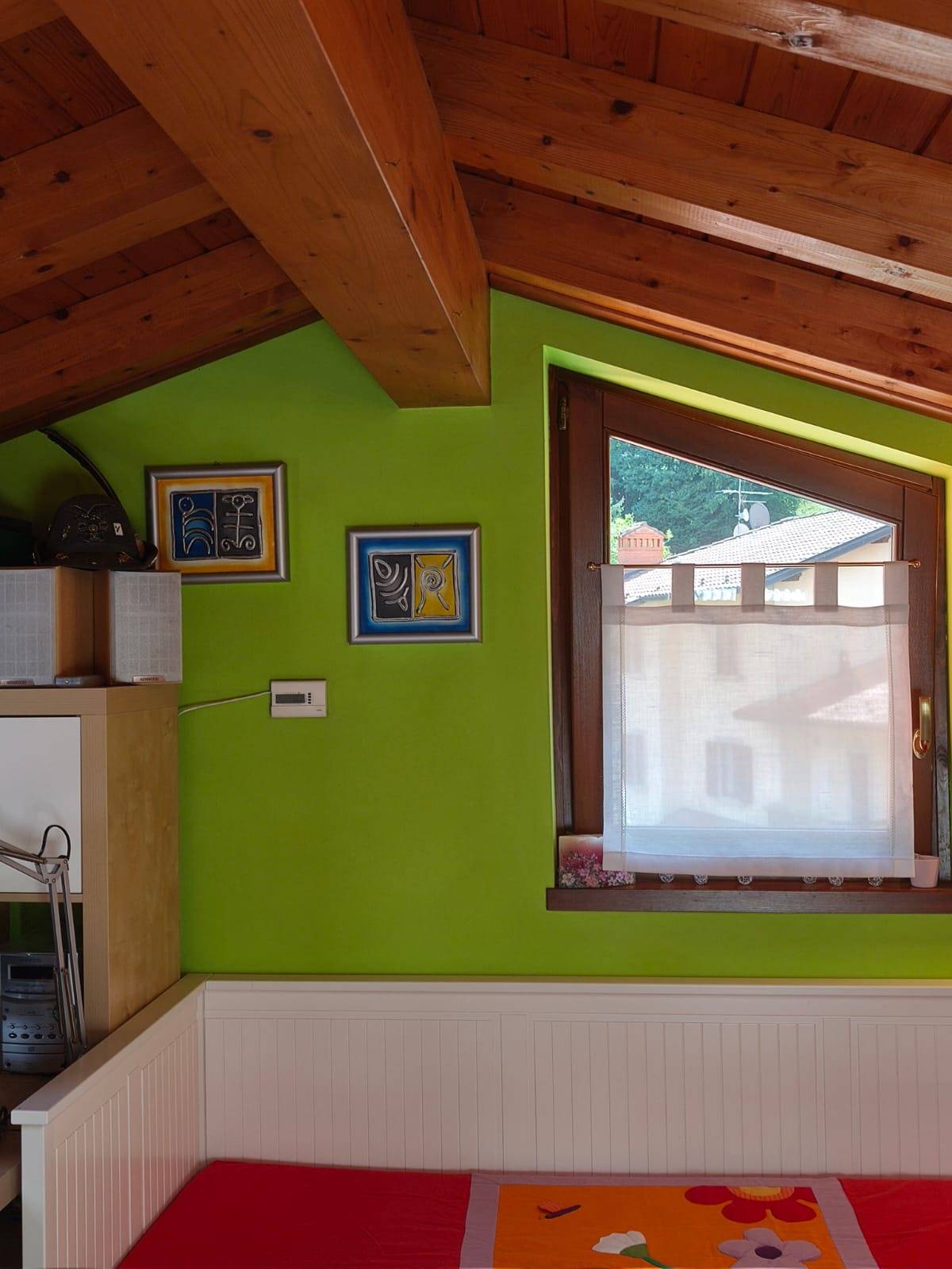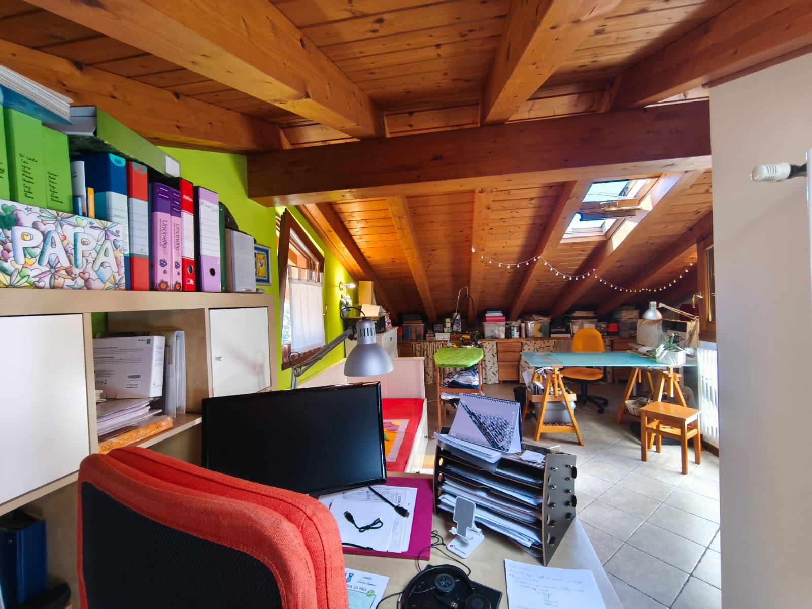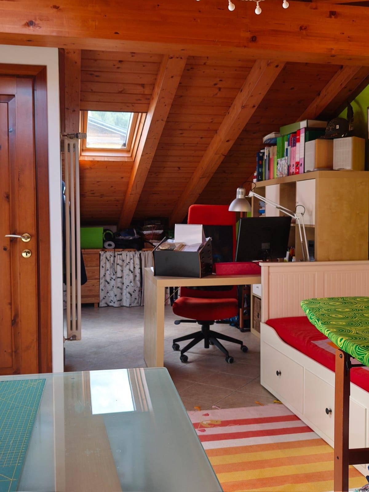 ampio locale con travature in legno lamellare a vista, finestrato, ideale come studio o spazio polivalente.