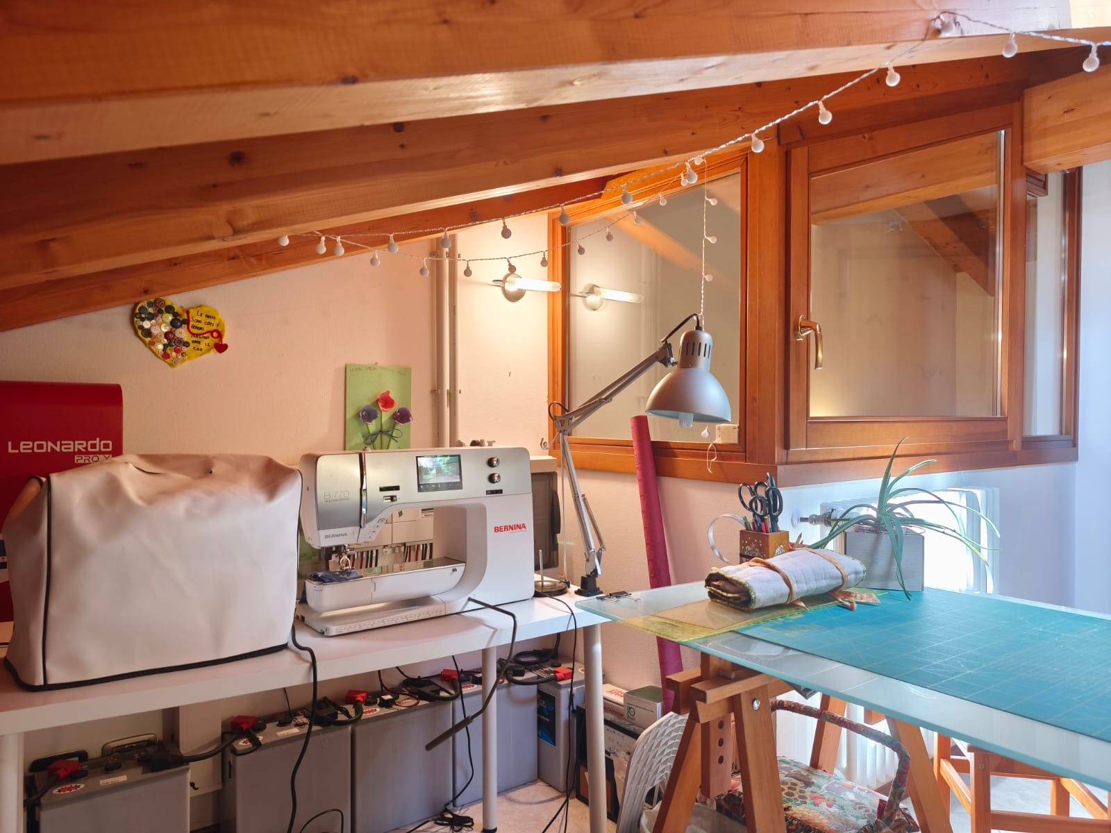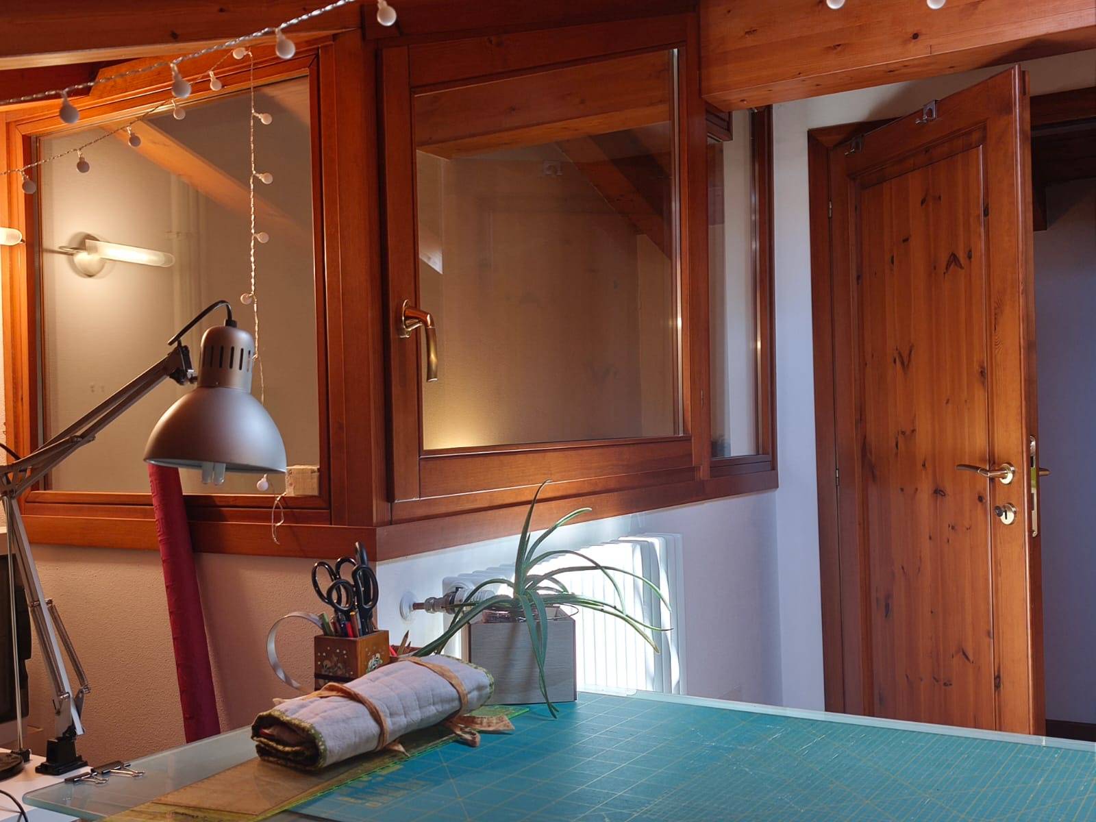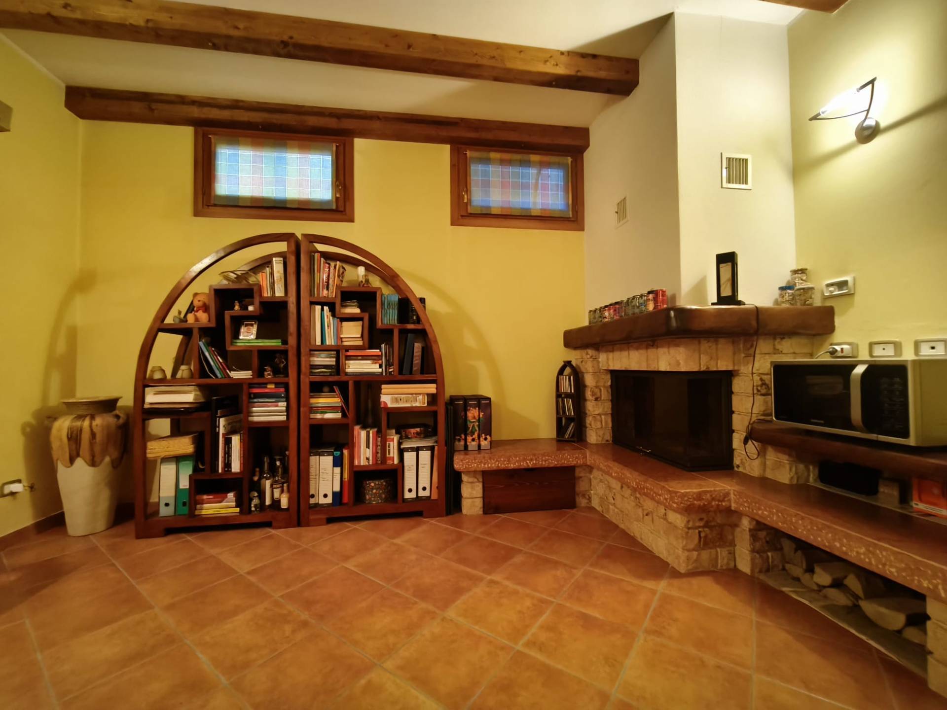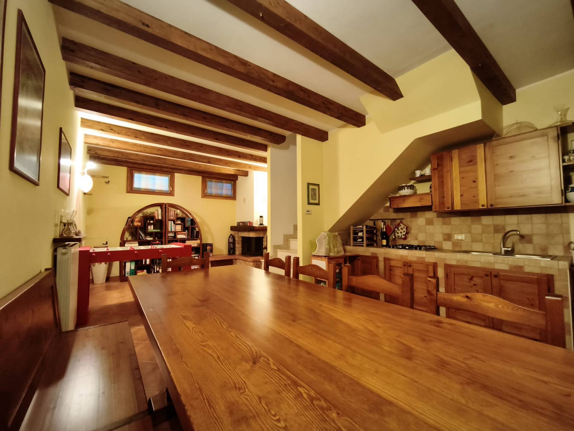 ampio locale con travature in legno lamellare a vista, finestrato, ideale come studio o spazio polivalente.