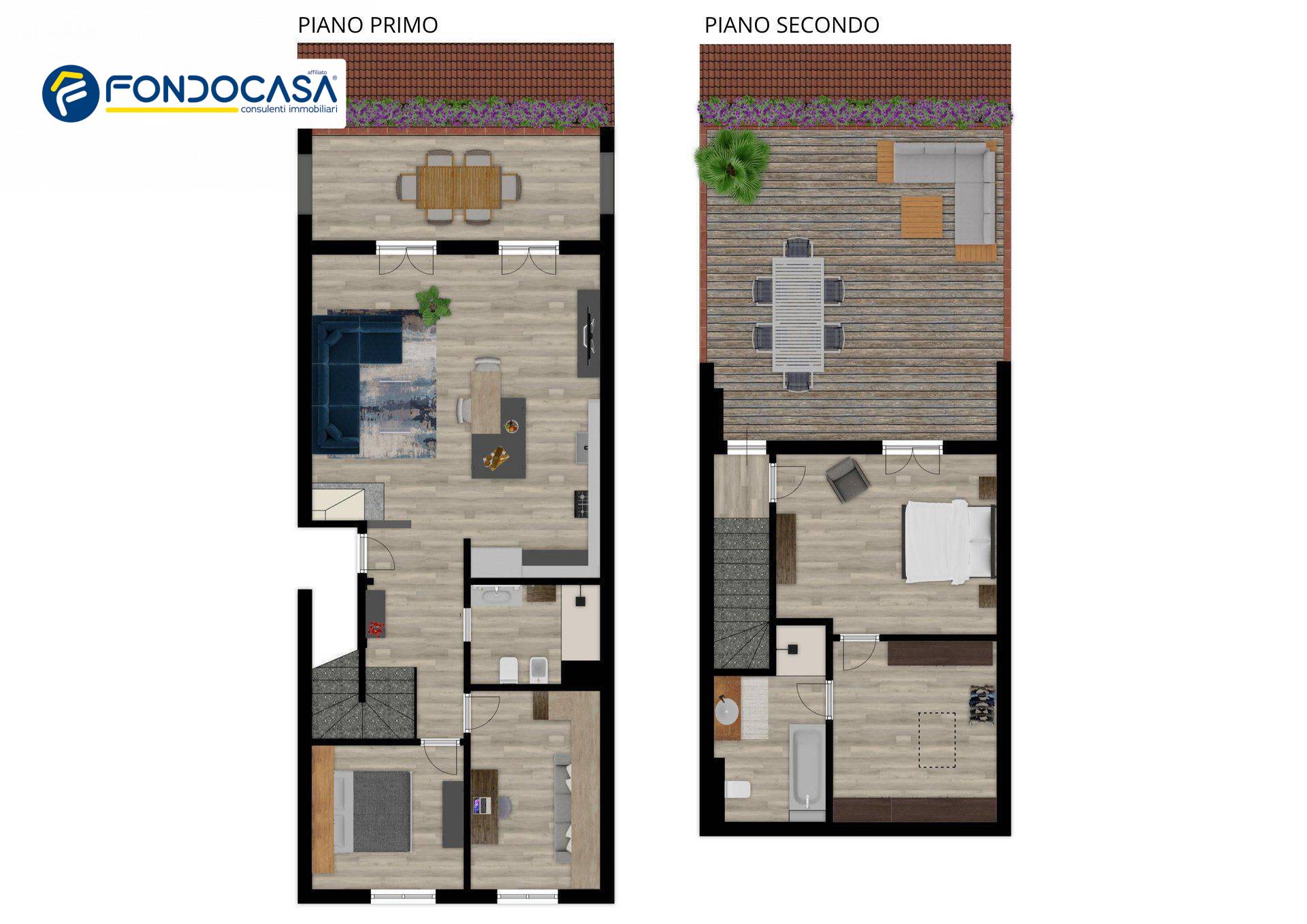 L'immobile è composto al primo livello da ampia zona giorno con cucina a vista, due camere da letto, bagno con doccia e balcone. Una comoda scala interna ci conduce al piano superiore dove troviamo un'ampia camera matrimoniale, una cabina armadio ed un secondo bagno.