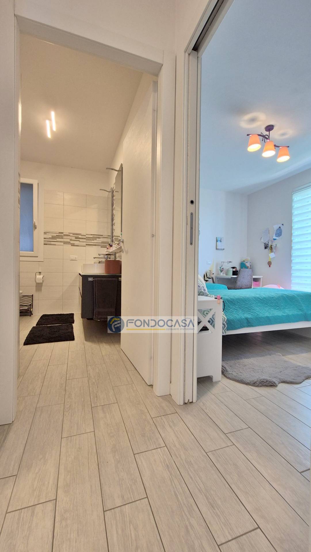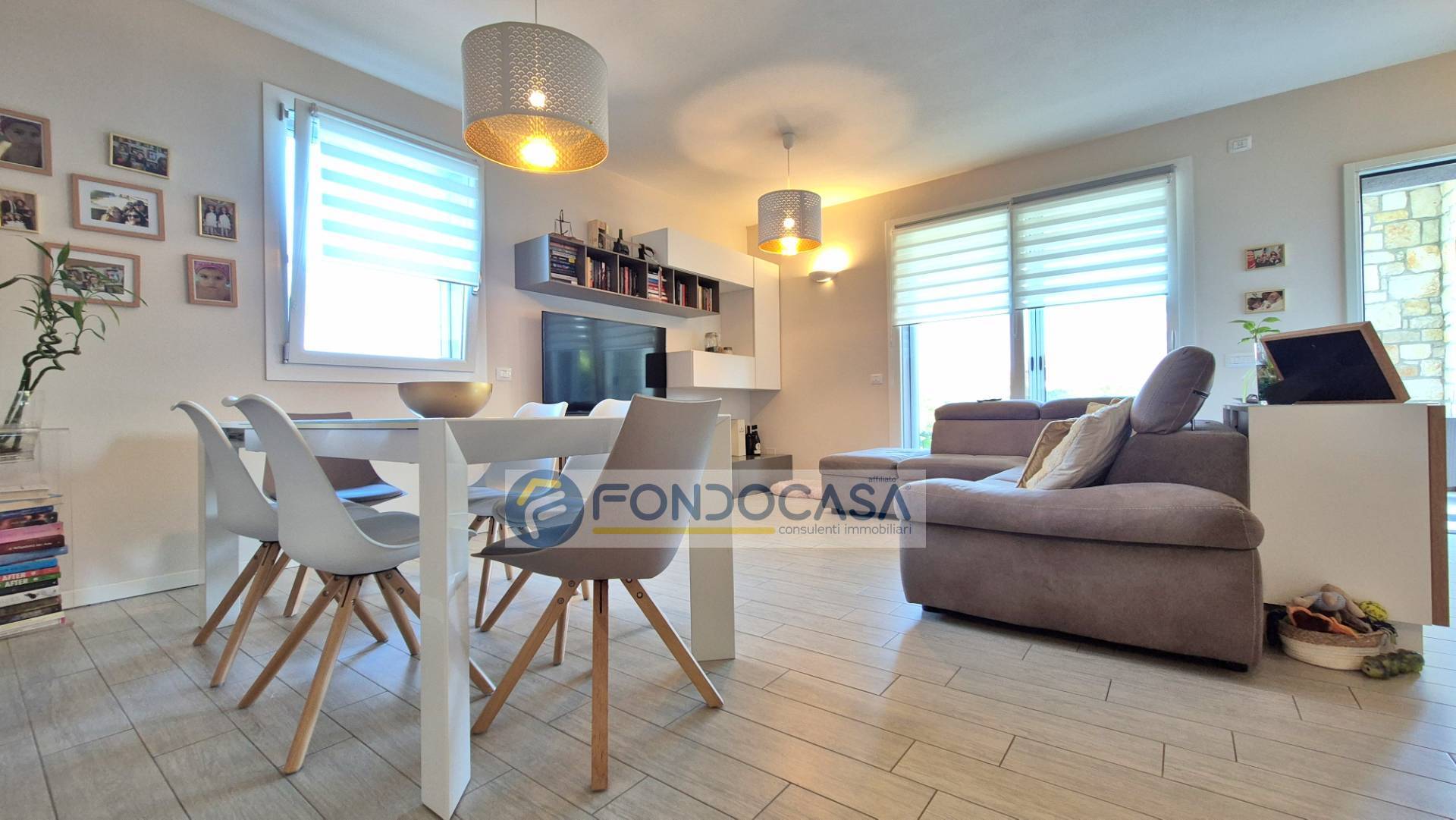 L´ingresso si apre su un´ampia zona living con soggiorno e cucina a vista di circa 38 mq, collegata direttamente al portico esterno ideale per pranzi e momenti di relax all´aperto. La zona notte è composta da due camere da letto, entrambe con accesso al portico privato, uno studio/guardaroba e due bagni.