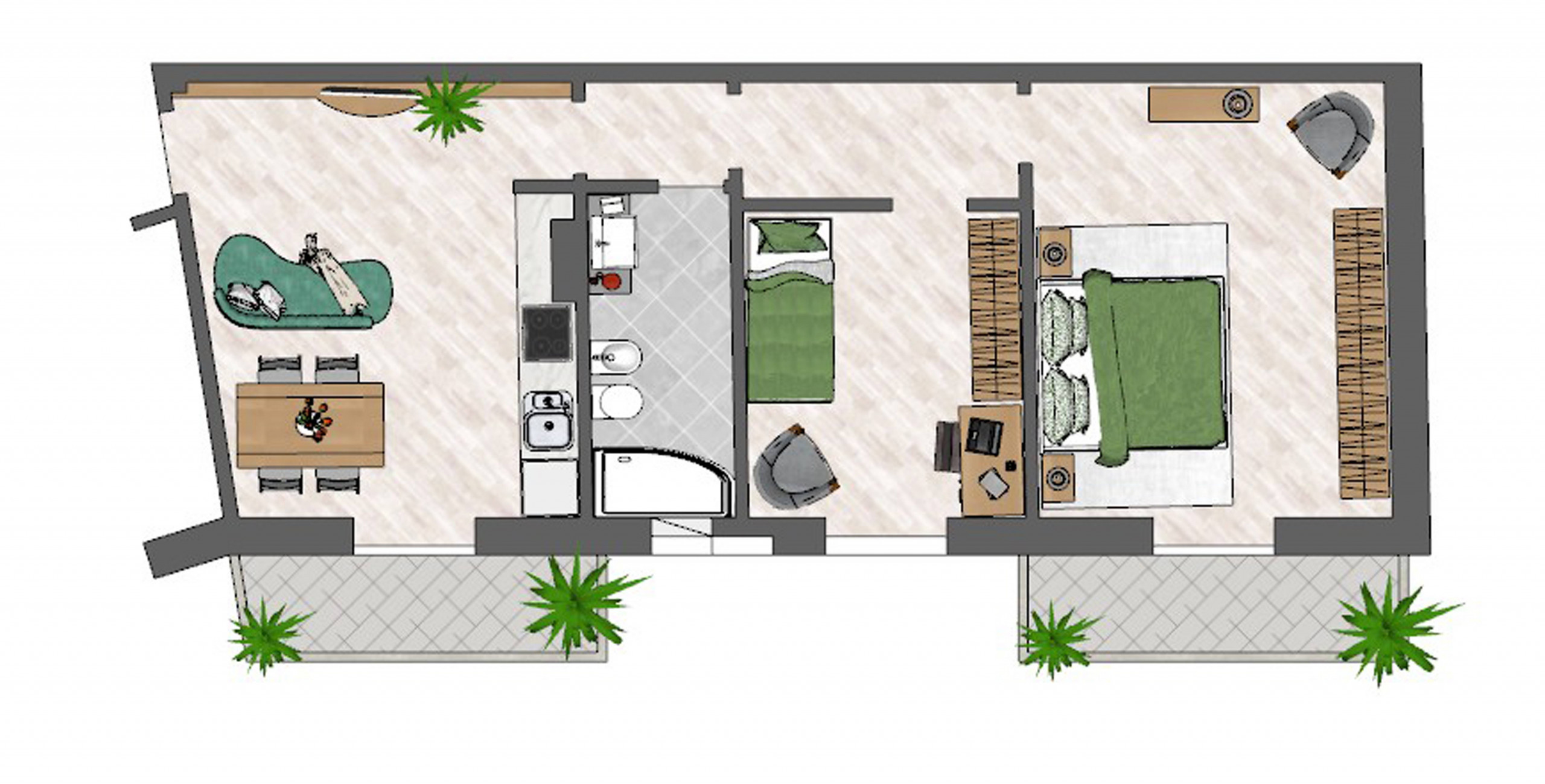 Disposizione interna: Soggiorno spazioso, cucina abitabile, camera da letto matrimoniale, bagno finestrato. Opzione di ristrutturazione: Facilmente trasformabile in un trilocale aprendo la cucina verso il soggiorno, per creare una seconda camera dedicata - ideale per famiglie o ospiti.