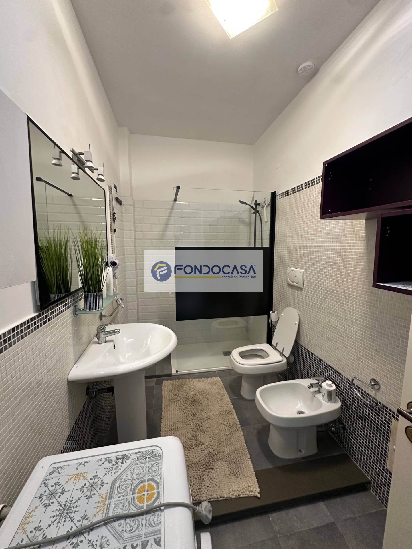 o Un bagno moderno con doccia e sanitari.