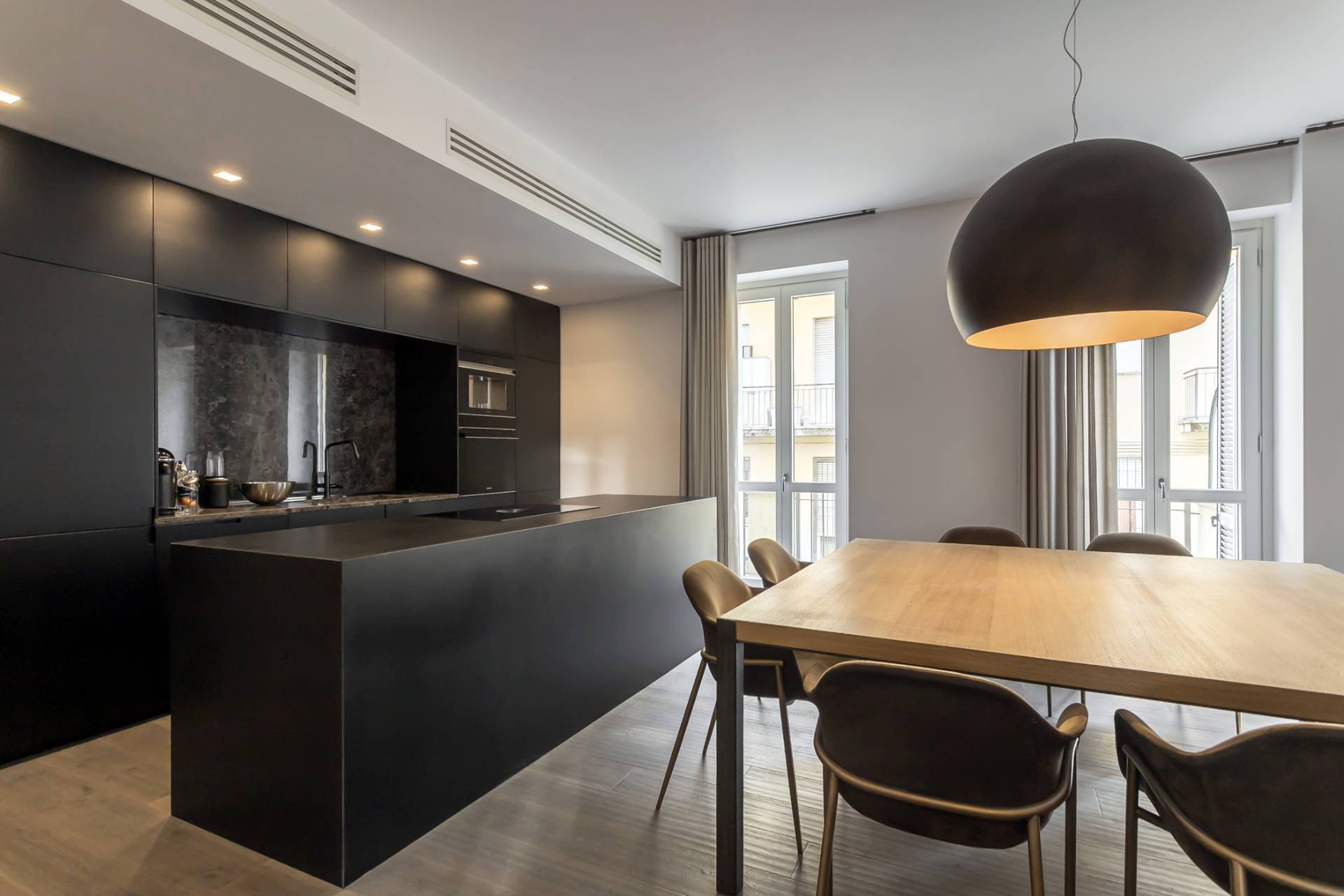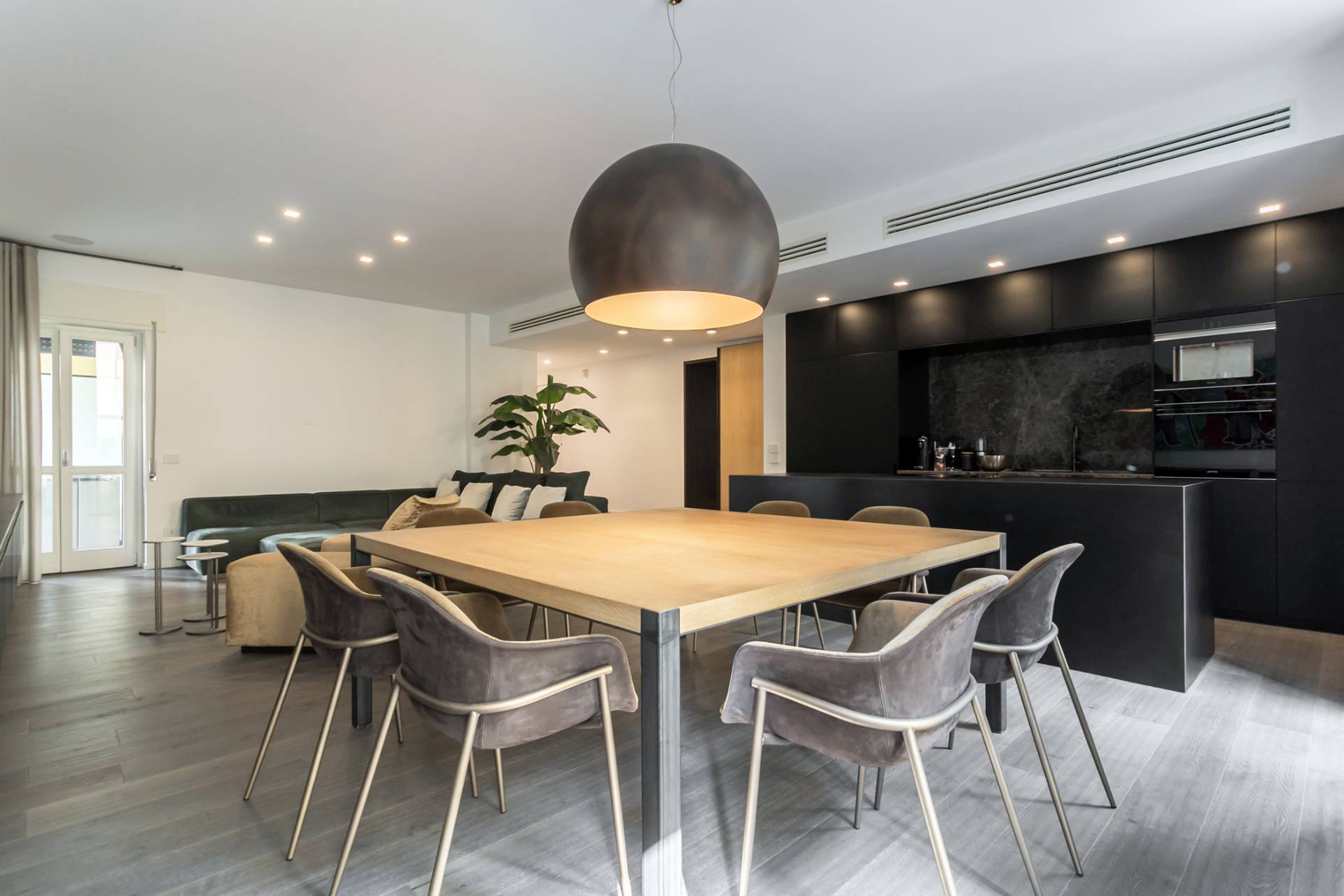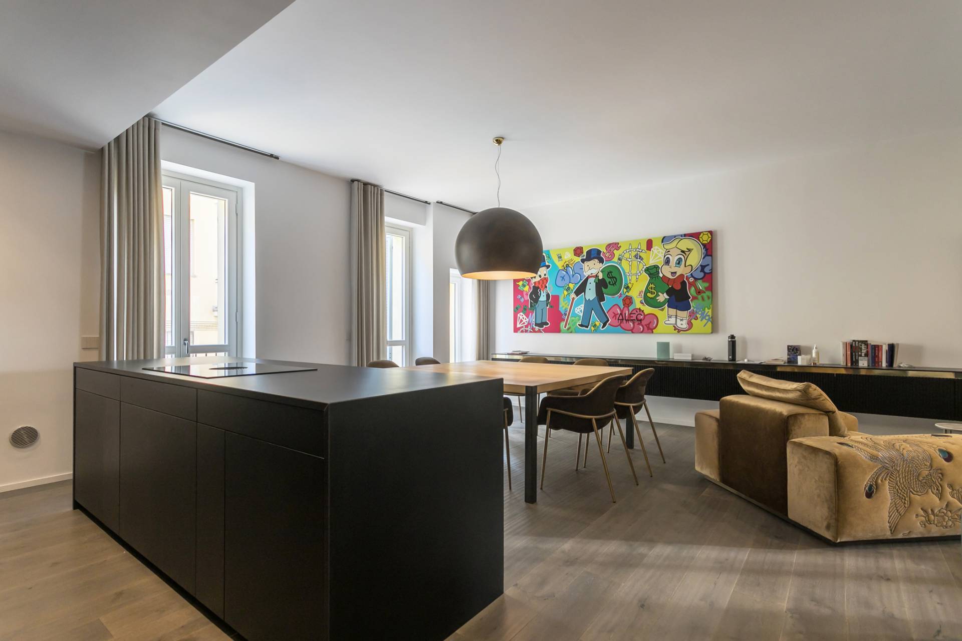 La zona living, ampia e luminosa, accoglie un raffinato soggiorno con cucina a isola in finitura nera opaca con piano in Laminam resistente al taglio, completa di elettrodomestici Miele.