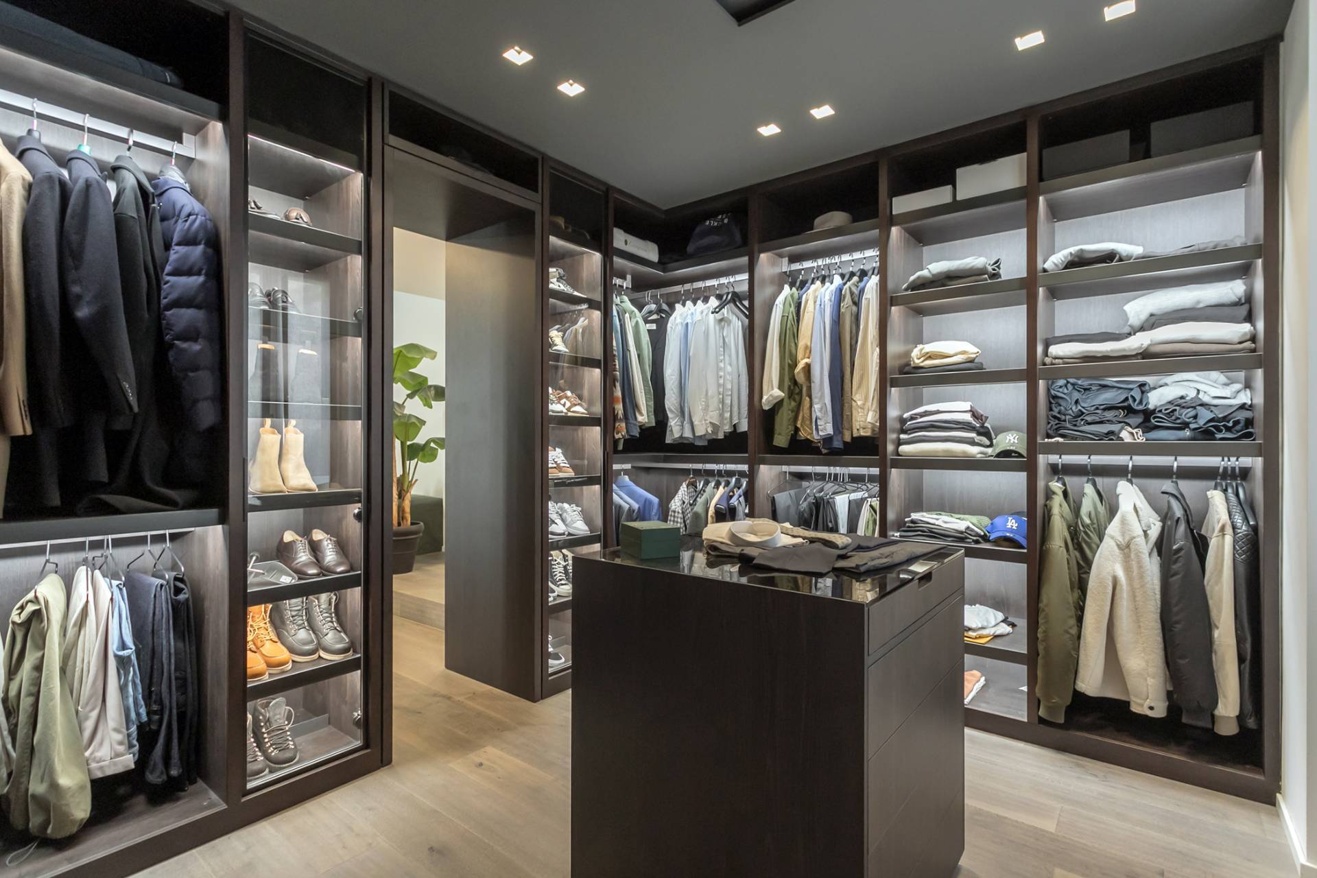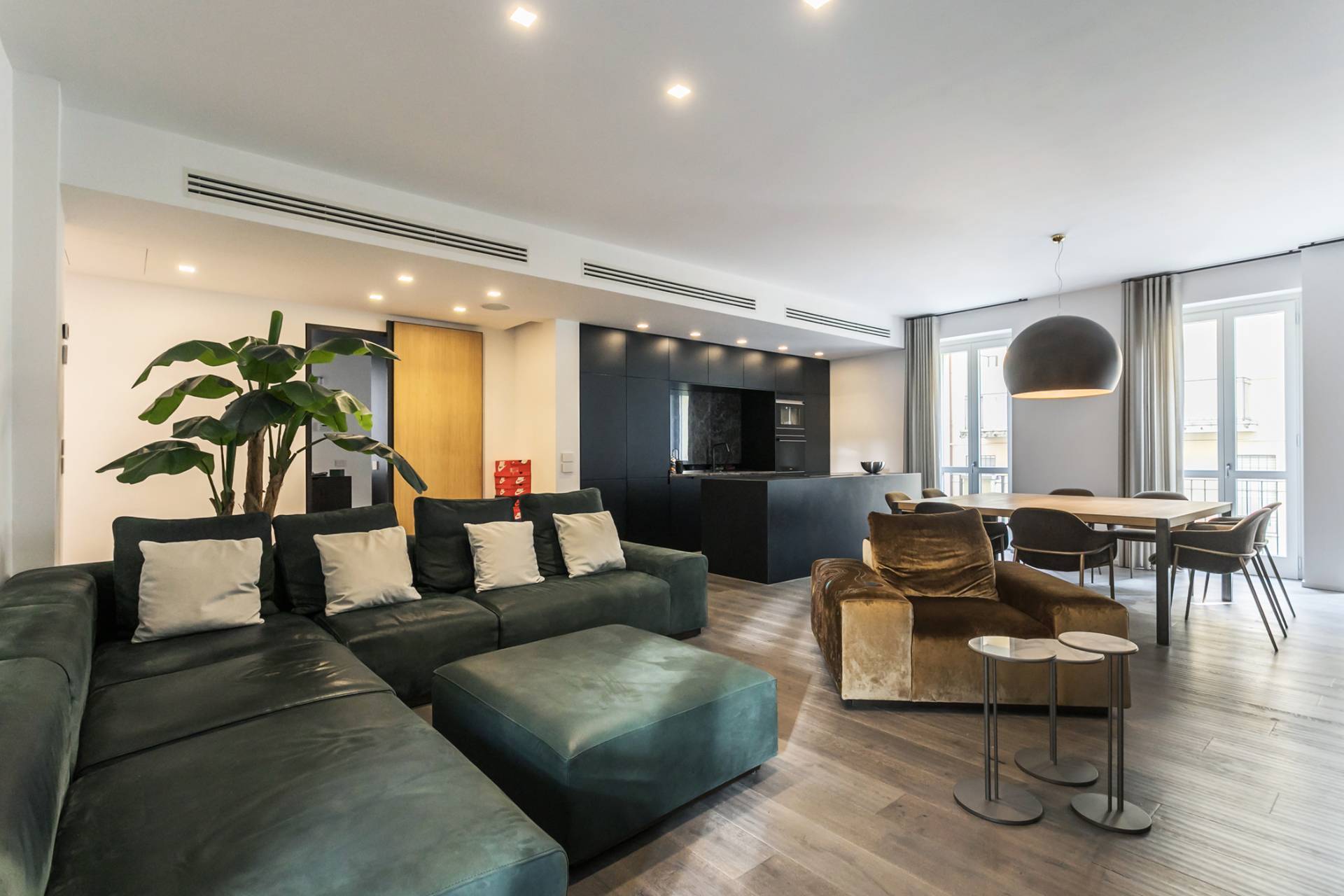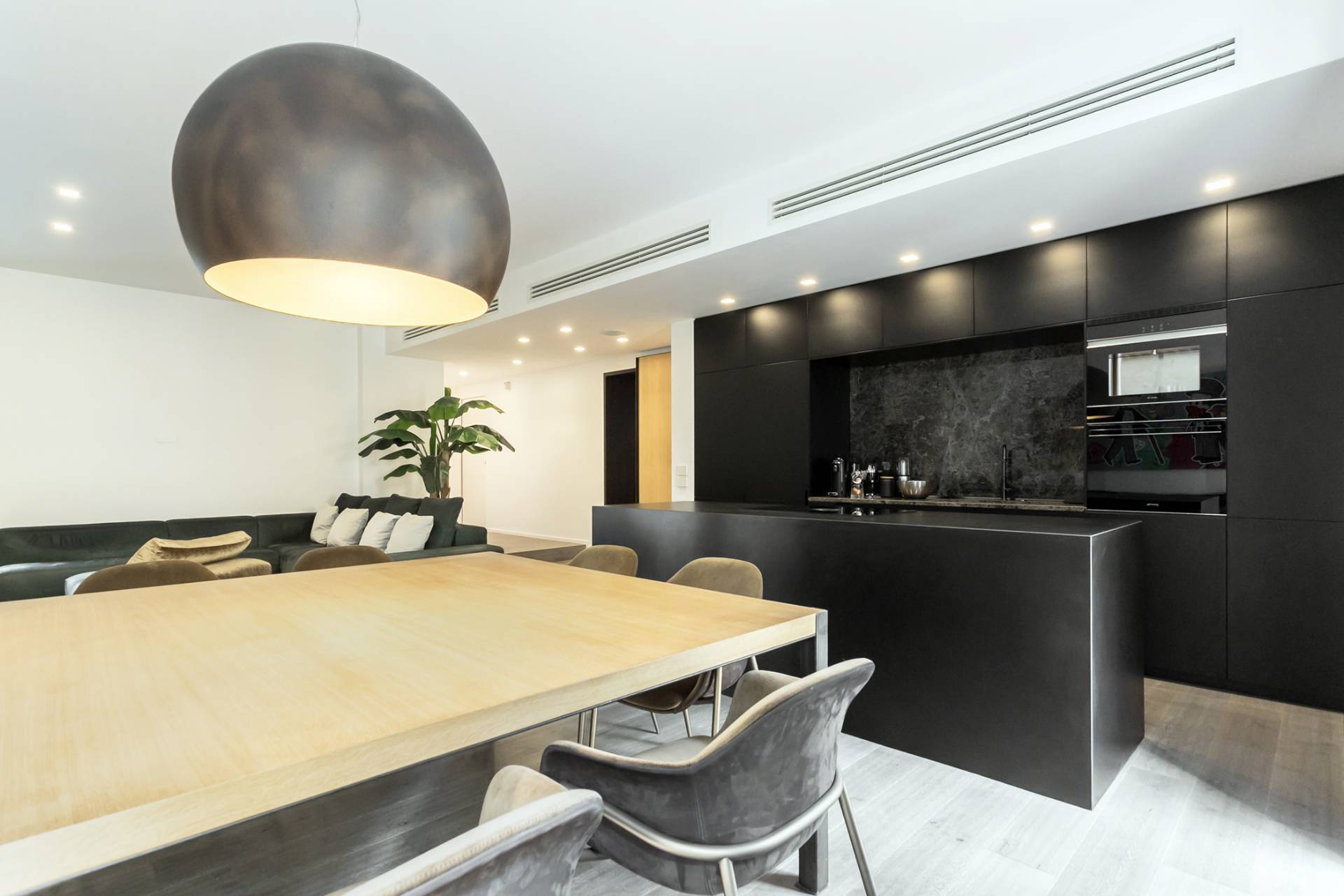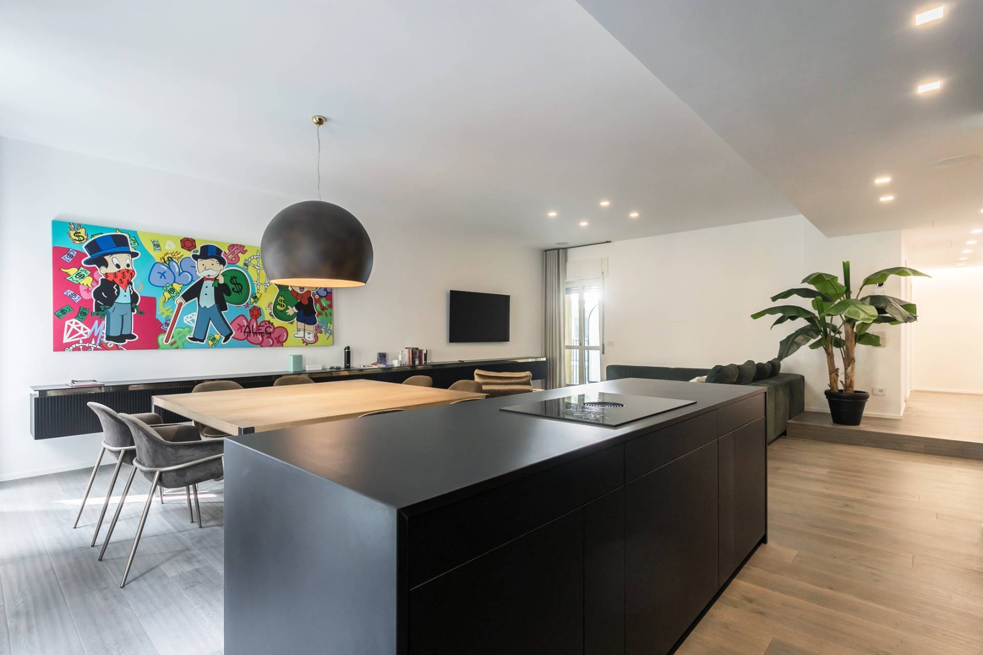 La zona living, ampia e luminosa, accoglie un raffinato soggiorno con cucina a isola in finitura nera opaca con piano in Laminam resistente al taglio, completa di elettrodomestici Miele.