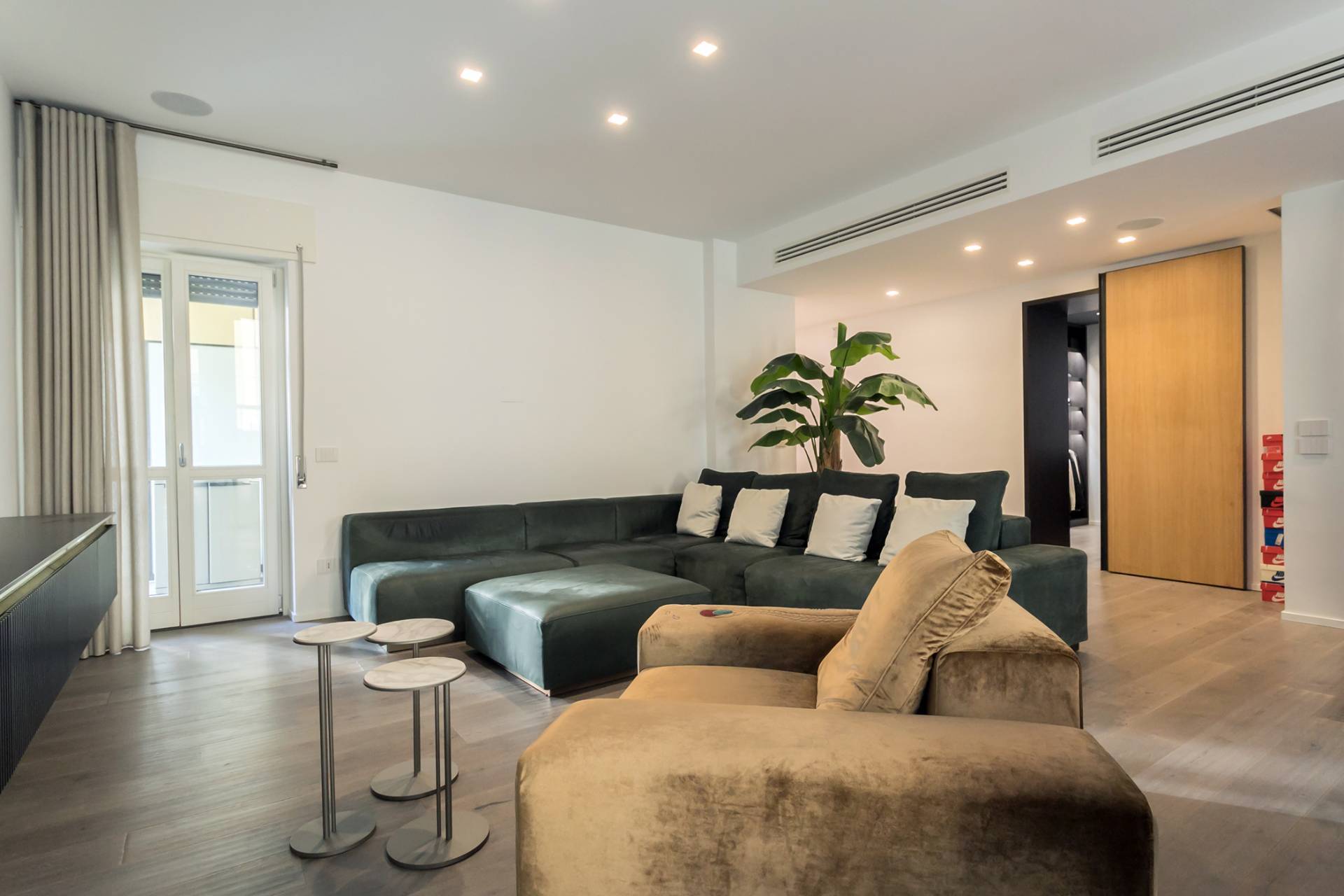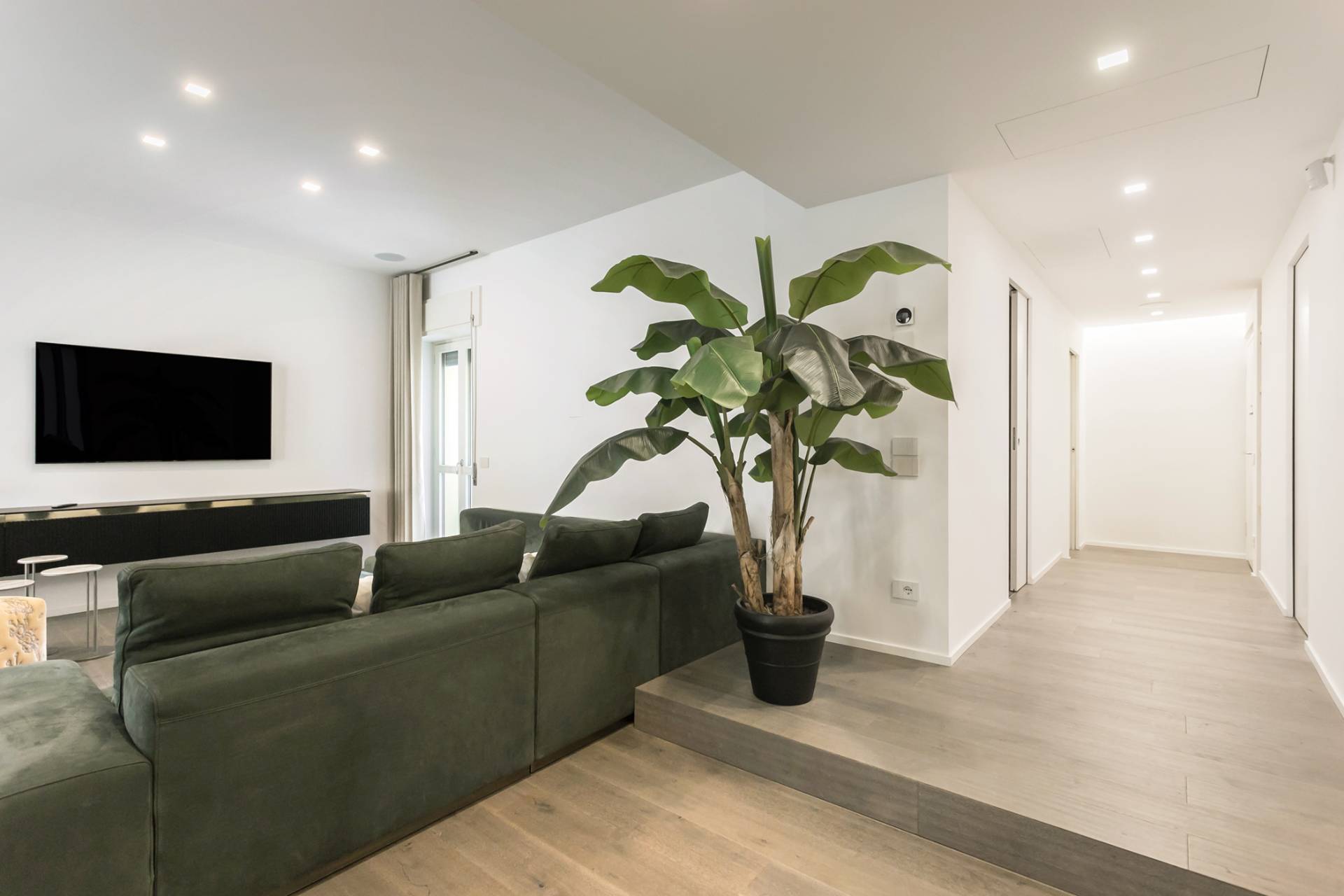 A completare l´ambiente, tavolo e sedie in velluto Marelli, divano Pellizzari Quality Home e TV 65´´ integrata a parete.