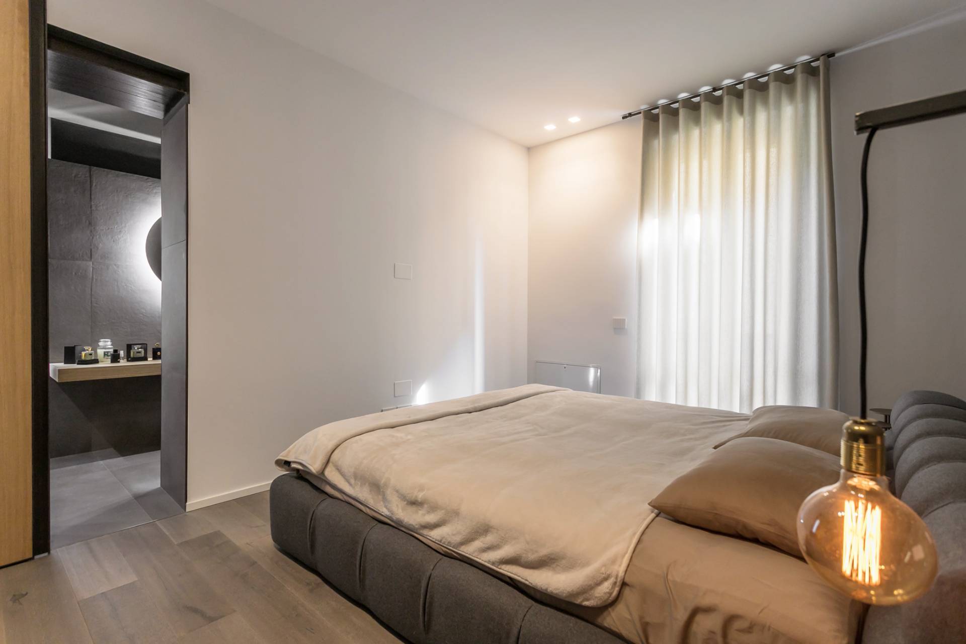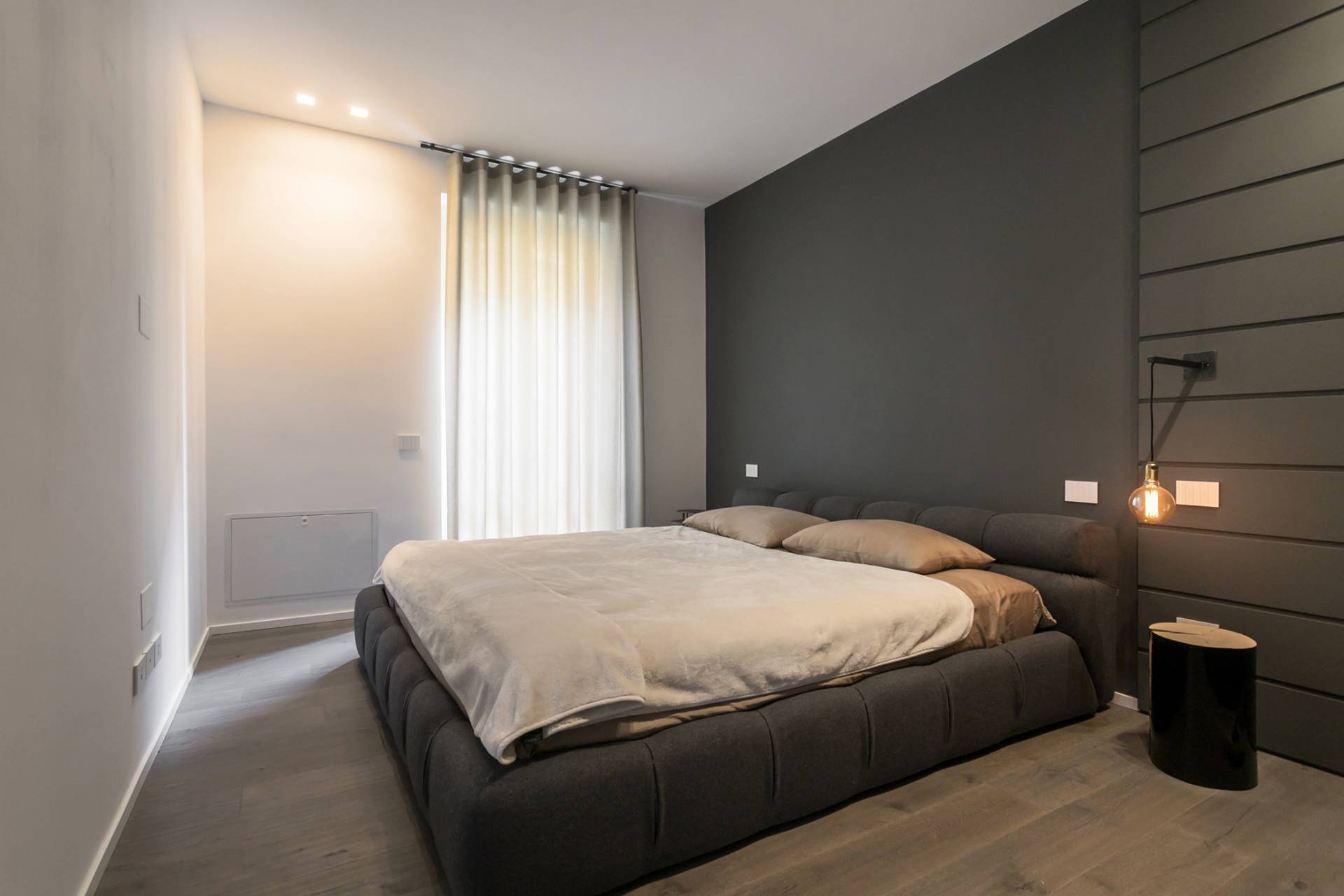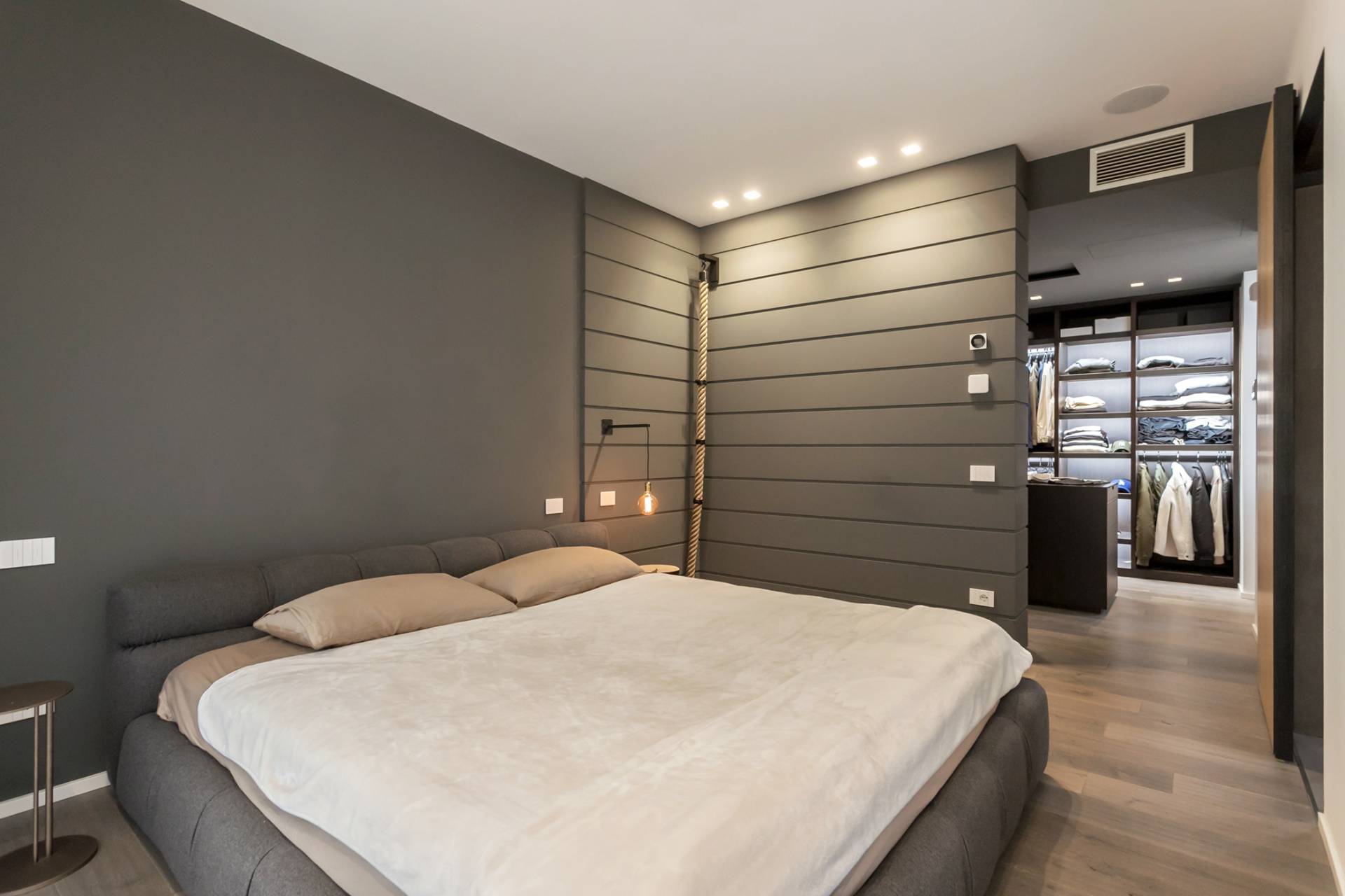 La zona notte comprende una camera padronale con letto Tufty Bed di B&B Italia, un´ampia cabina armadio su misura, seconda camera e due bagni con piastrelle Marazzi 80x80, lavabi in pietra avorio e rubinetteria Fontane Bianche.