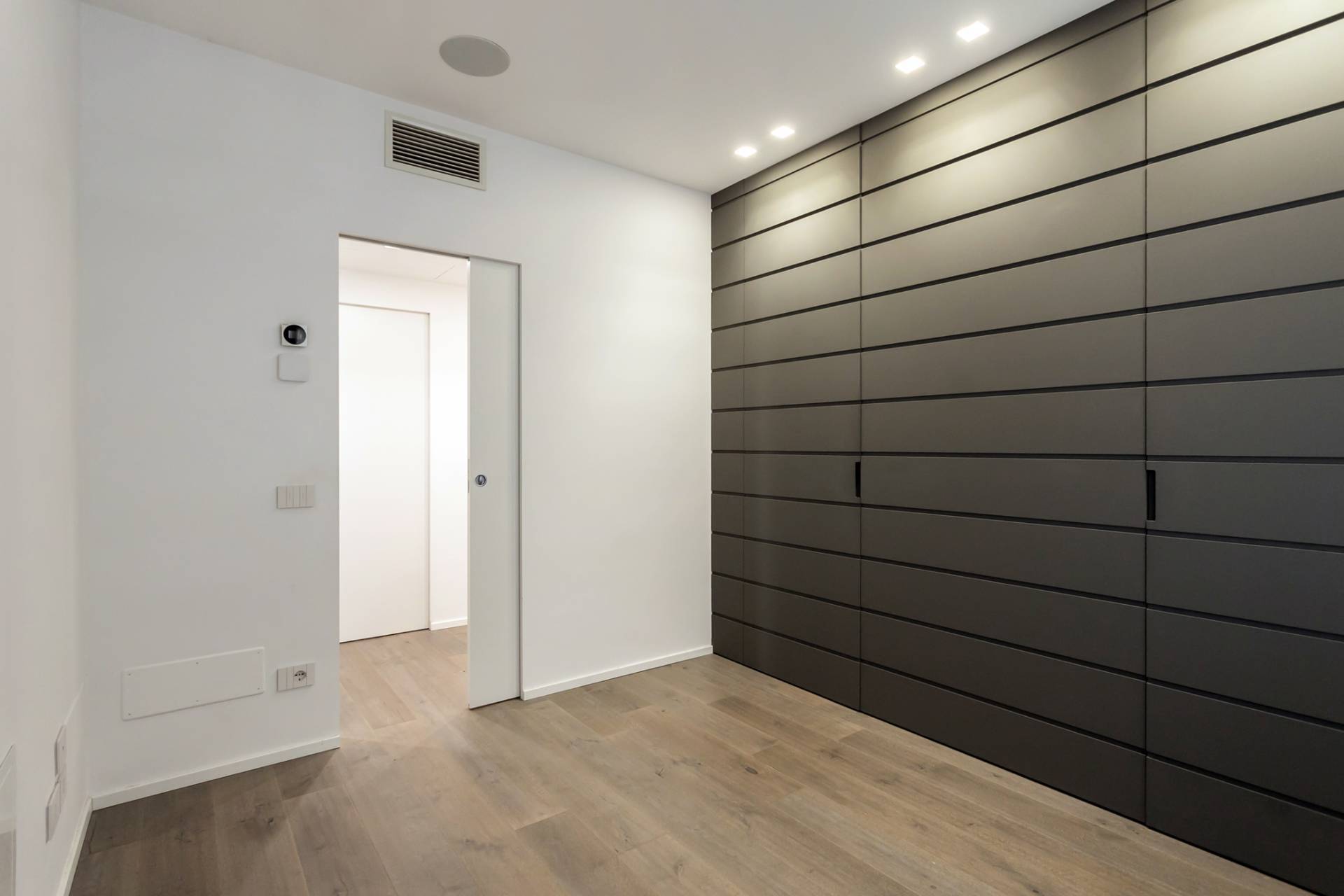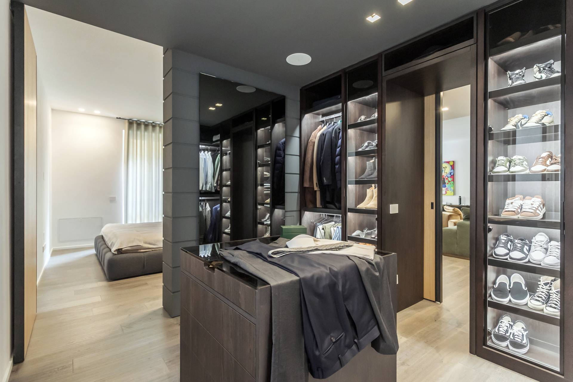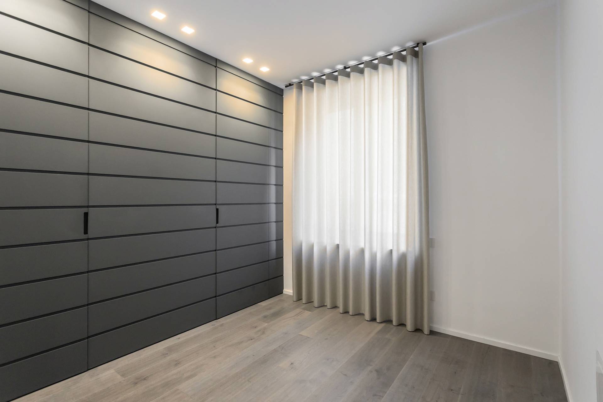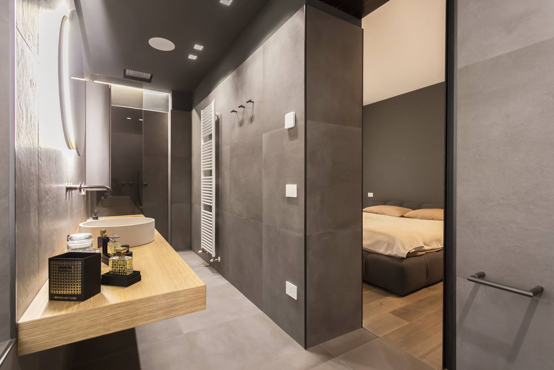 La zona notte comprende una camera padronale con letto Tufty Bed di B&B Italia, un´ampia cabina armadio su misura, seconda camera e due bagni con piastrelle Marazzi 80x80, lavabi in pietra avorio e rubinetteria Fontane Bianche.