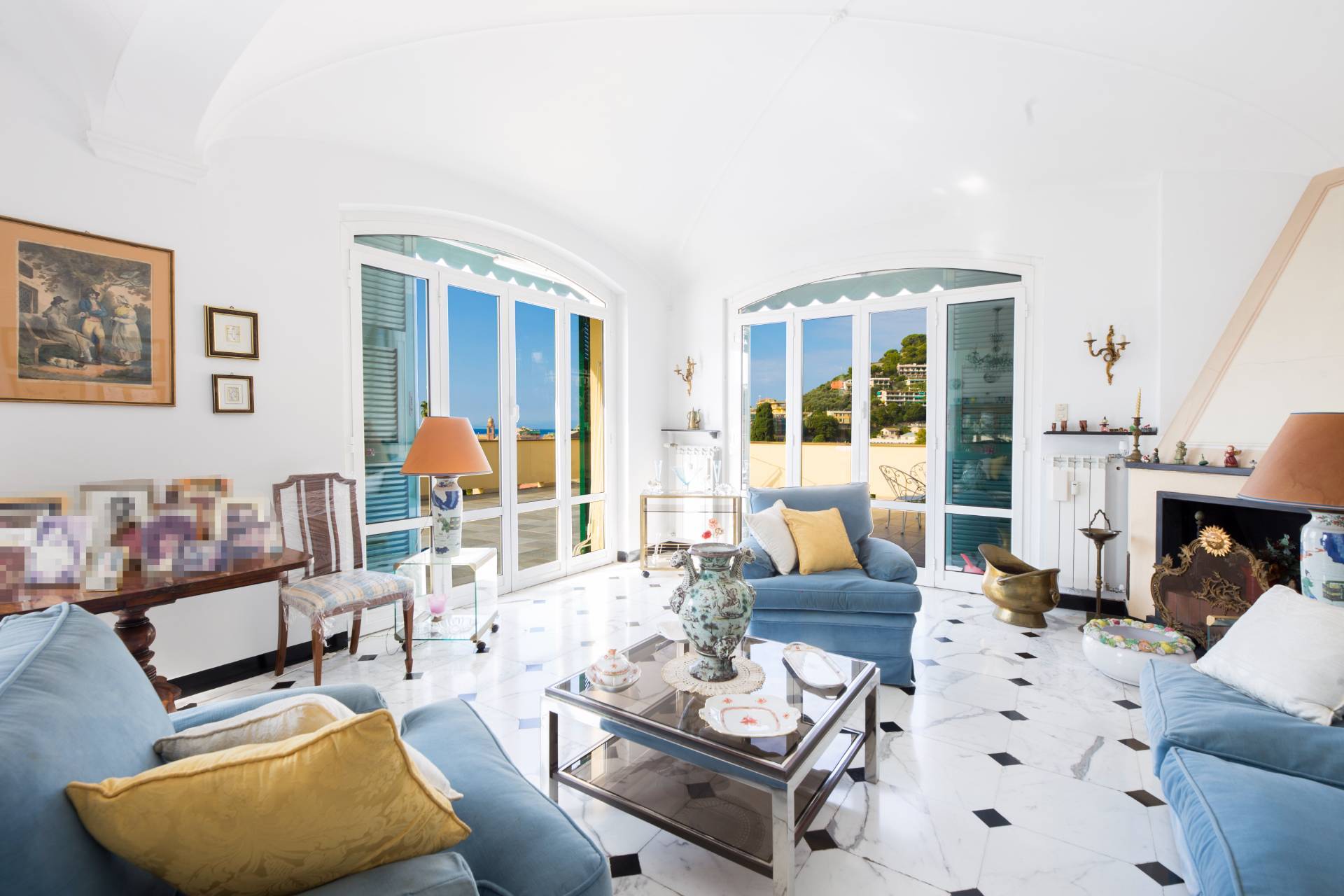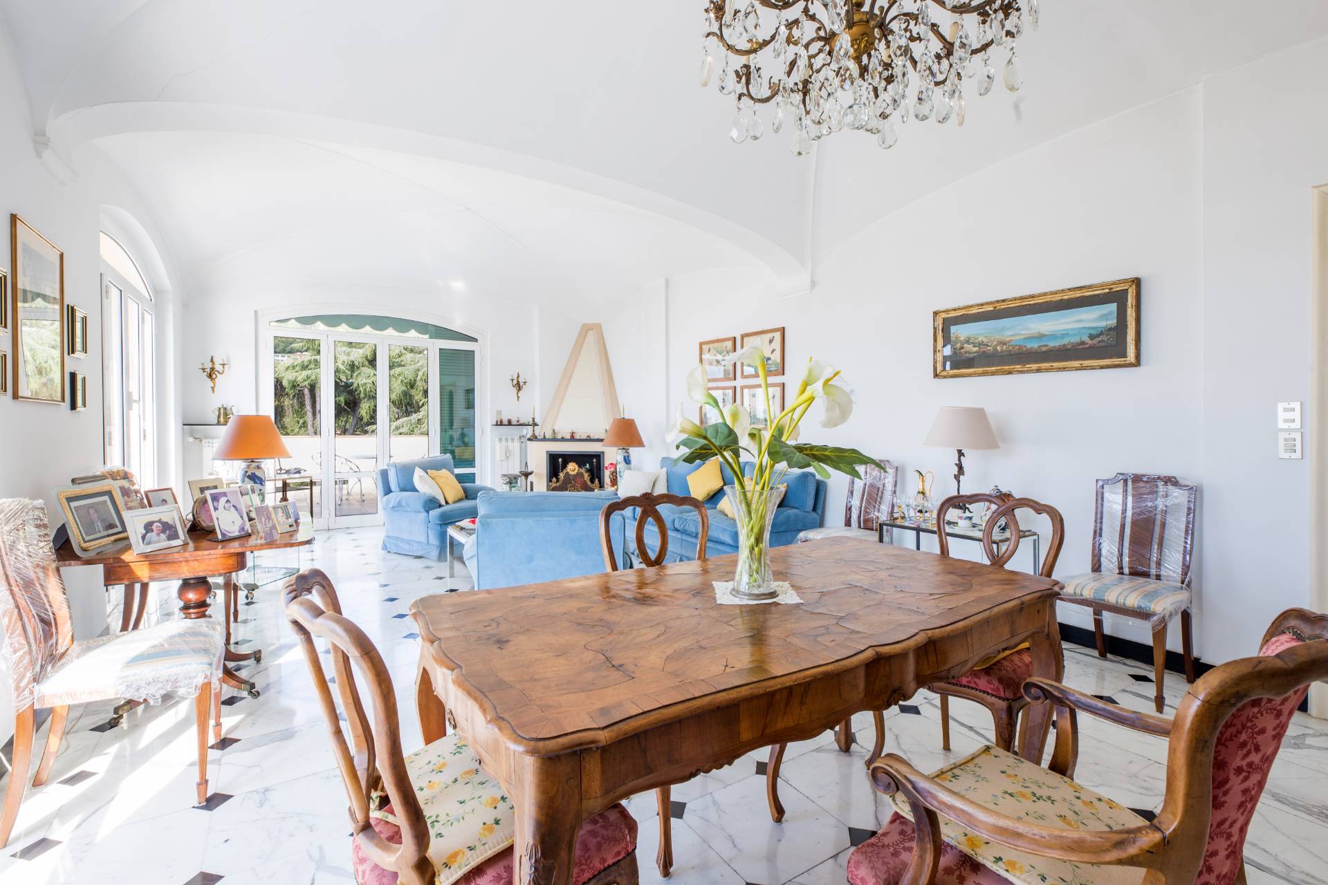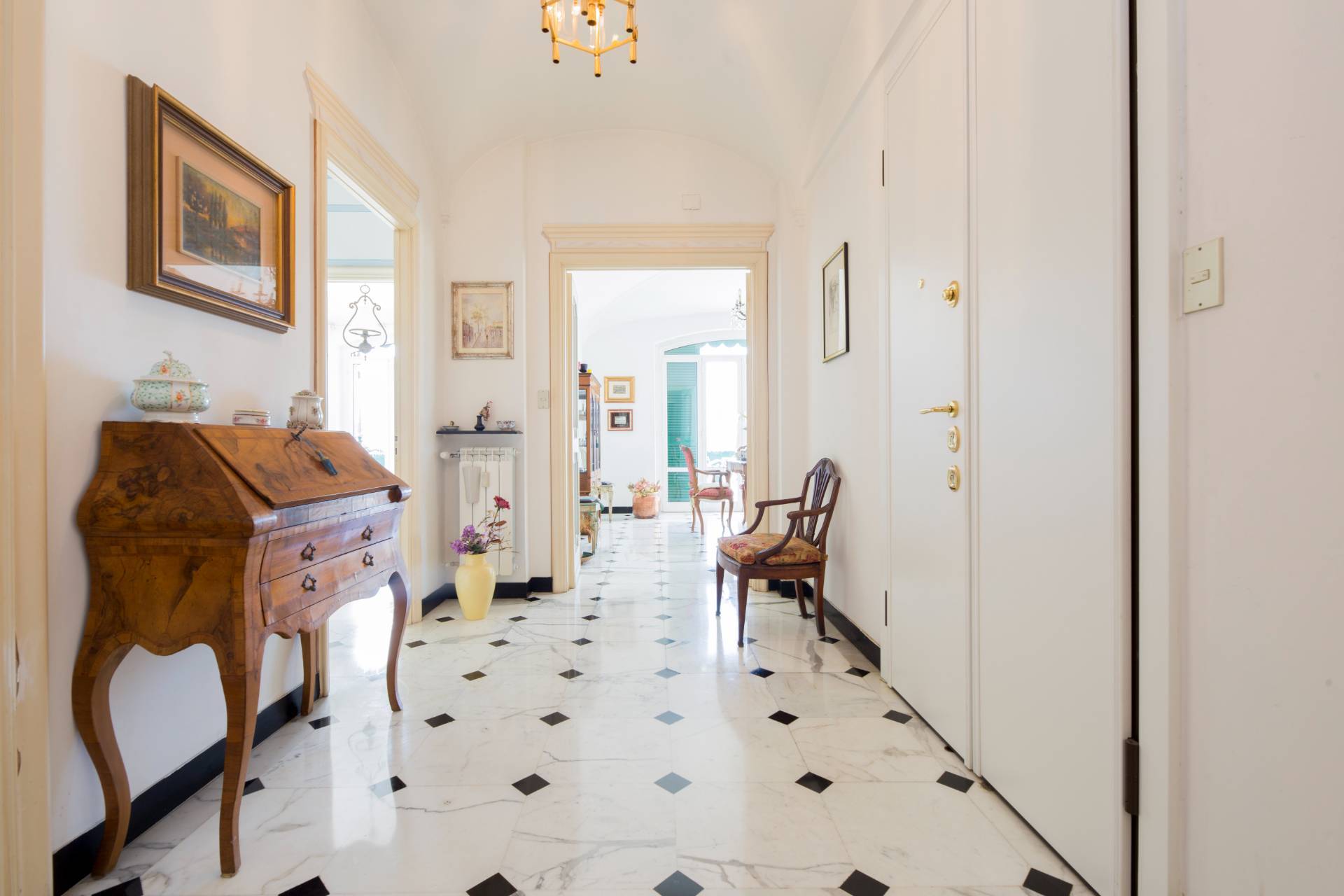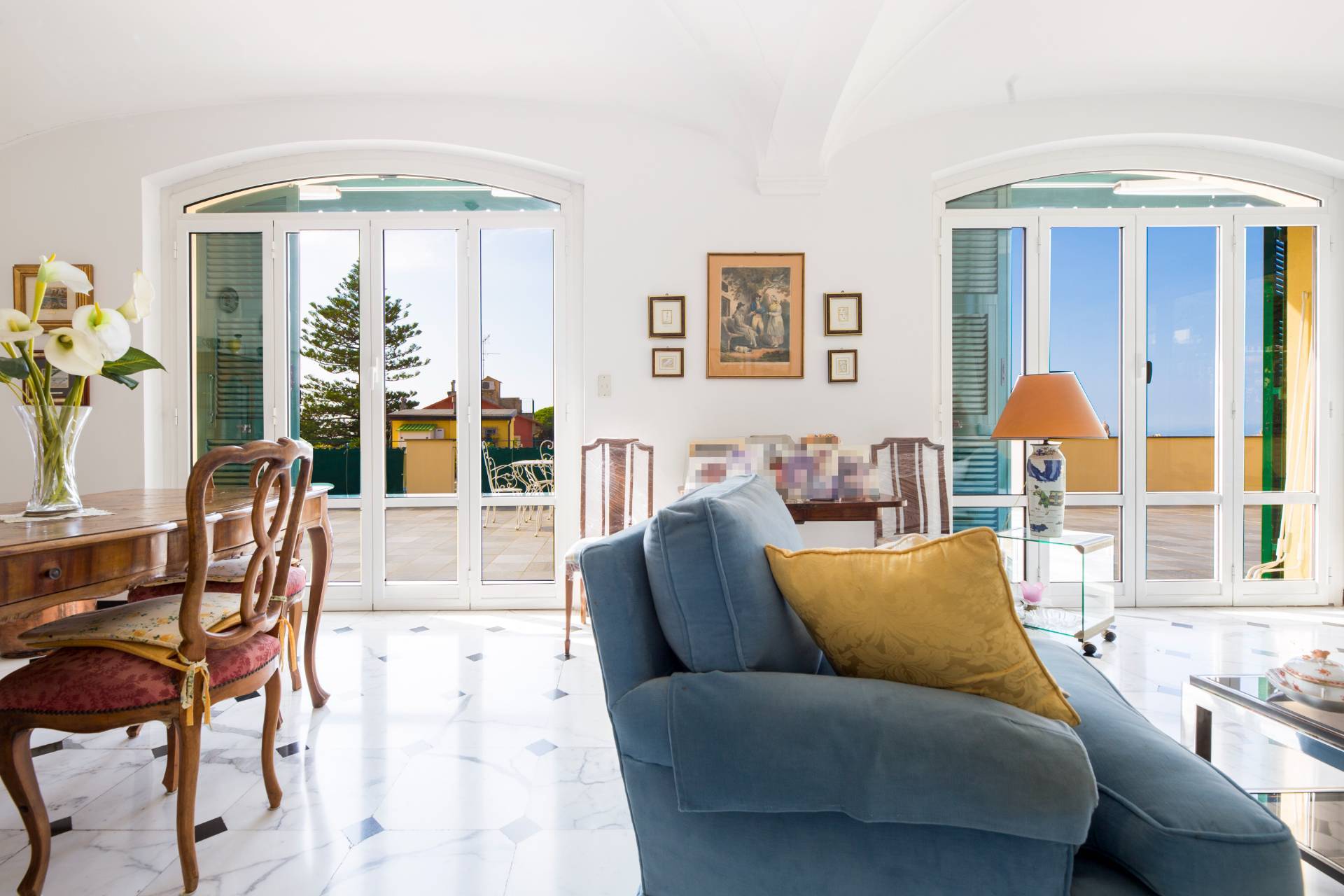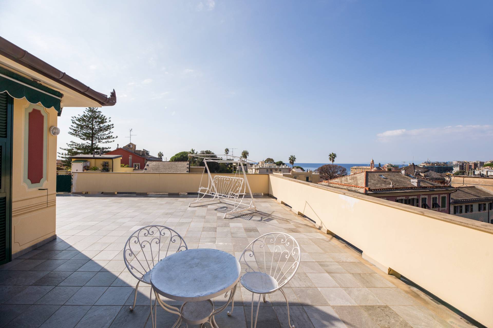 Un ampio ingresso si apre sullo splendido salone le cui grandi porte finestre conducono nel grande terrazzo al piano dalla incantevole vista sui tetti della zona, verde e mare.