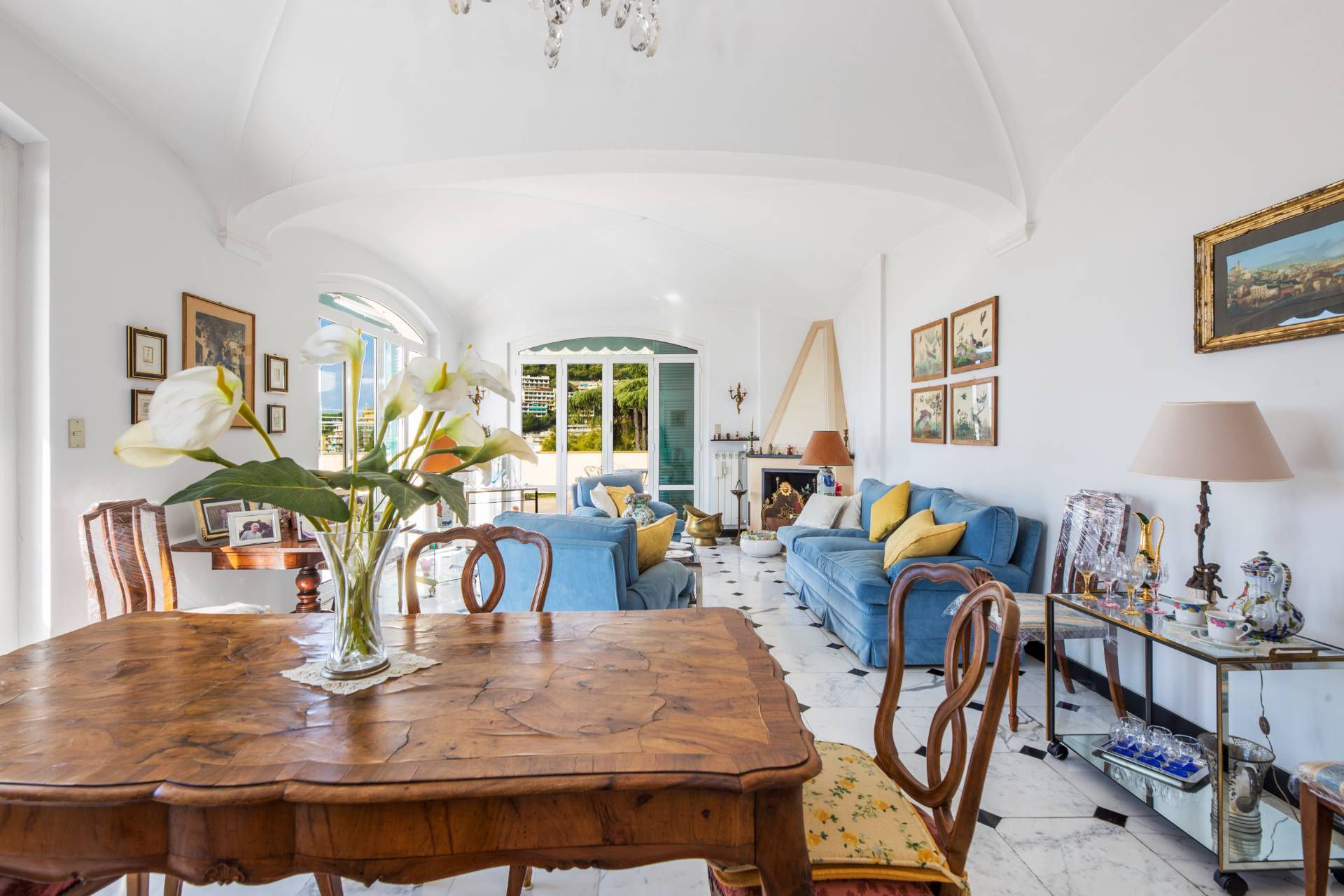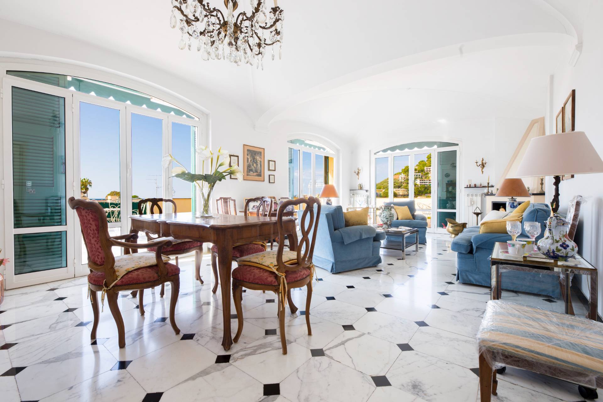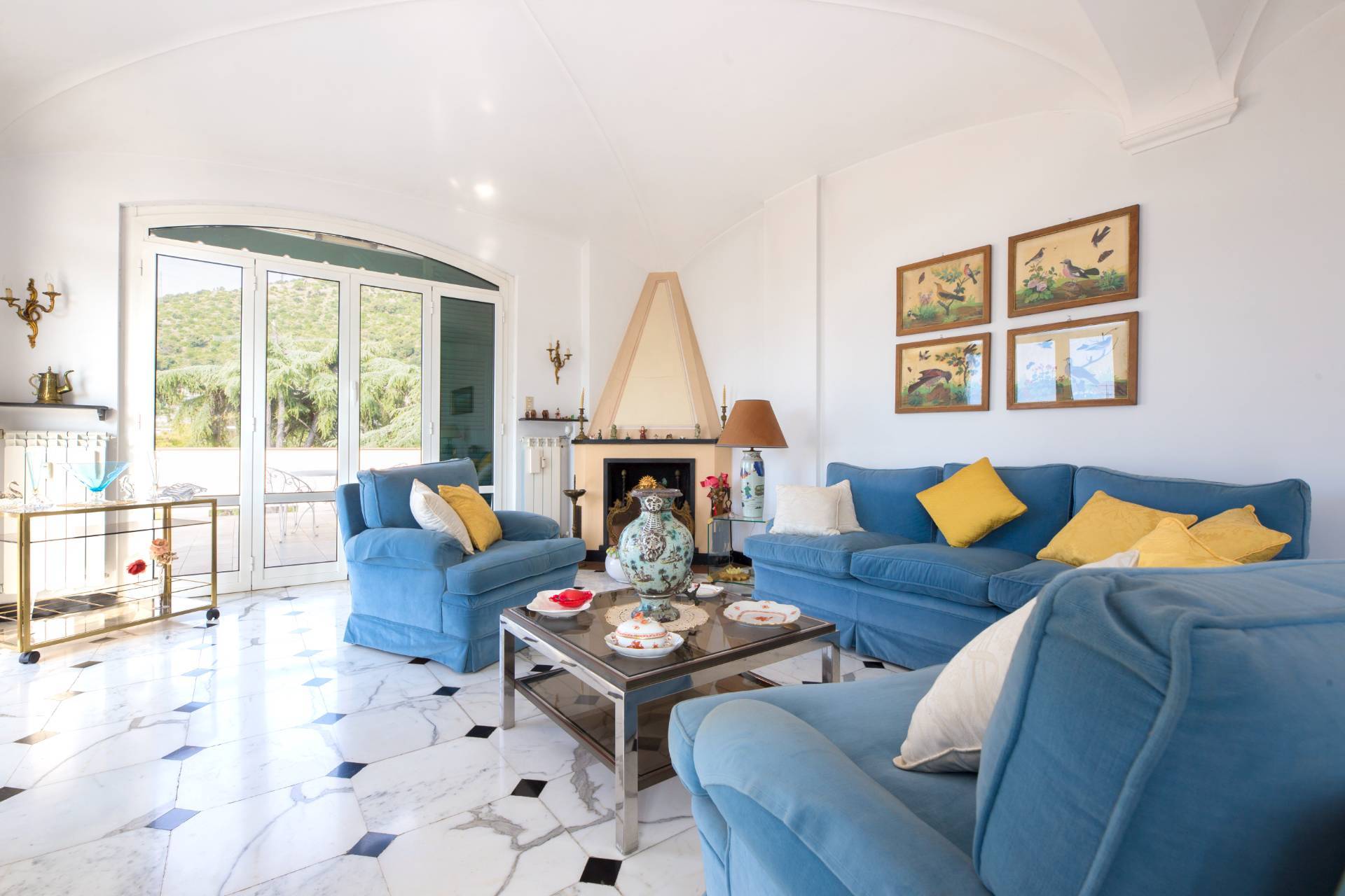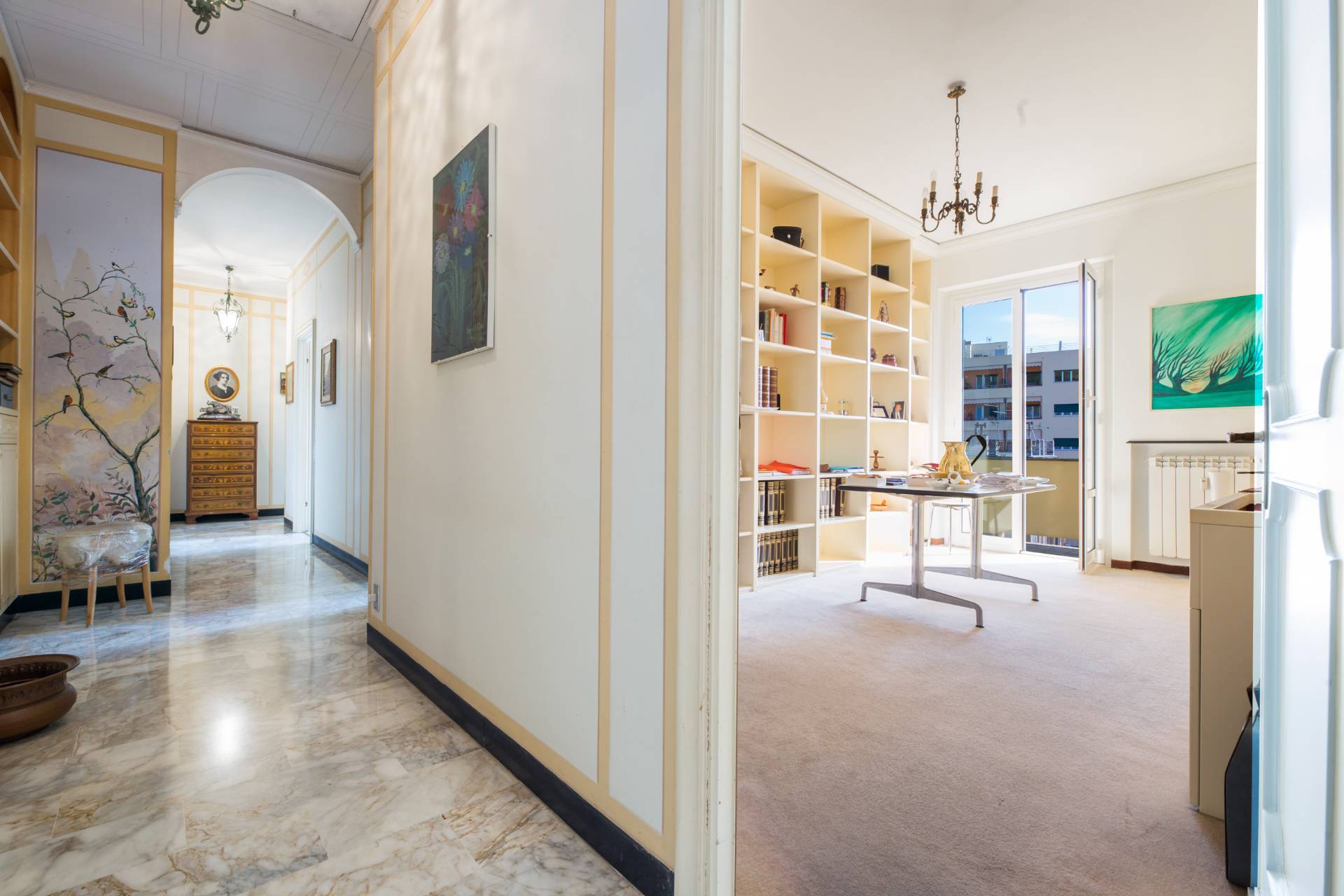 Un ampio ingresso si apre sullo splendido salone le cui grandi porte finestre conducono nel grande terrazzo al piano dalla incantevole vista sui tetti della zona, verde e mare.