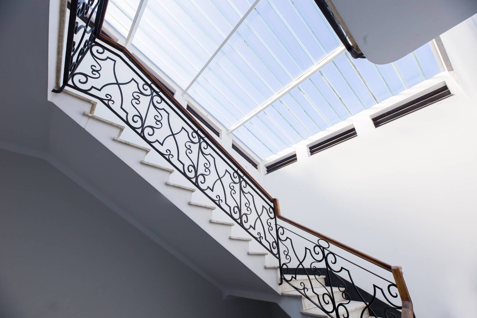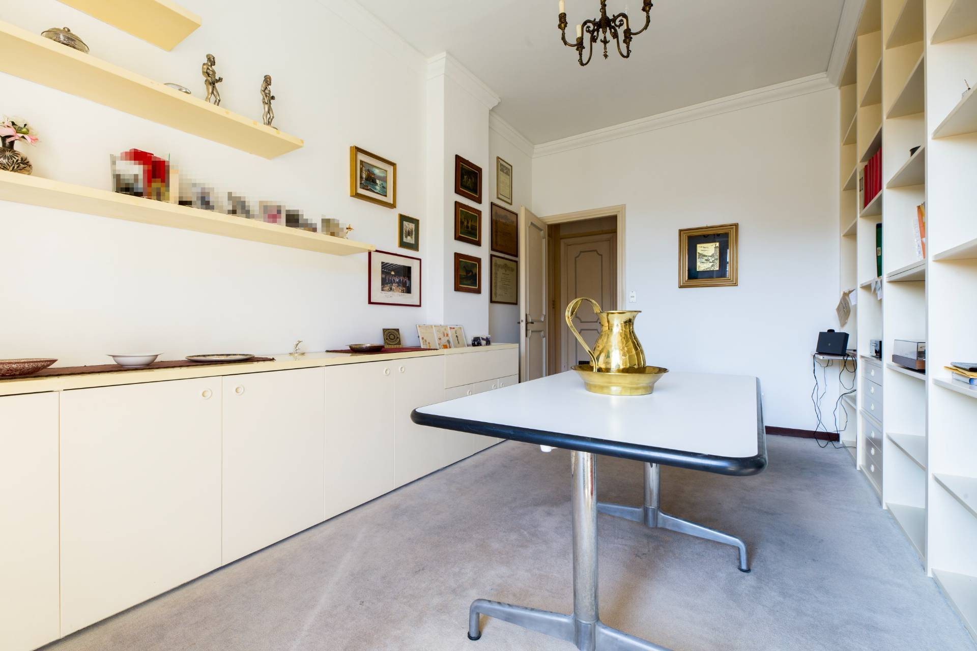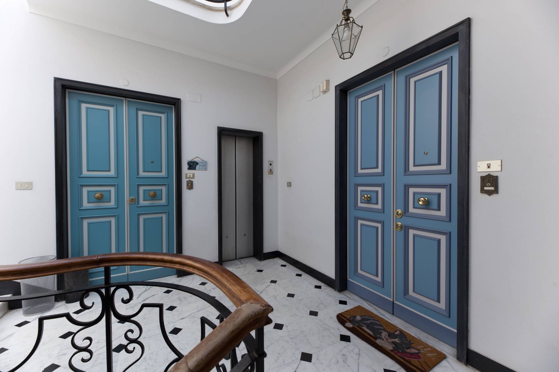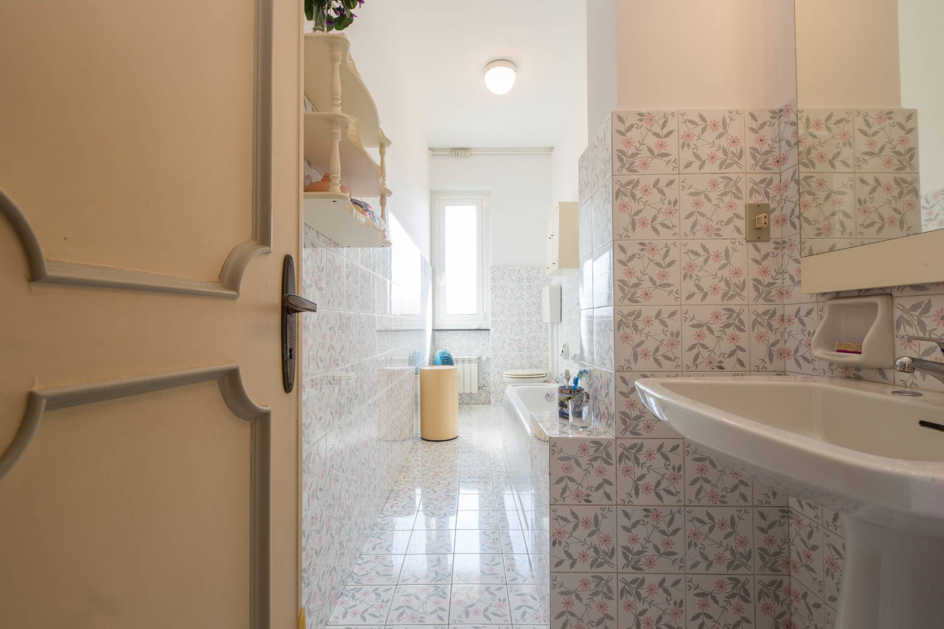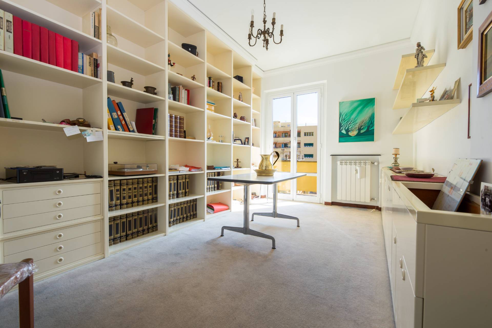 Un ampio ingresso si apre sullo splendido salone le cui grandi porte finestre conducono nel grande terrazzo al piano dalla incantevole vista sui tetti della zona, verde e mare.
