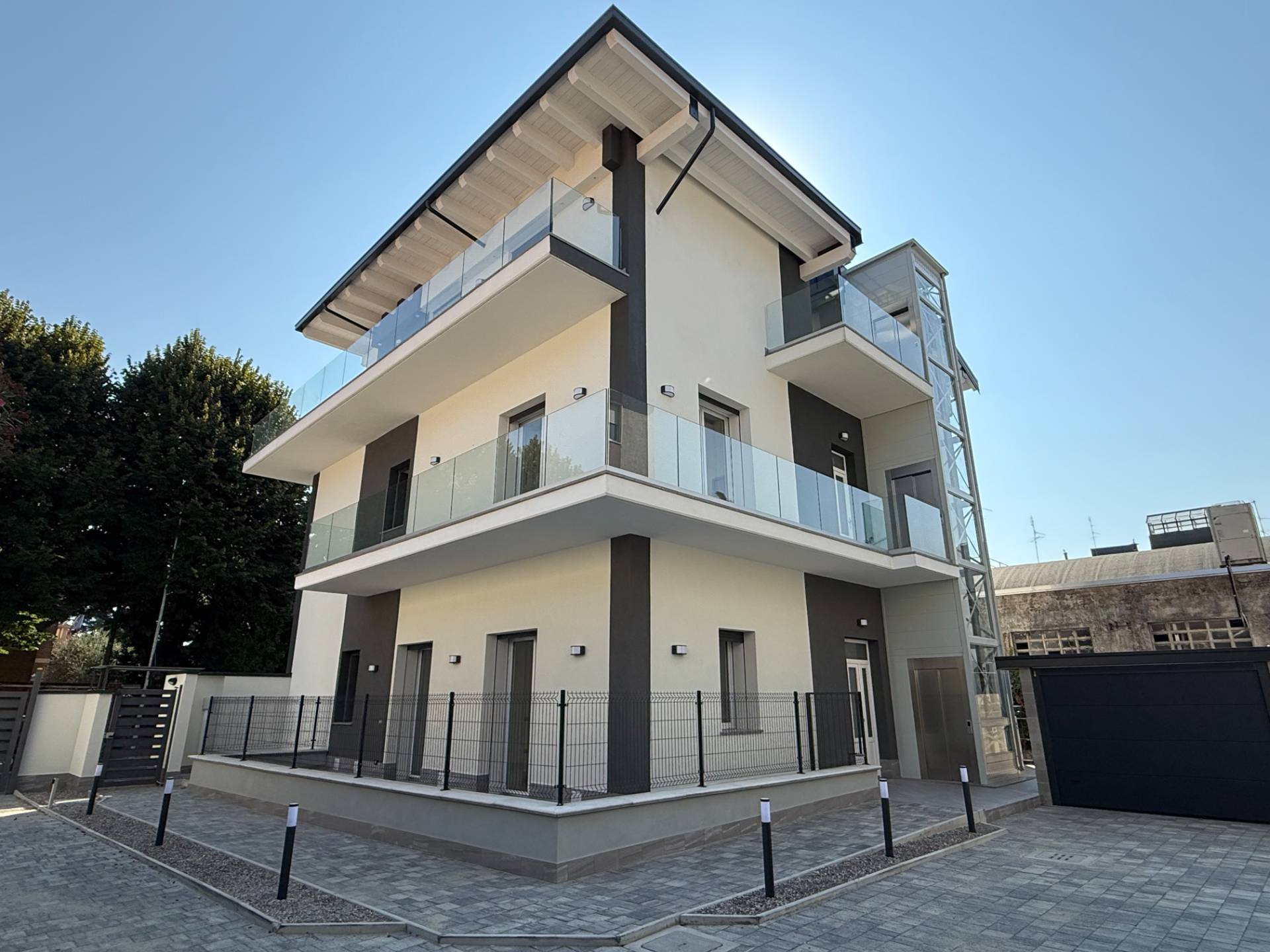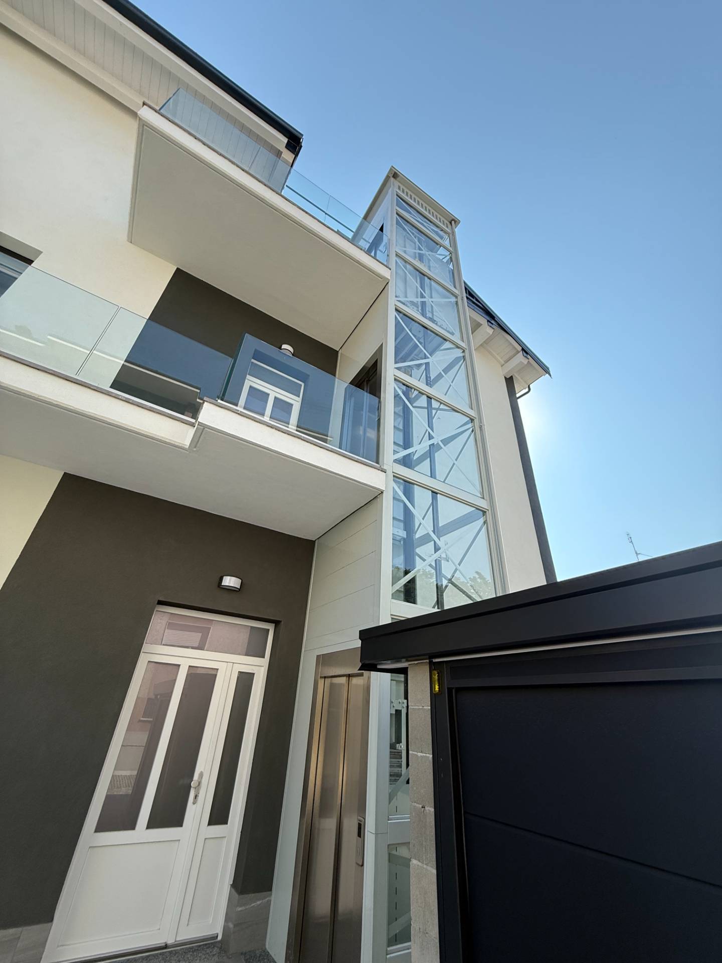 - Design Elegante: La facciata bianca con inserti grigio antracite e i balconi con parapetto in cristallo creano un'atmosfera moderna e sofisticata.