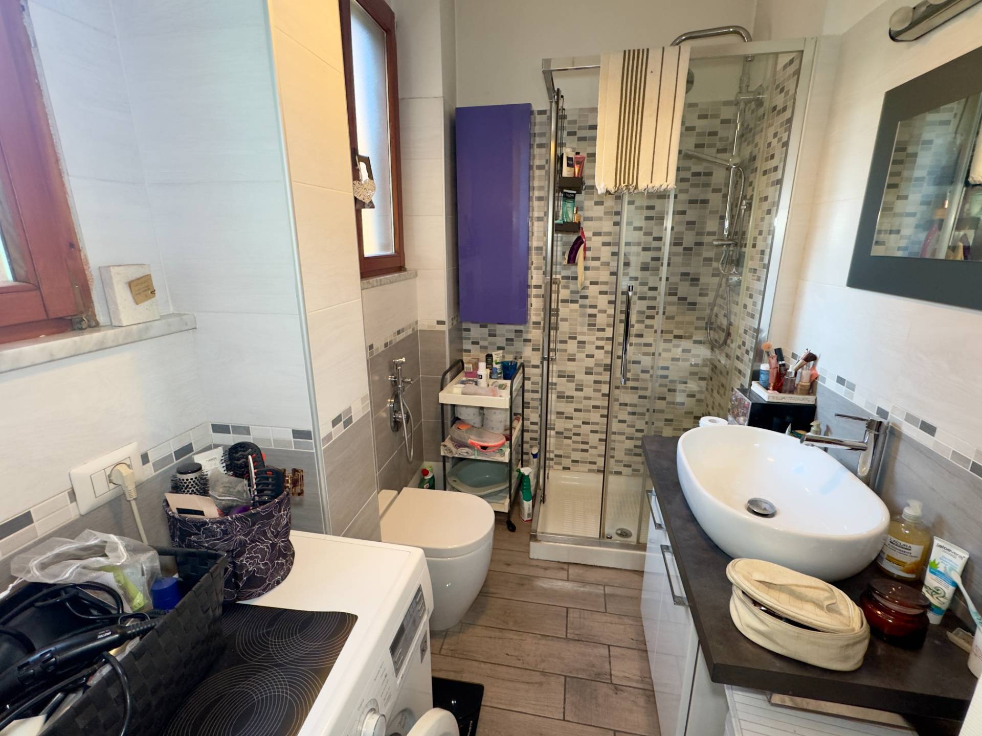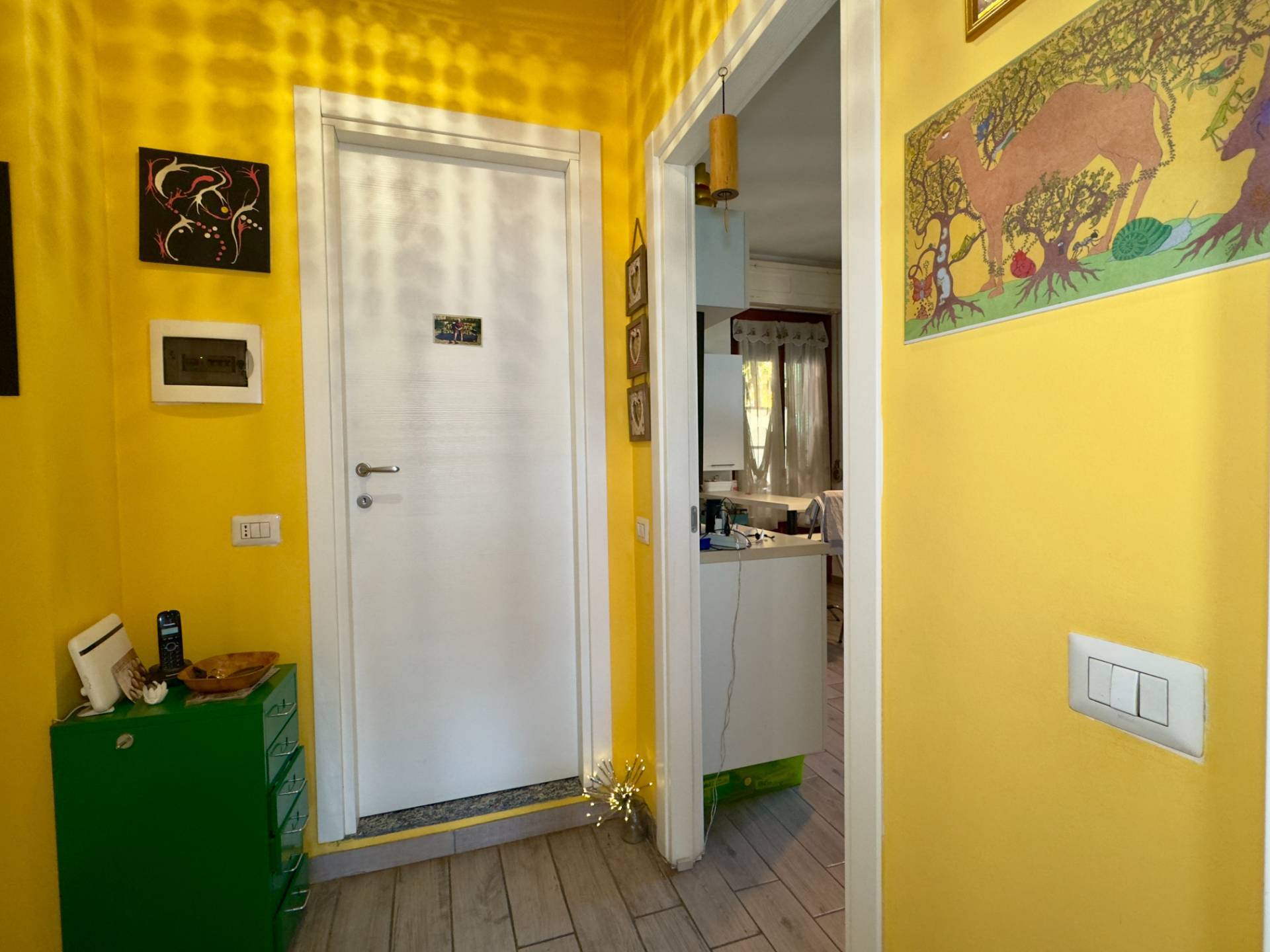 Gli interni sono moderni, grazie alla ristrutturazione totale avvenuta meno di 10 anni fa con pavimentazione in elegante gres porcellanato effetto legno, infissi in doppio vetro/PVC, impianto di aria condizionata (freddo/caldo) nella zona giorno.