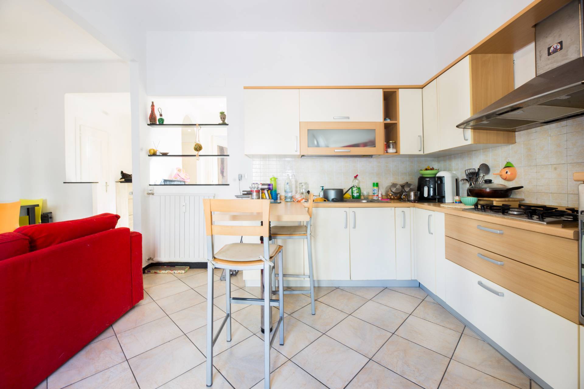 Dall' ingresso si accede direttamente alla zona giorno che accoglie soggiorno e cucina a vista completamente attrezzata. La zona giorno affaccia con due porte finestre sulla balconata.