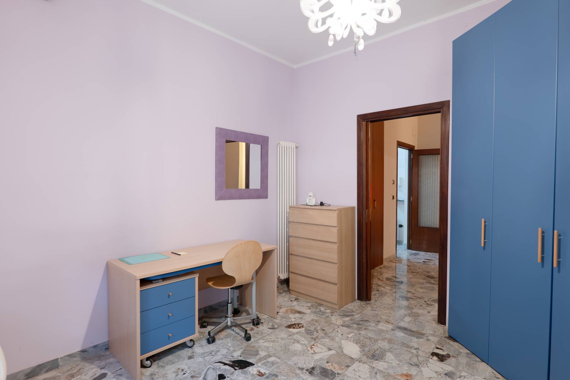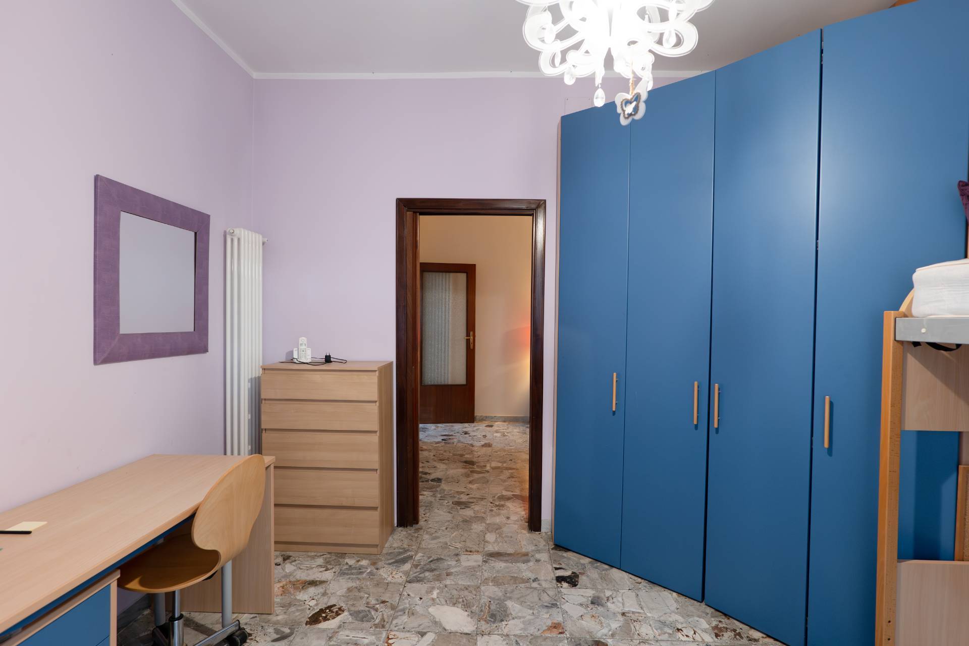 L´appartamento è composto da ingresso, ampio disimpegno, tre camere, cucina e bagno, ed è facilmente modulabile grazie alla presenza di un solo muro maestro, permettendo una ridistribuzione degli spazi senza interventi complessi.