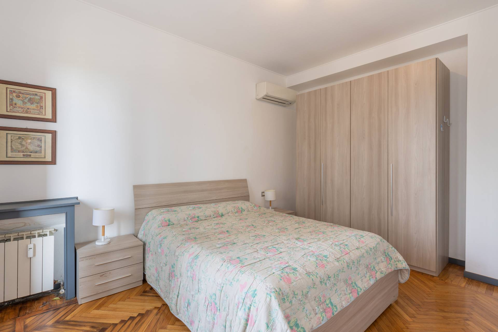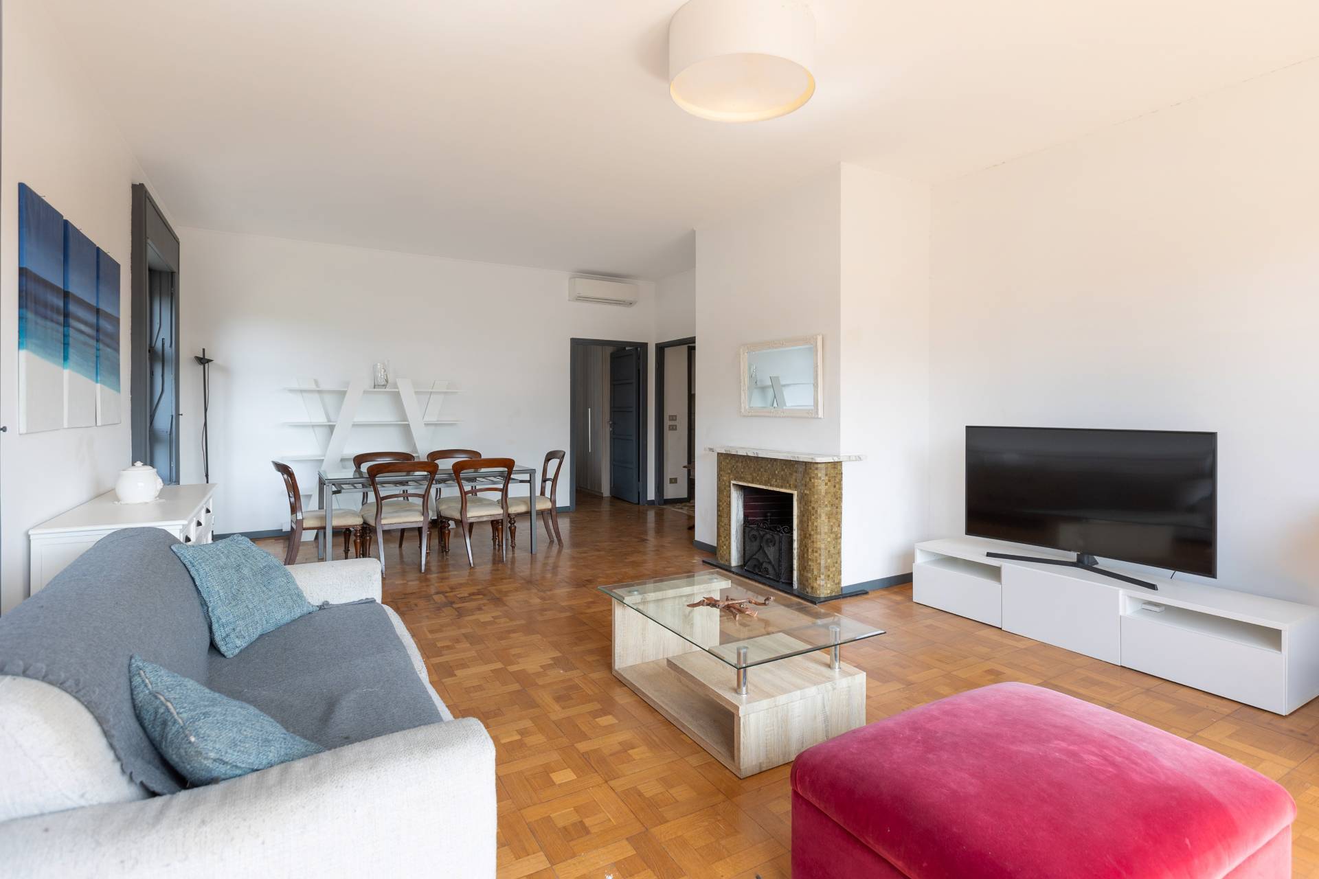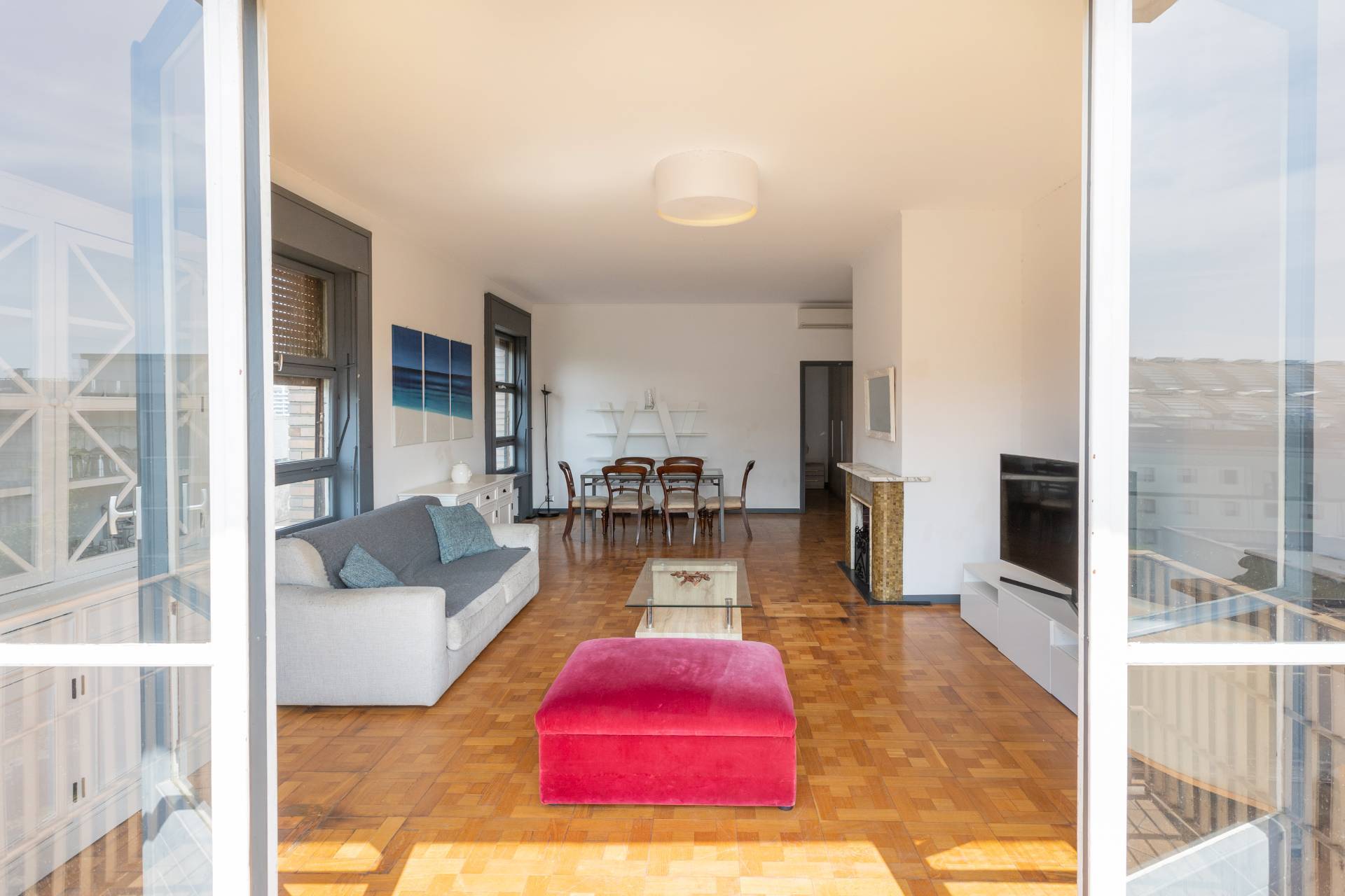 L´appartamento è rifinito con parquet nel soggiorno e nelle camere, ed è dotato di aria condizionata, riscaldamento centralizzato e infissi in buono stato.