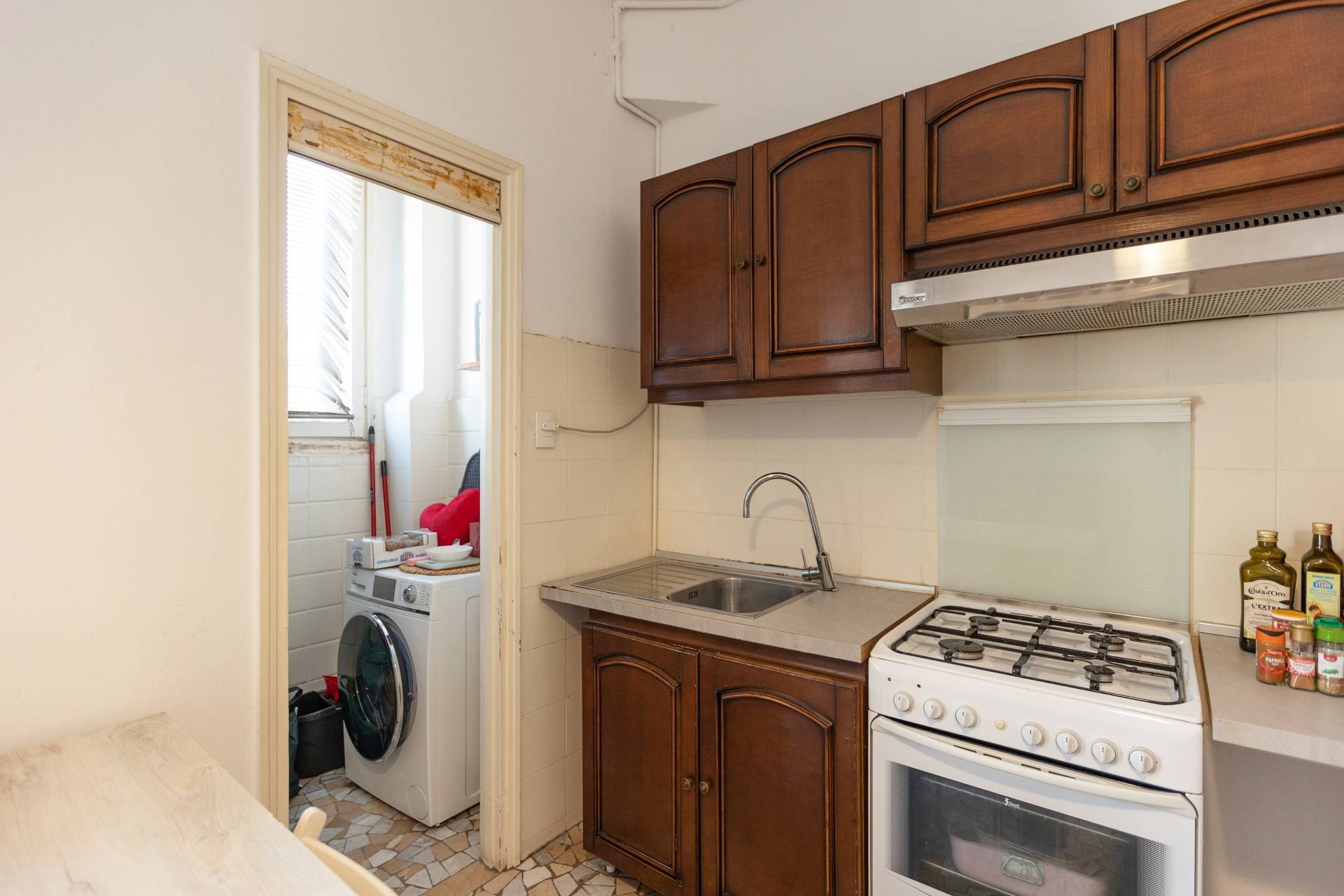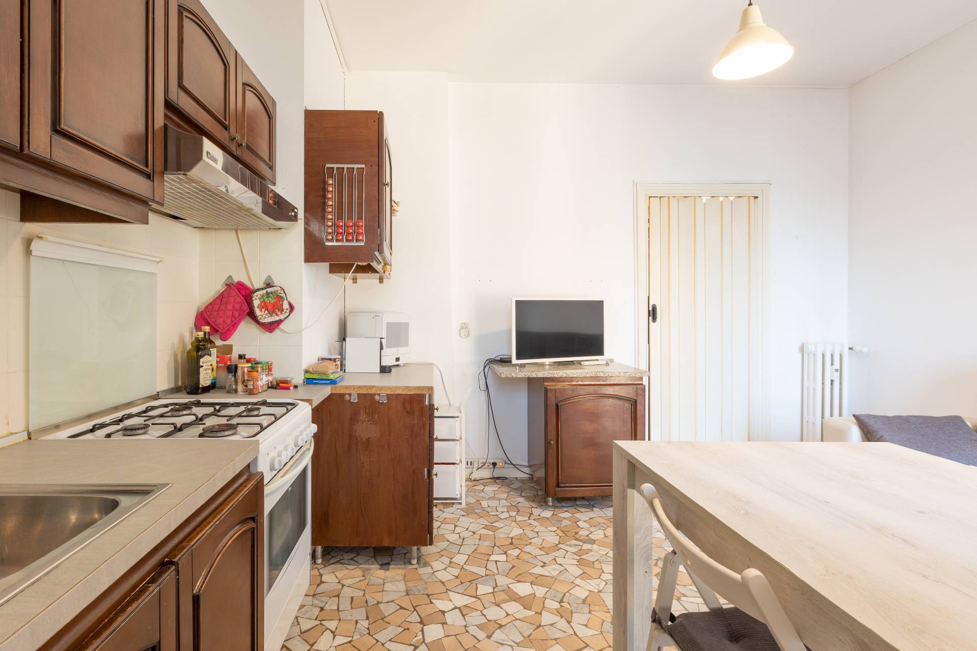 - cucina a vista attrezzata con elettrodomestici (piano cottura a gas, cappa aspirante, forno, frigorifero e congelatore)