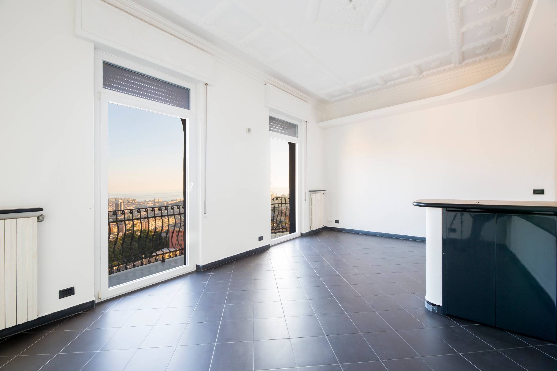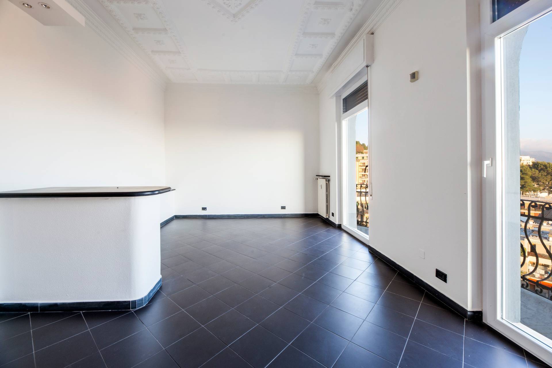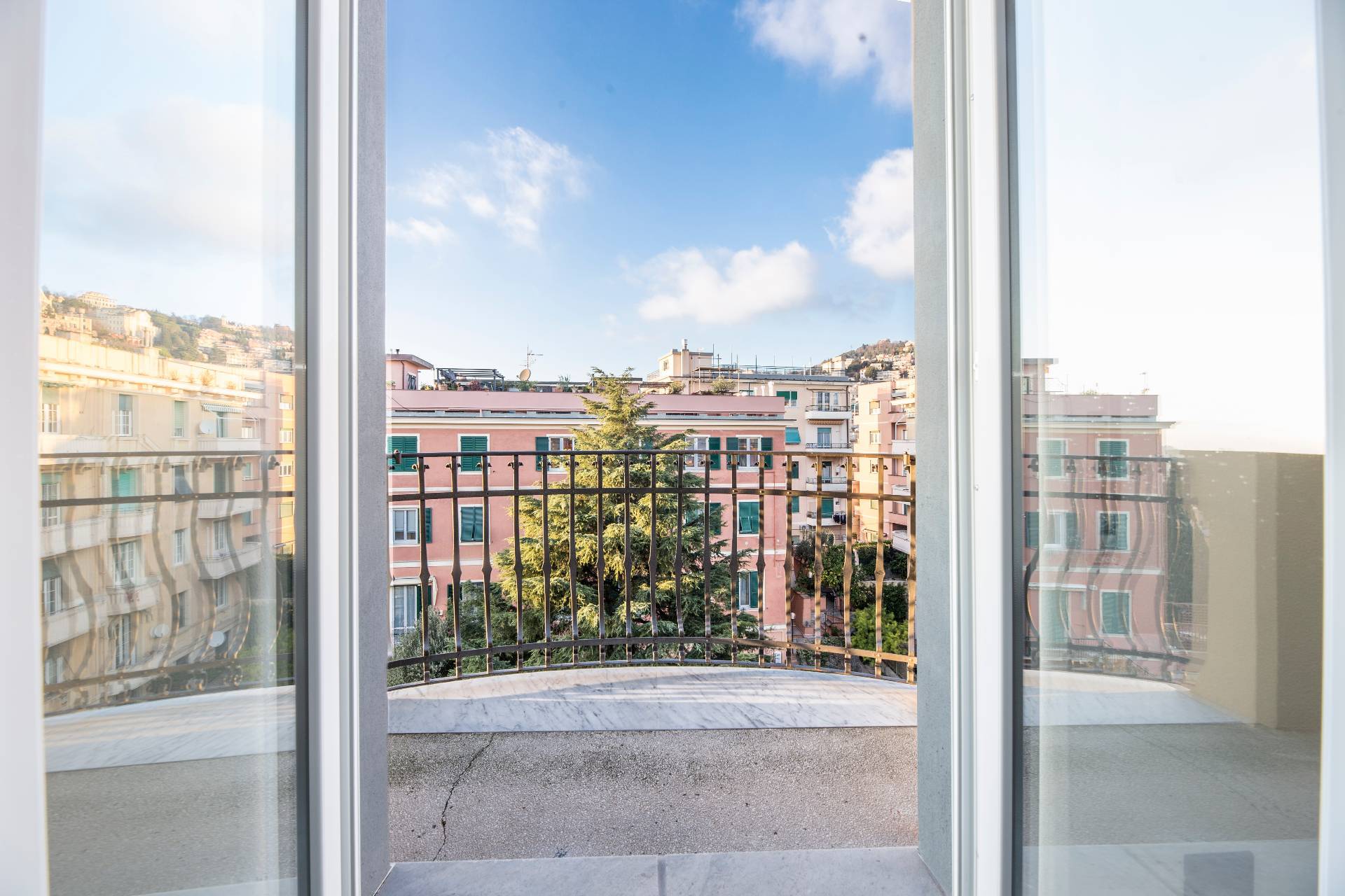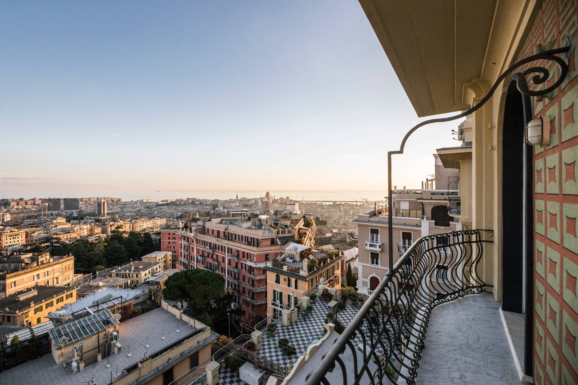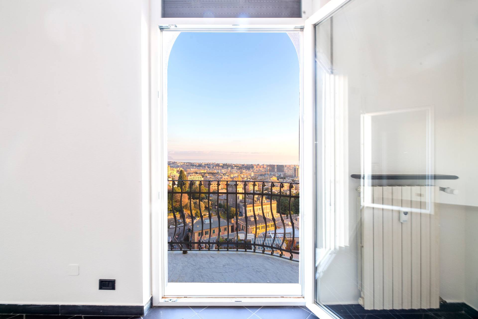 VIA CROCCO GENOVA CASTELLETTO SIGNORILE APPARTAMENTO ULTRAPANORAMICO ULTIMO PIANO IN AFFITTO CON CINQUE BALCONI, BOX AUTO E TERRAZZO SOVRASTANTE.