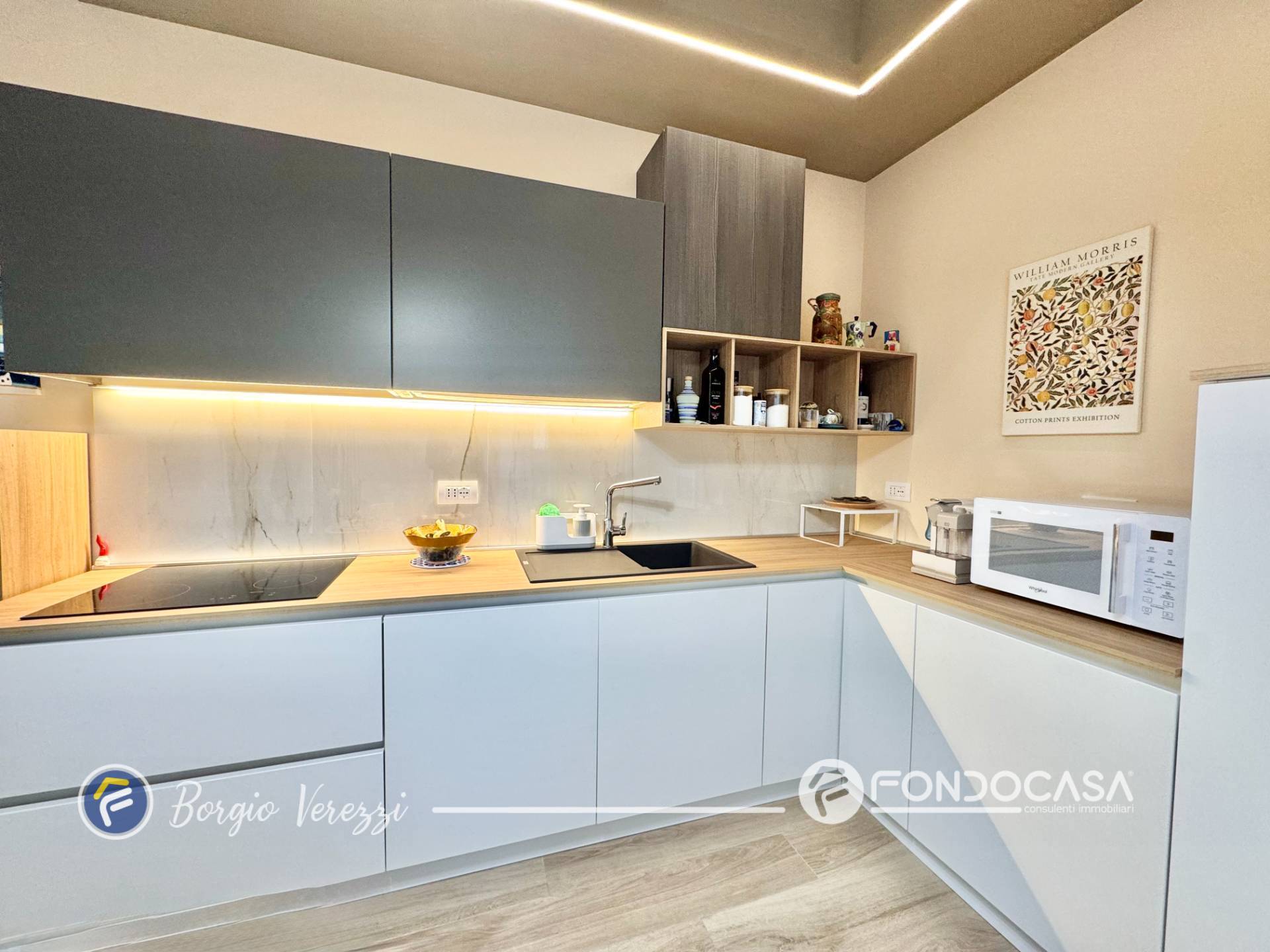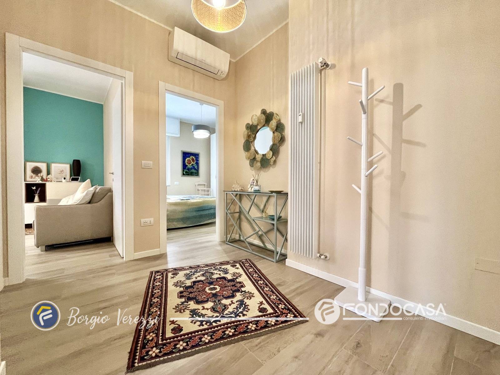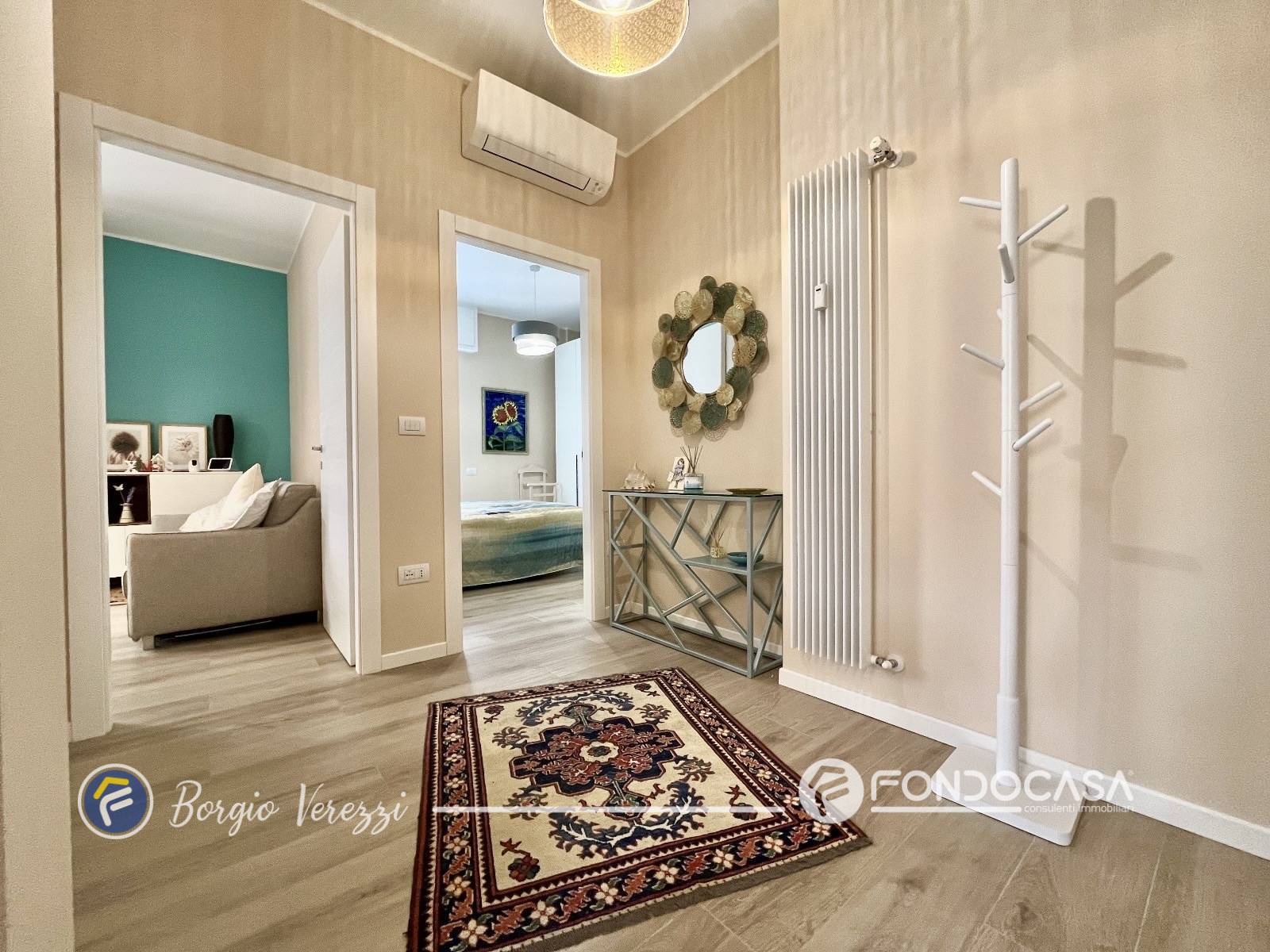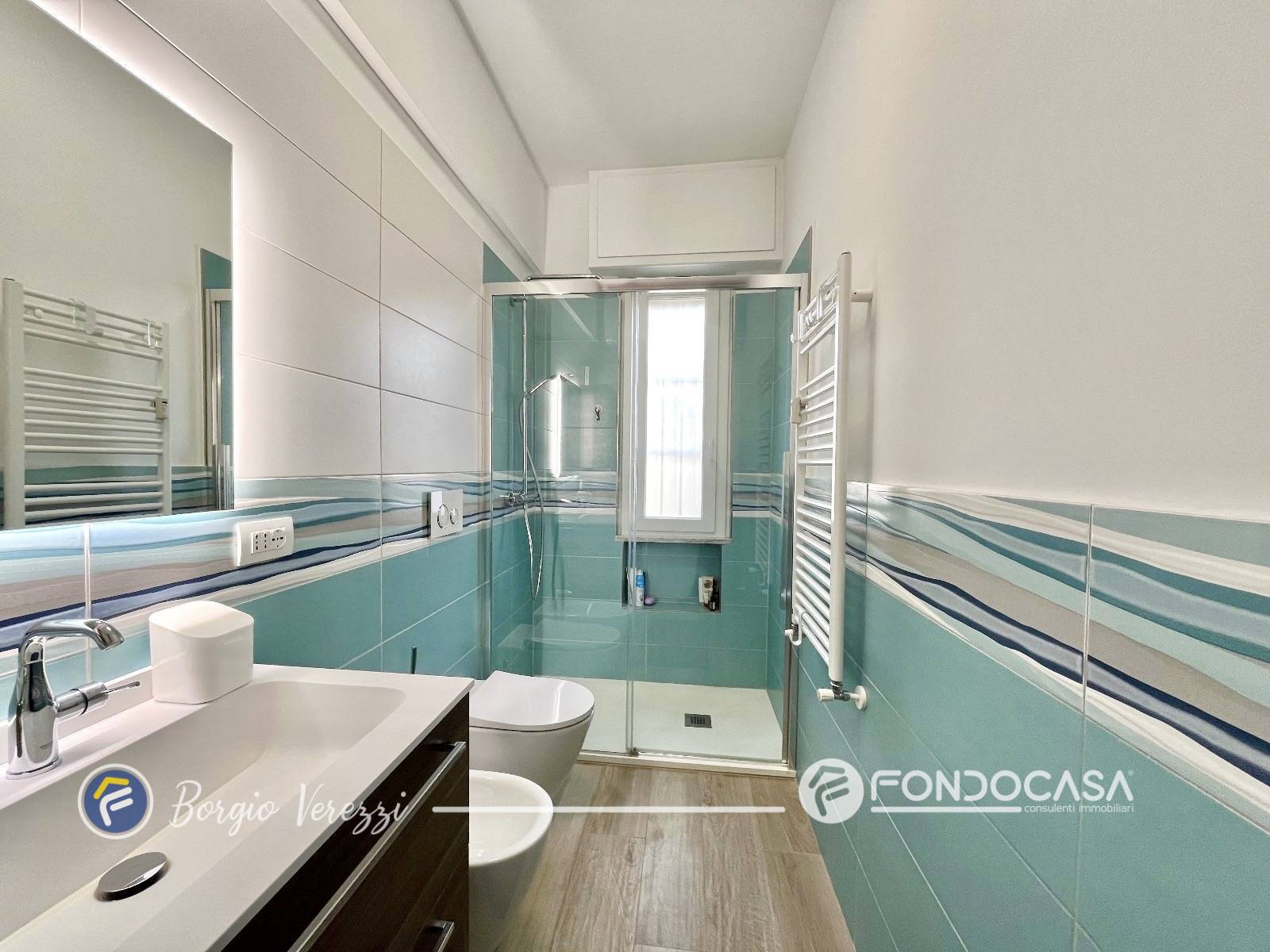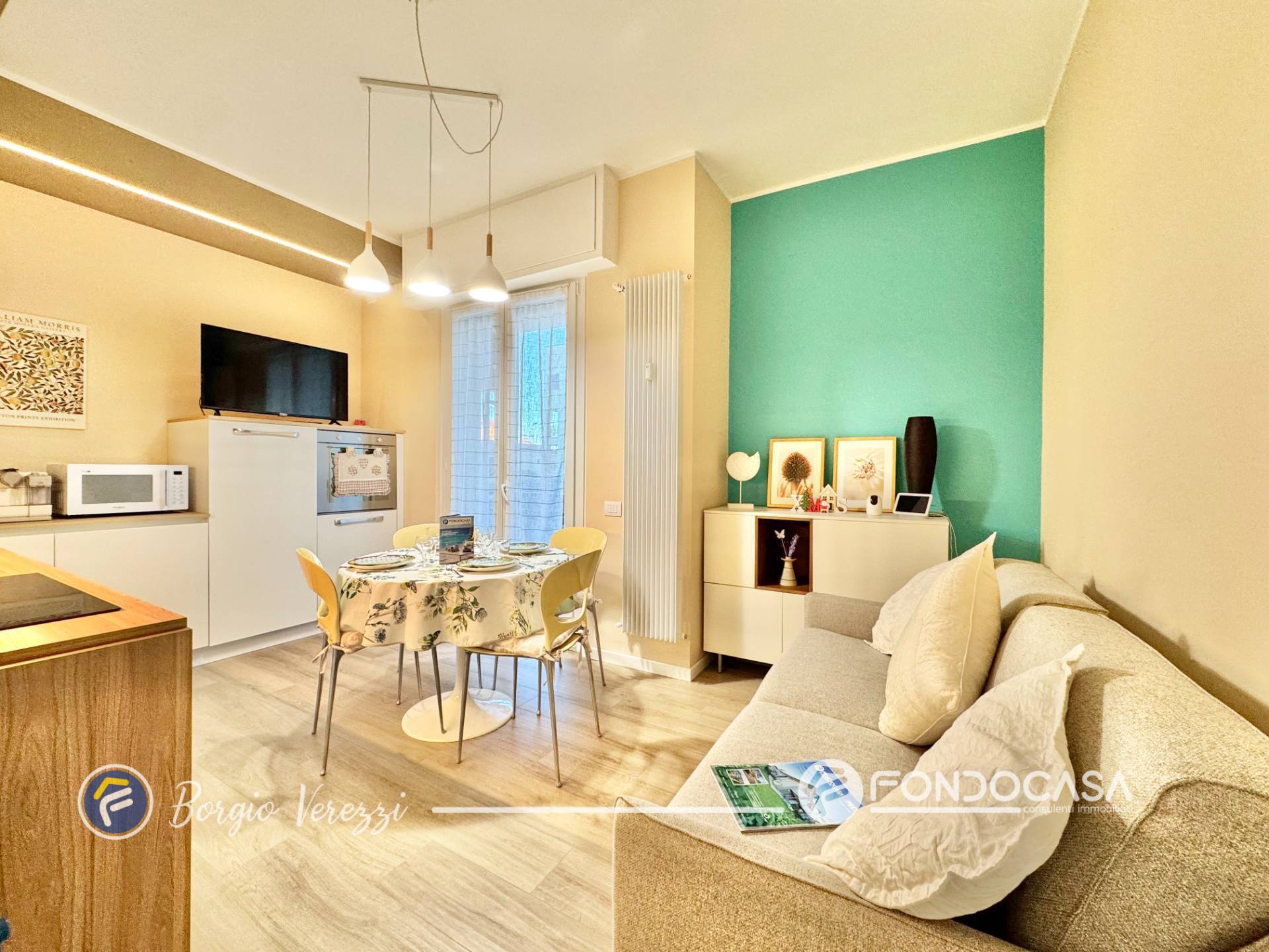 L´appartamento, finemente rinnovato, offre una moderna zona giorno con cucina a vista, due camere da letto, un elegante bagno finestrato con doccia e un pratico ripostiglio.
