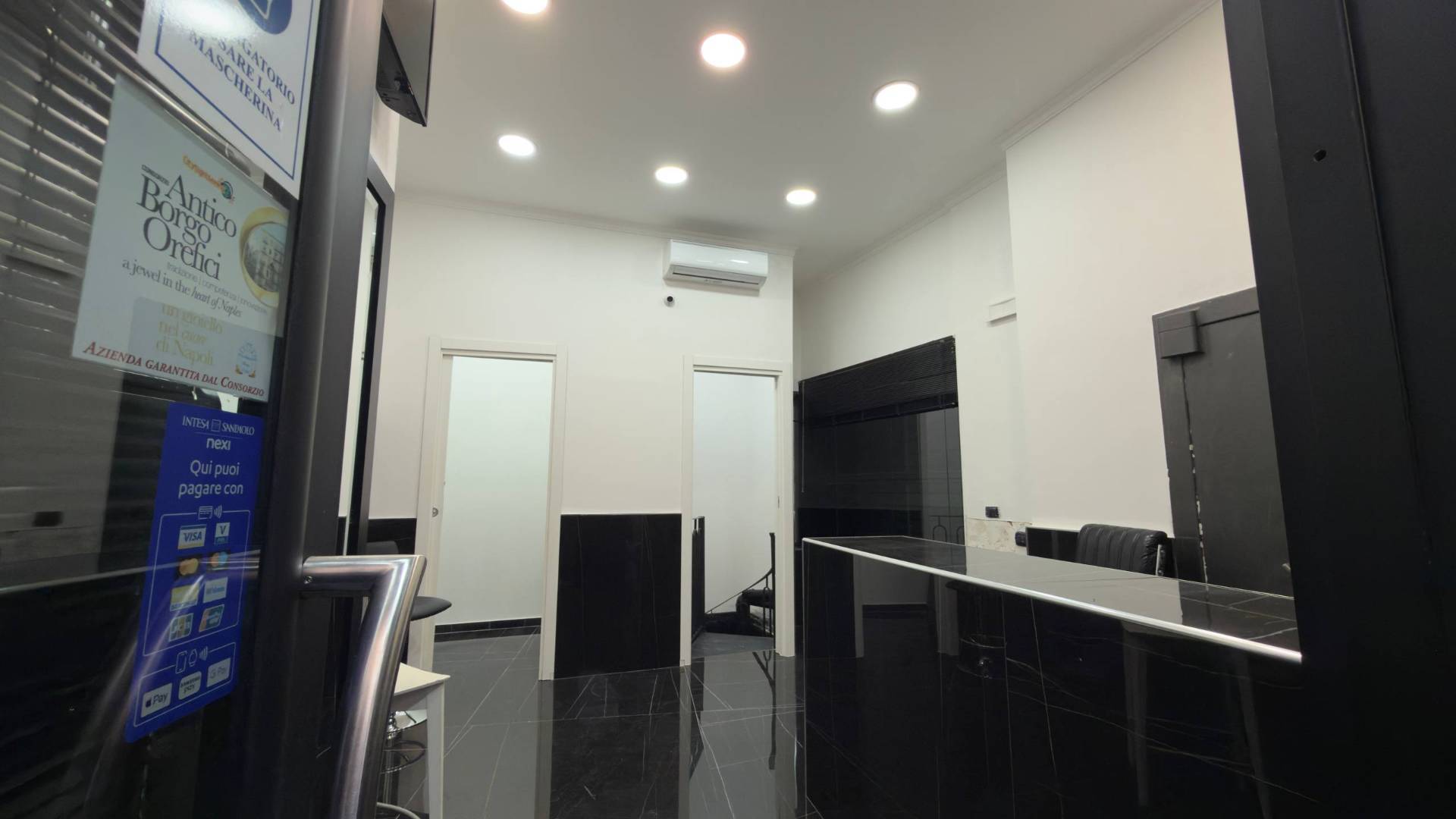 Il locale è dotato di tutti i comfort necessari per garantire un ambiente accogliente e funzionale, come impianti di aria condizionata e allarme.