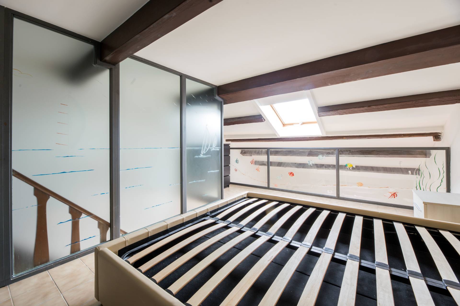 Una casa di grande fascino movimentata su due livelli con ingresso in grande sala con ampie e luminosissime finestre, da un lato il grande bagno con vasca idromassaggio e doccia, la cucina abitabile di buone dimensioni, dal lato opposto la camera da letto matrimoniale e al centro della sala la bellissima scala in legno, molto comoda con ampi scalini che conduce al piano superiore in cui troviamo la seconda camera da letto, un bagno in camera e un disimpegno molto caratteristico che può essere utilizzato ad esempio come cabina armadi.