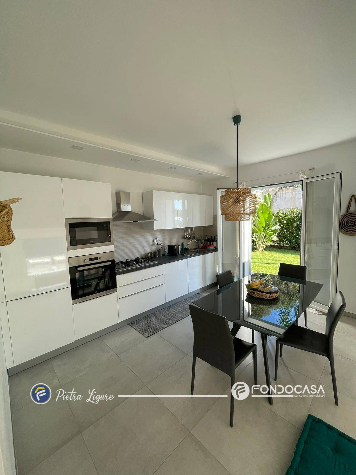 Dalla cucina si accede direttamente alla parte verde della proprietà, rendendo gli spazi pratici e funzionali nella vita quotidiana.