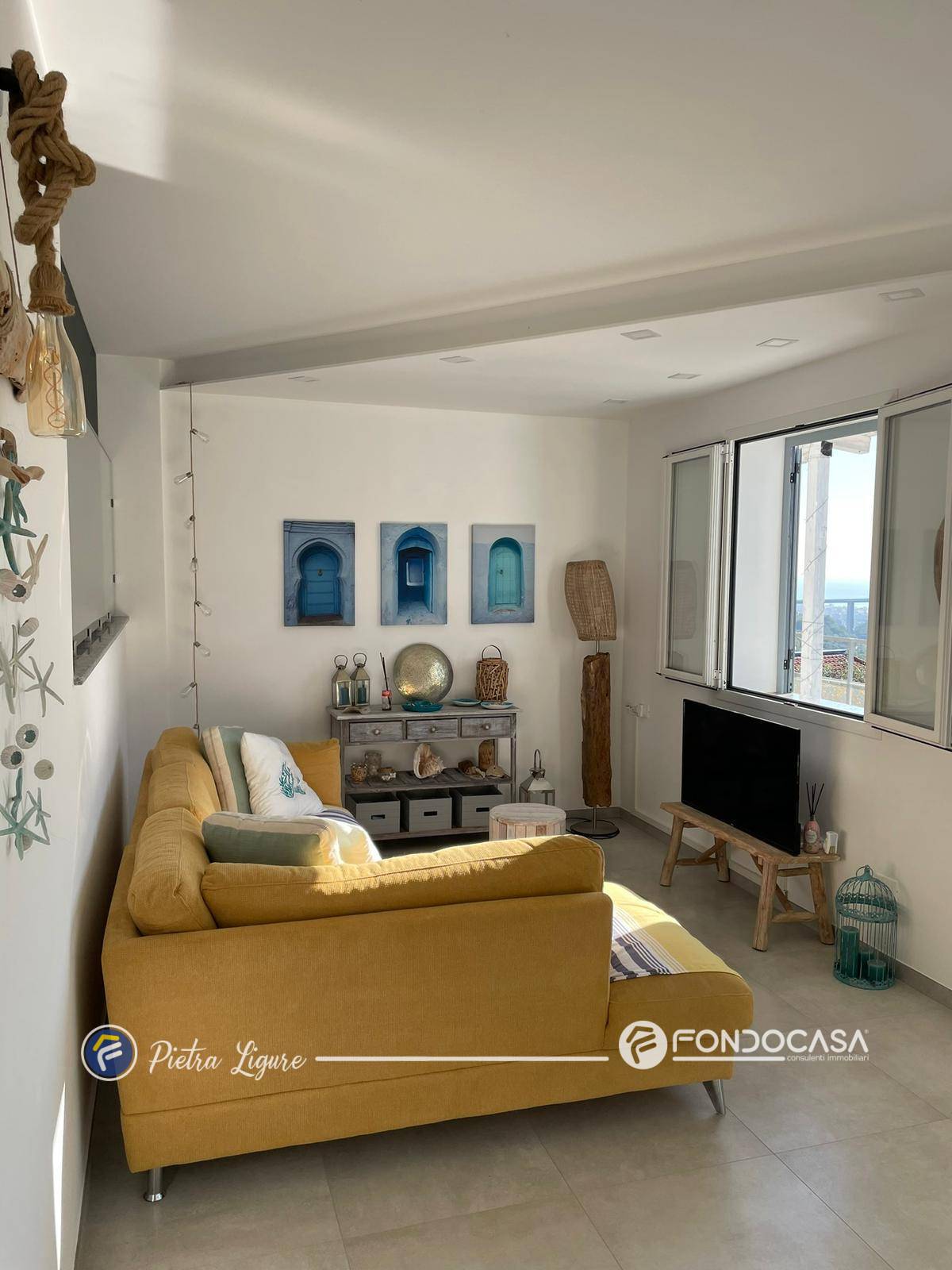 Il soggiorno ci accoglie in un ambiente luminoso e ben proporzionato; una scaletta conduce al piano rialzato dove si sviluppano la cucina abitabile, una prima camera da letto e un bagno finestrato.