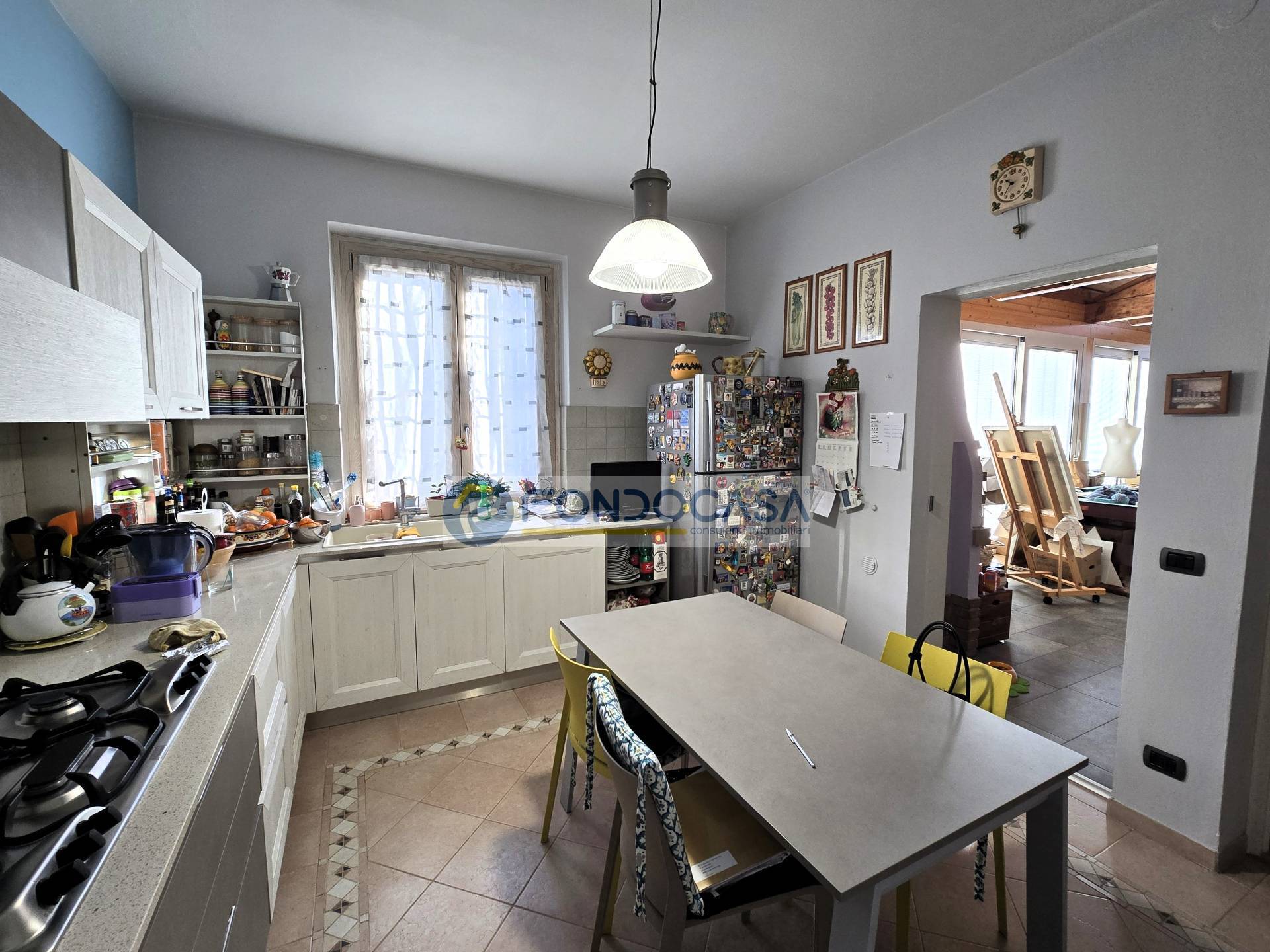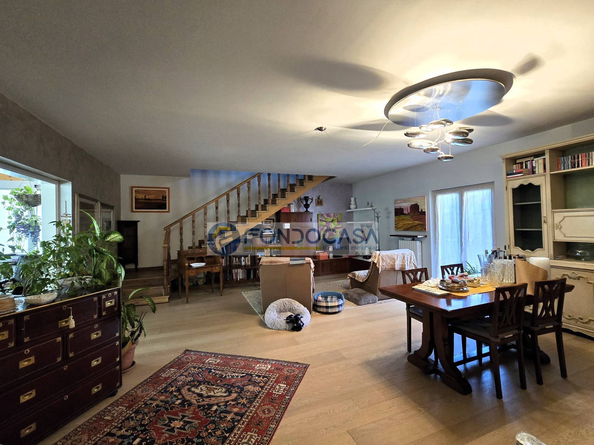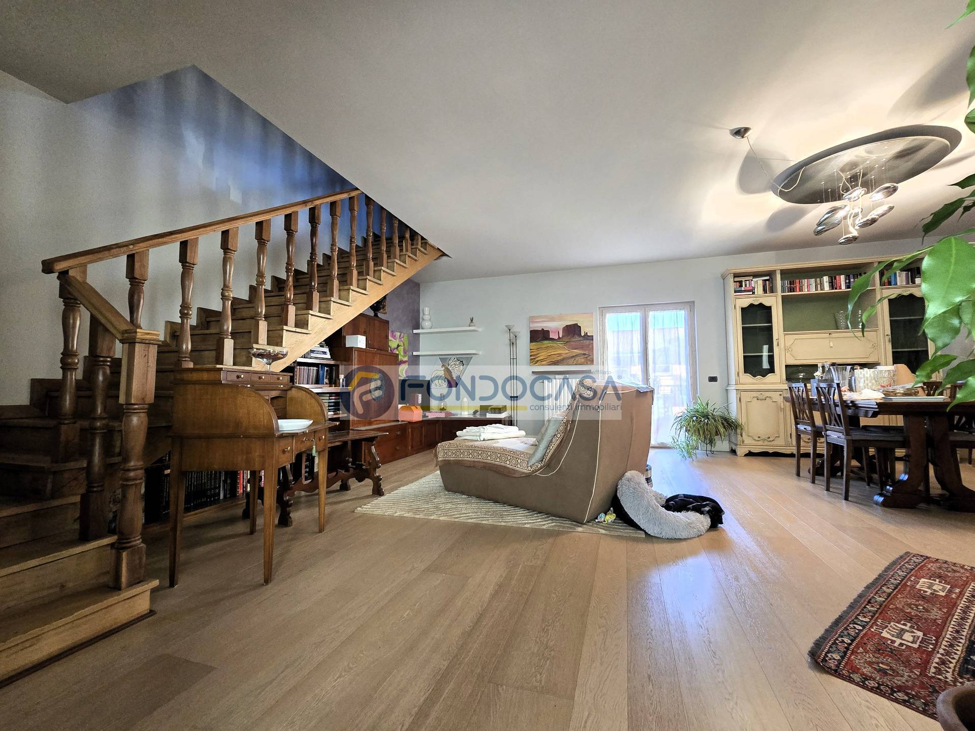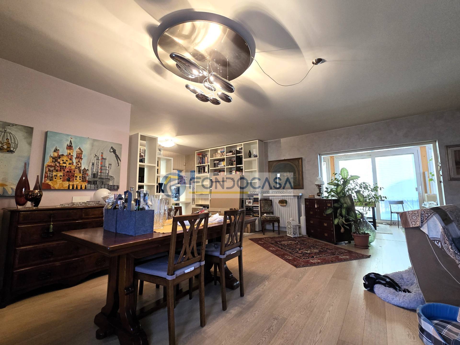Una zona living d'impatto ci accoglie all'ingresso, con un ampio salone impreziosito da pregiato parquet, una comoda e funzionale cucina abitabile ed un altro piacevole ambiente in cui importanti vetrate fanno da cornice.