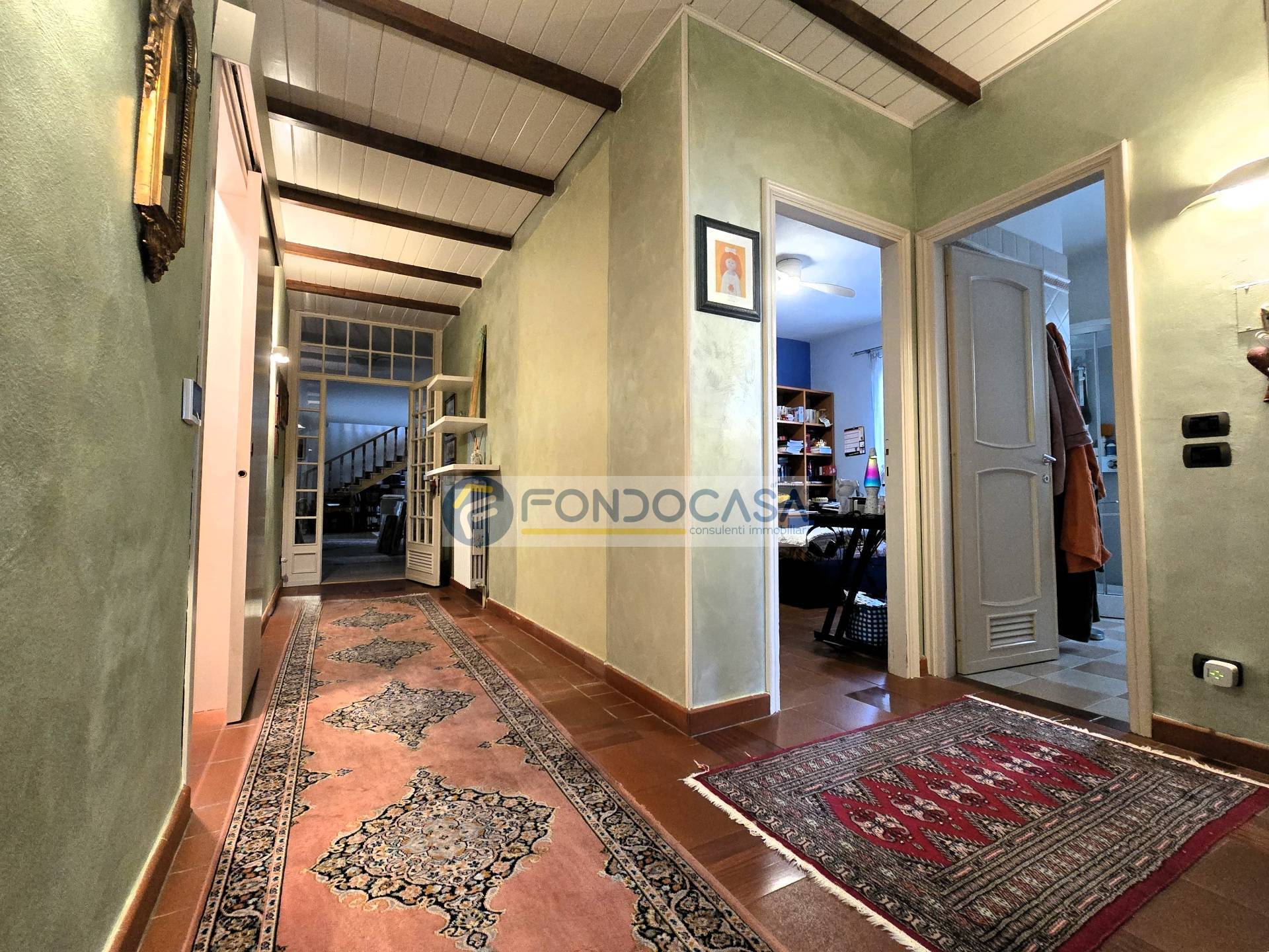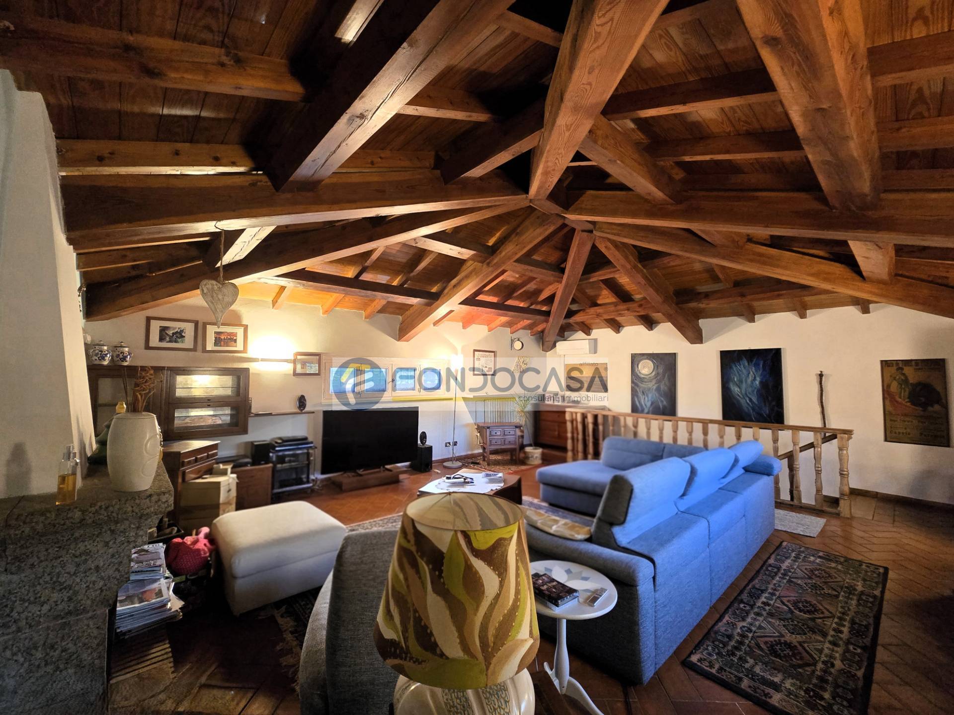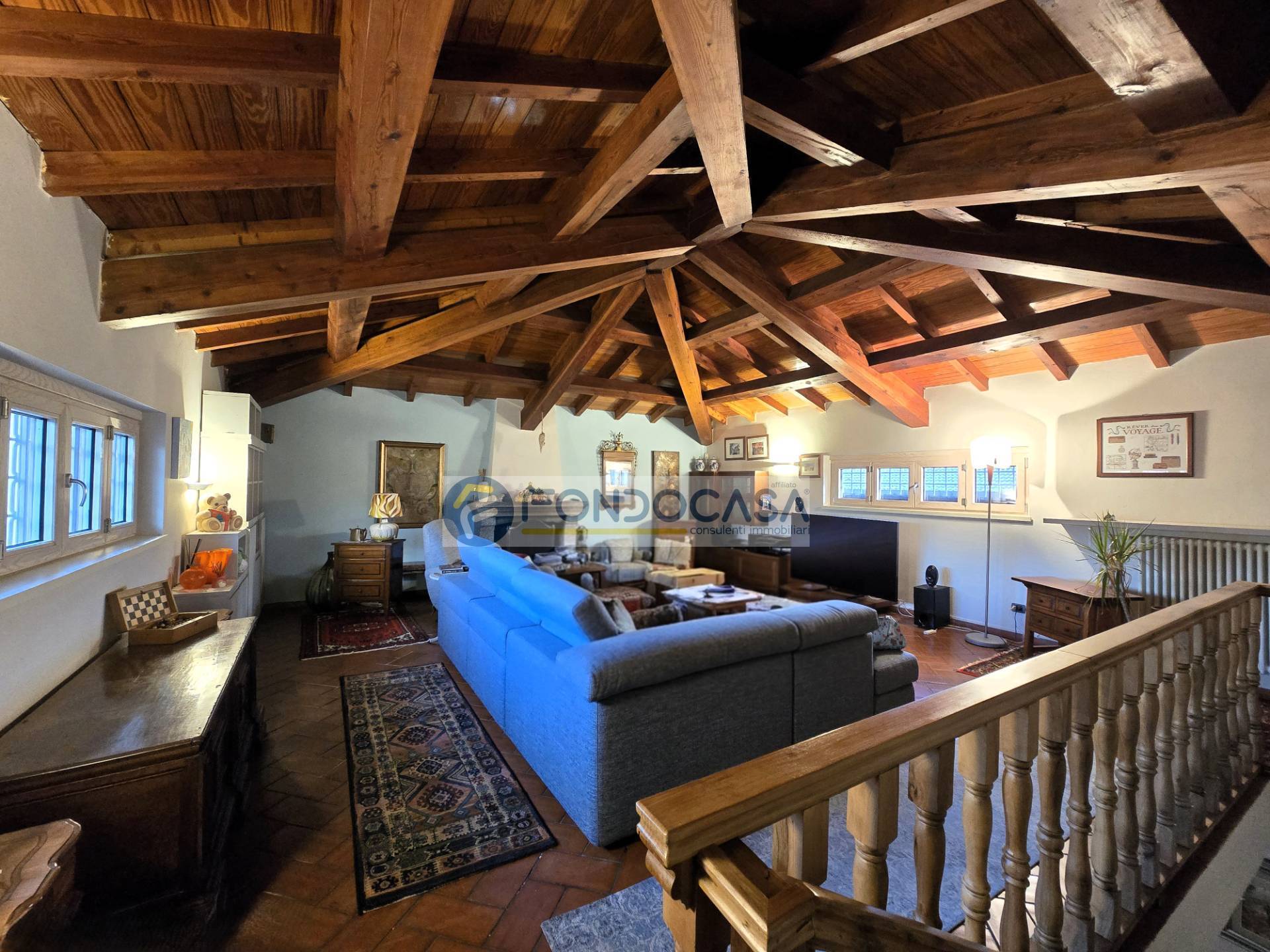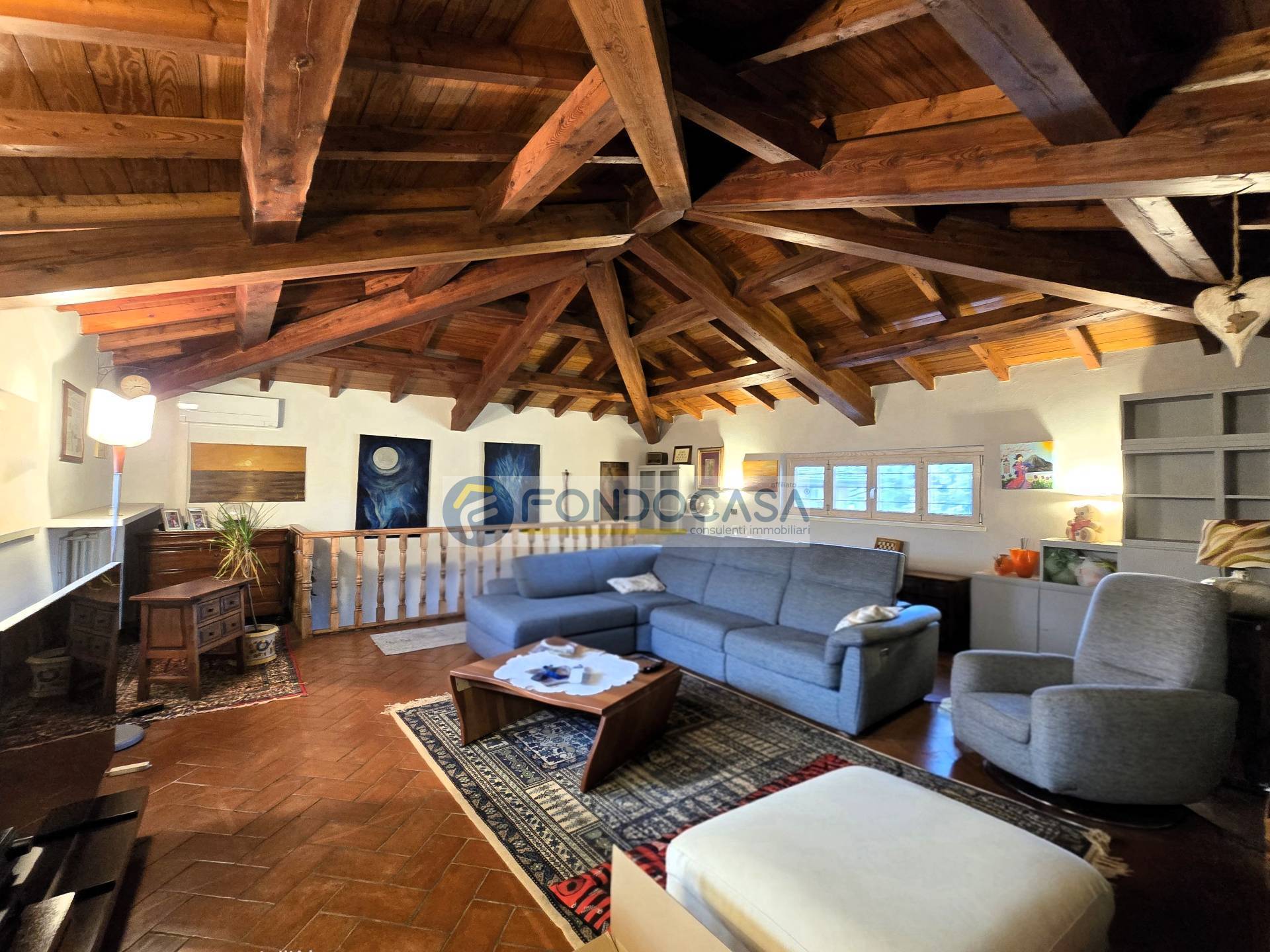 Da qui, ci accompagna al piano superiore una scala in legno pregiato, che conduce ad una generosa mansarda molto caratteristica, ideale sia come ulteriore e raccolto salotto, sia come un'elegante master bedroom; spiccano pavimenti in cotto antico, travi in legno ed un grande camino in pietra.