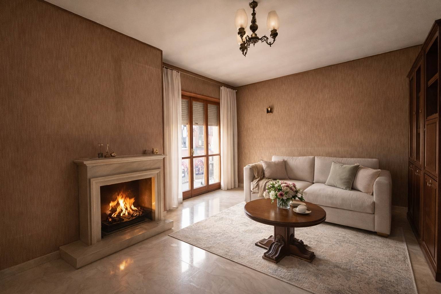 Il vero cuore dell´abitazione è l´ampio e luminoso salone con camino, uno spazio caldo e conviviale perfetto per vivere la casa in ogni stagione.