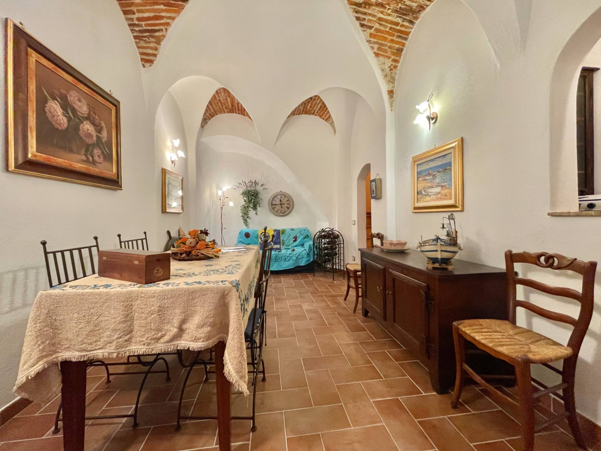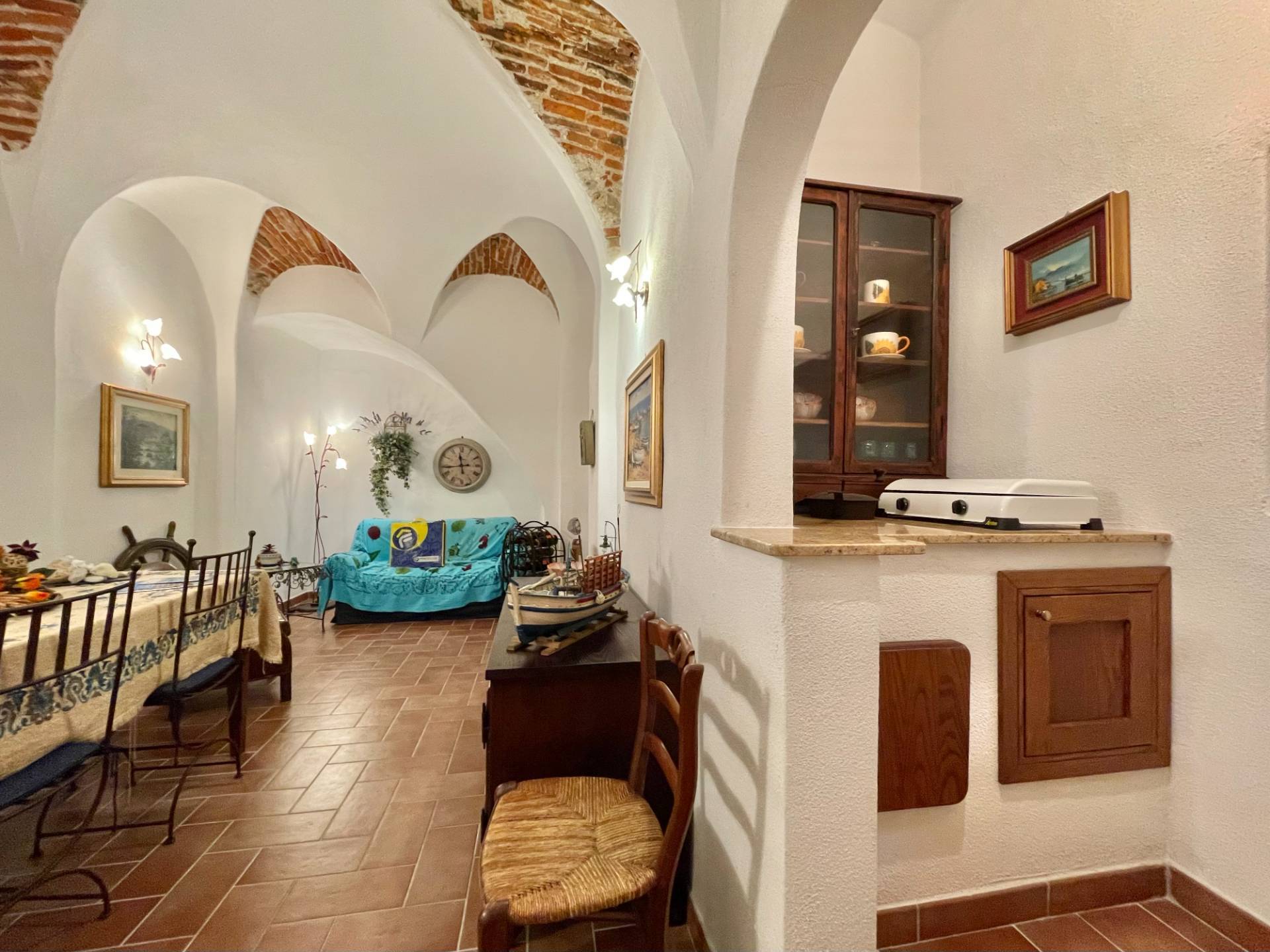 Al piano strada l'ingresso conduce, tramite una prima scala interna, alla zona giorno composta da un' accogliente sala caratterizzata dai tipici soffitti a volta liguri; proseguendo si sale alla zona notte dove troviamo un'ampia camera matrimoniale ed un bagno finestrato con box doccia. Infine, al secondo ed ultimo piano, un'abitabile cucina a vista, luminosa e ben organizzata, con sfogo diretto su un terrazzo esterno ideale per momenti di relax o convivialità, un vero valore aggiunto in pieno centro storico.