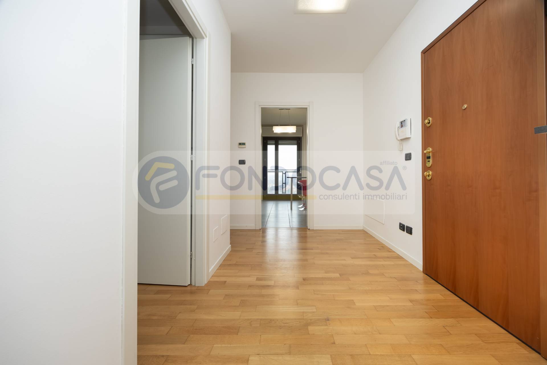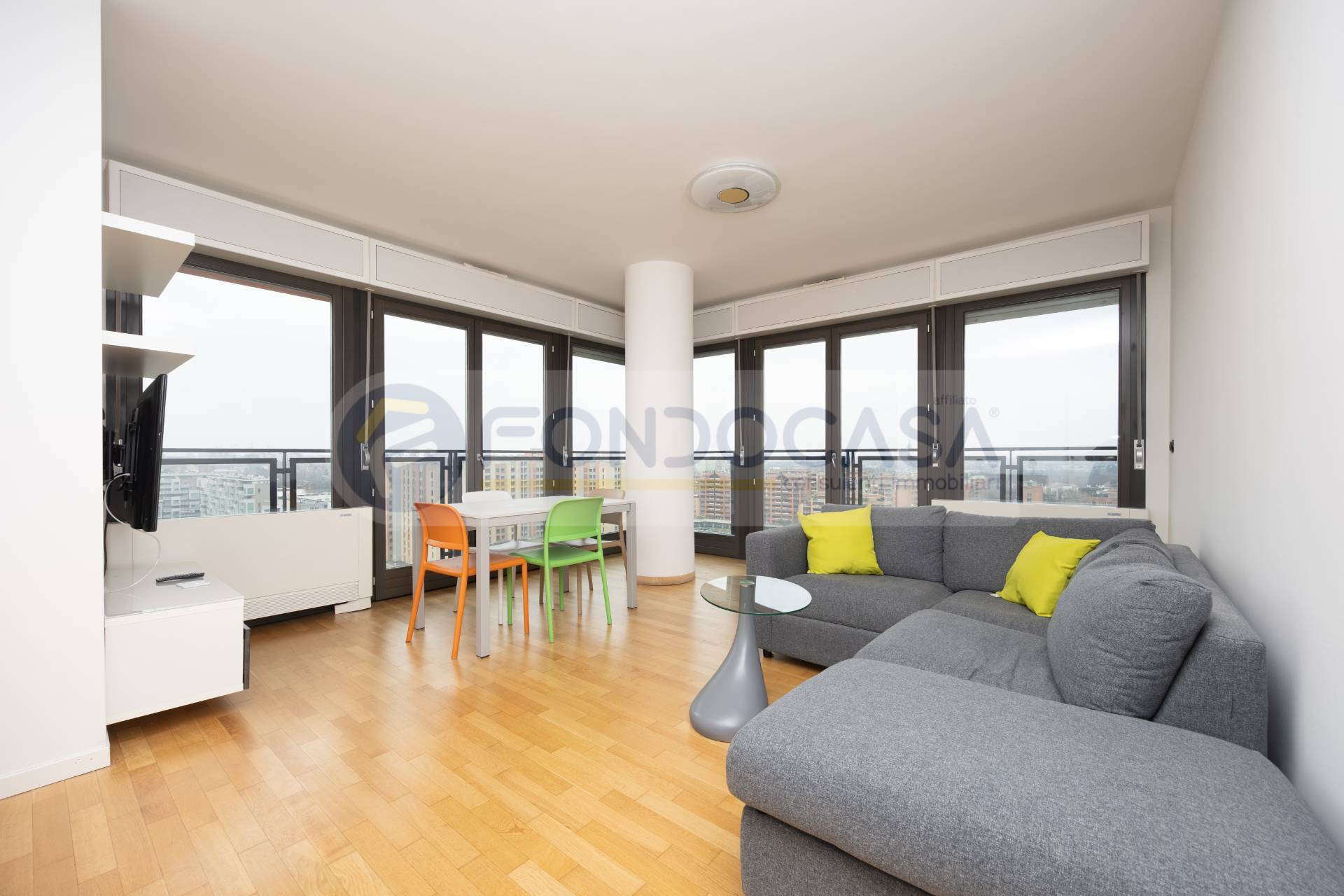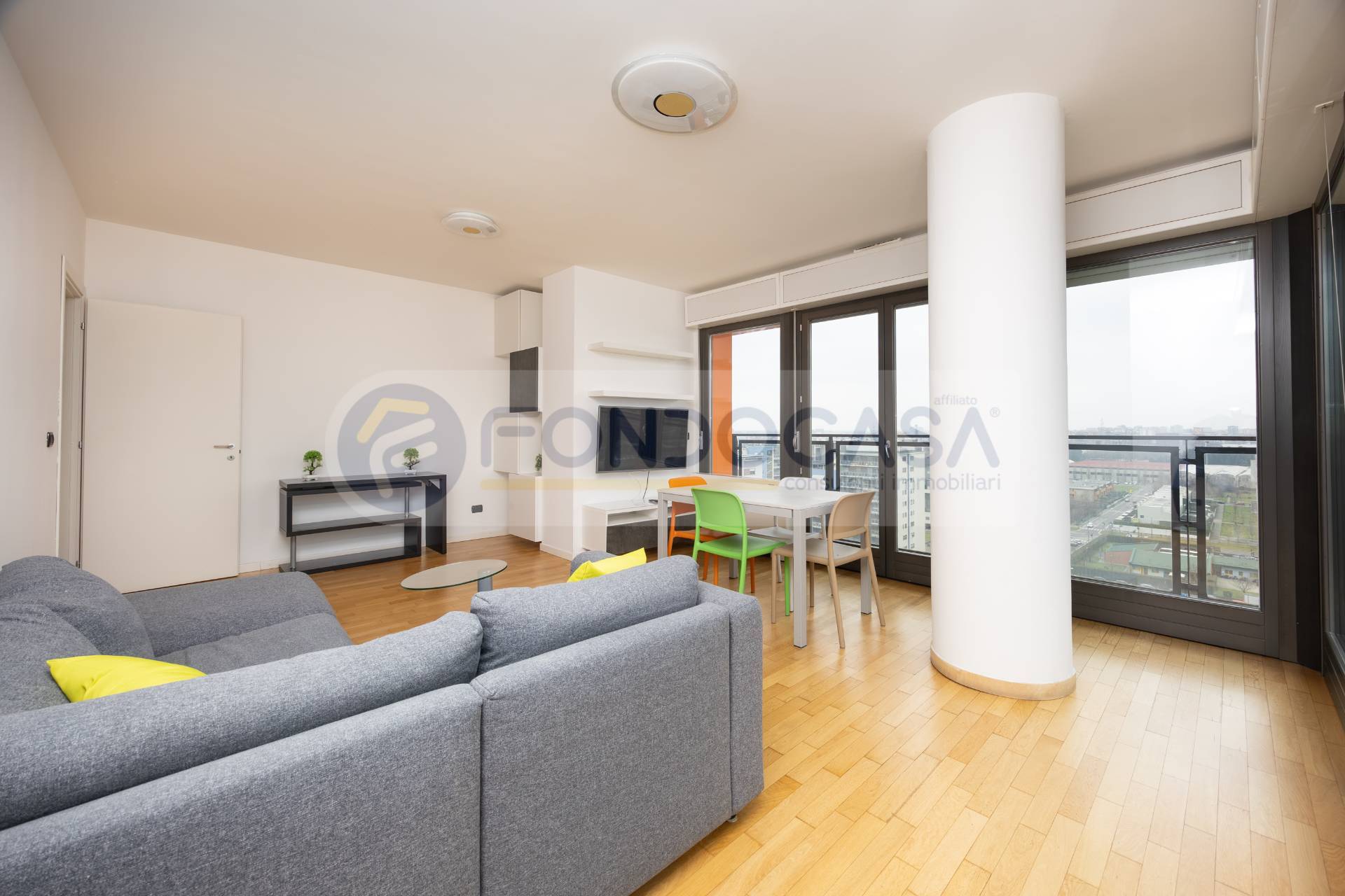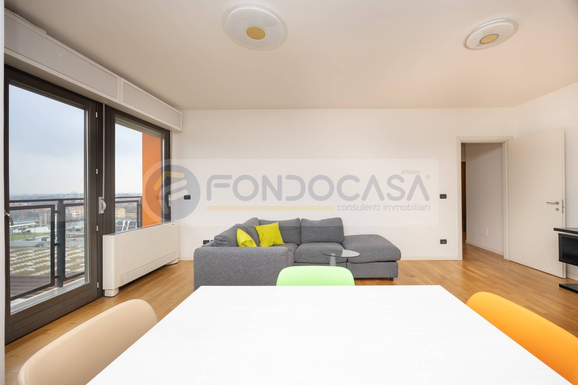Luminosissimo ed ampio bilocale di 86mq, mantenuto in ottimo stato interno, con un bellissimo terrazzo angolare che circonda tutta l'abitazione, permettendo l'accesso da tutte le stanze ed offrendo una vista invidiabile sulla città e sull'arco alpino, a quasi 360 gradi. L'appartamento si sviluppa partendo da un disimpegno d'ingresso, proseguendo verso un'ariosa zona living, caratterizzata da ampie vetrate che consentono di godere di ottima luminosità, affiancata da un'elegante e spaziosa cucina abitabile, una camera da letto matrimoniale di comoda metratura ed infine un bagno finestrato. La disposizione degli spazi interni si presenta molto funzionale, con la possibilità di creare una seconda camera ed impreziosito da un arredamento in ottimo stato, moderno e giovanile.