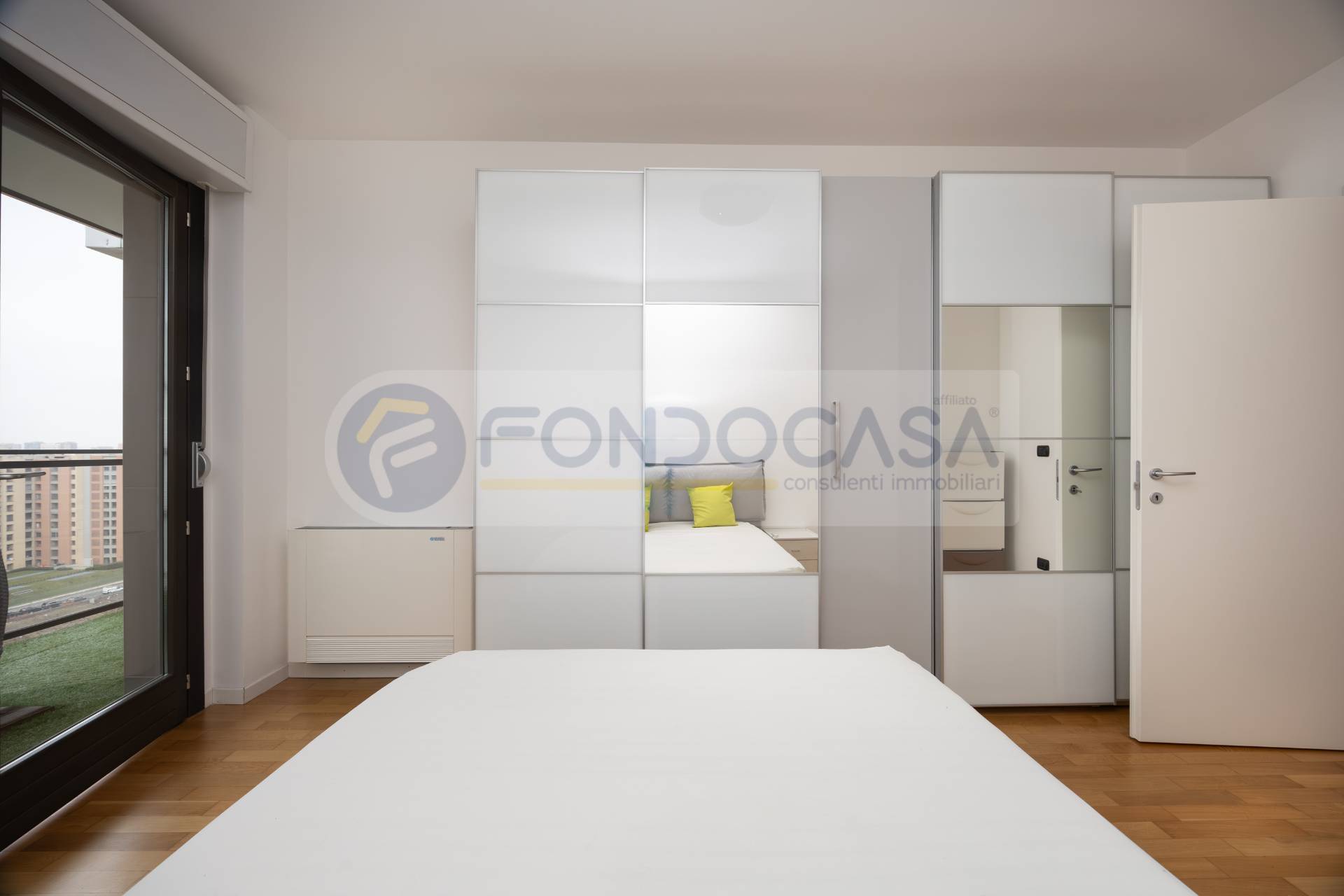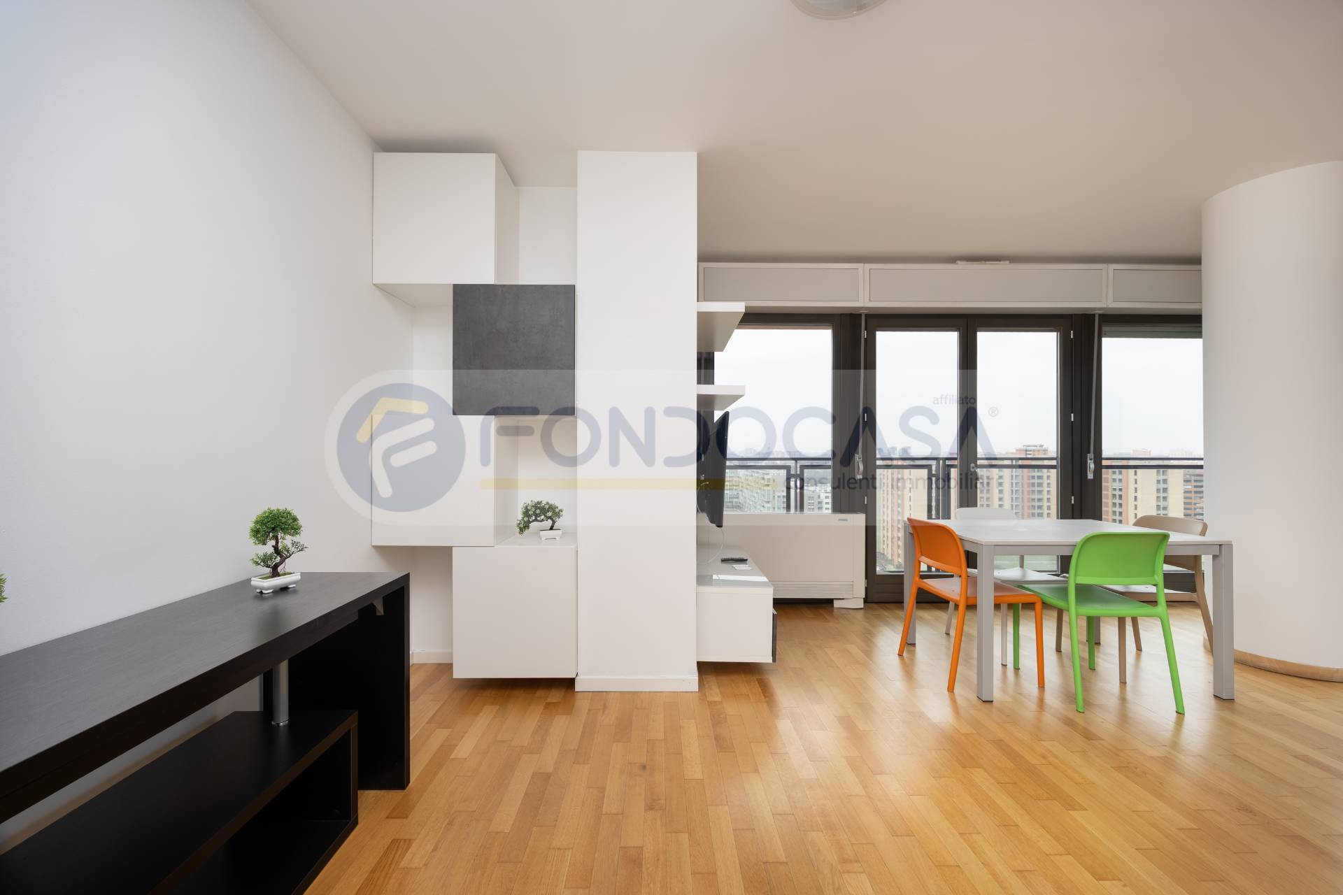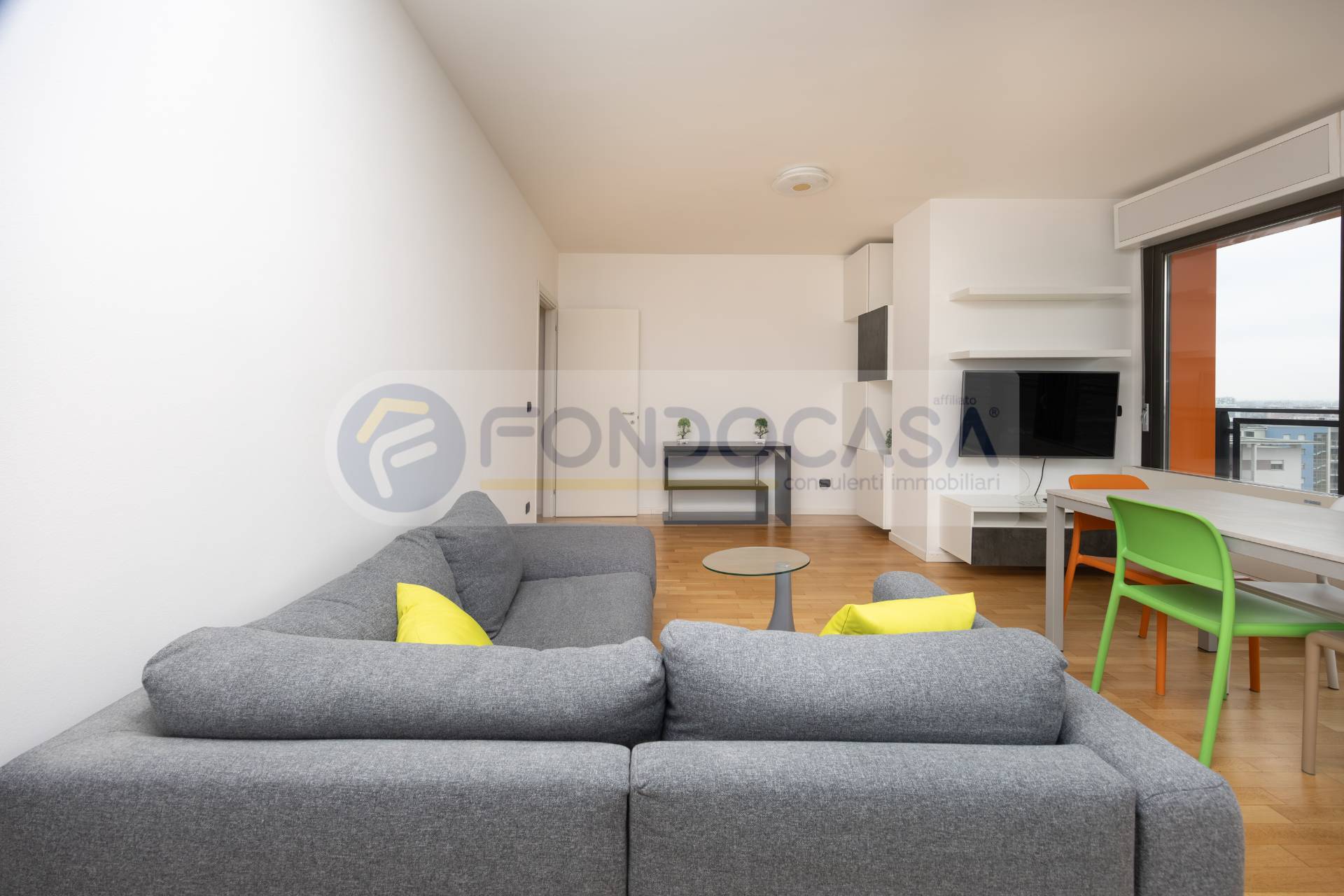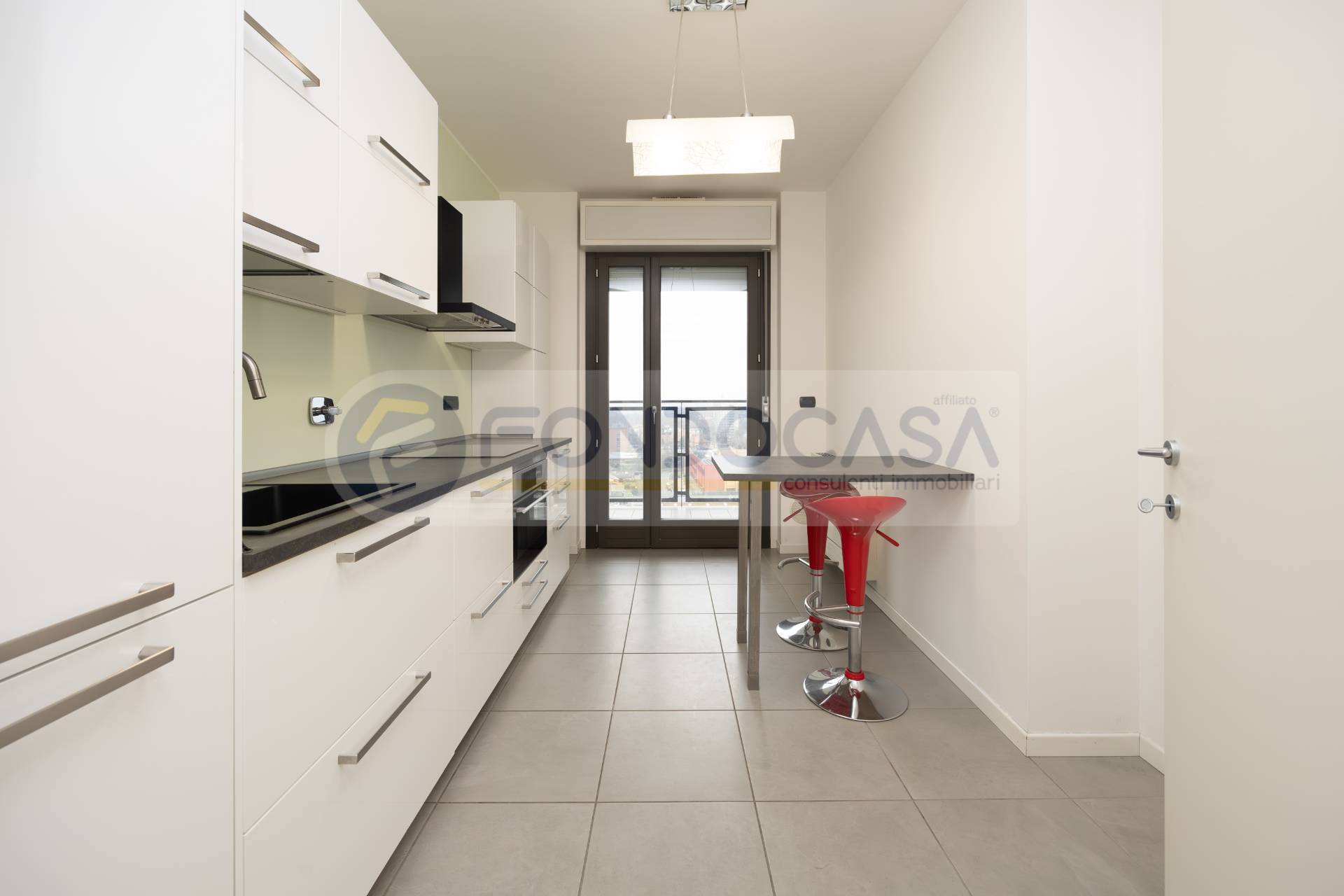Luminosissimo ed ampio bilocale di 86mq, mantenuto in ottimo stato interno, con un bellissimo terrazzo angolare che circonda tutta l'abitazione, permettendo l'accesso da tutte le stanze ed offrendo una vista invidiabile sulla città e sull'arco alpino, a quasi 360 gradi. L'appartamento si sviluppa partendo da un disimpegno d'ingresso, proseguendo verso un'ariosa zona living, caratterizzata da ampie vetrate che consentono di godere di ottima luminosità, affiancata da un'elegante e spaziosa cucina abitabile, una camera da letto matrimoniale di comoda metratura ed infine un bagno finestrato. La disposizione degli spazi interni si presenta molto funzionale, con la possibilità di creare una seconda camera ed impreziosito da un arredamento in ottimo stato, moderno e giovanile.